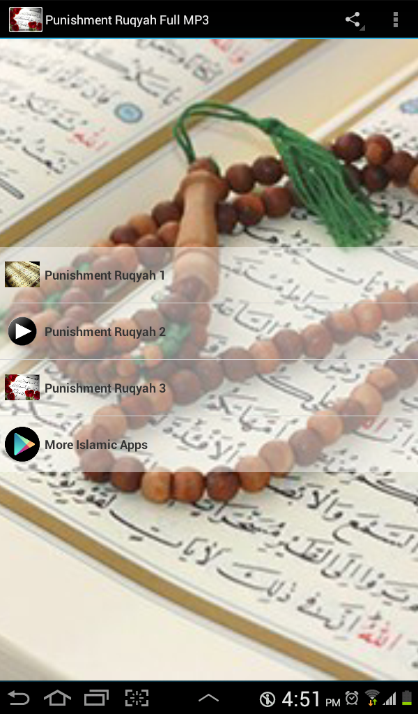 Punishment Ruqyah Full MP3 (Package Name: com.andromo.dev391844.app440521) is developed by KareemTKB and the latest version of Punishment Ruqyah Full MP3 3 was updated on September 26, 2018. Punishment Ruqyah Full MP3 is in the category of Lifestyle. You can check all apps from the developer of Punishment Ruqyah Full MP3 and find 17 alternative apps to Punishment Ruqyah Full MP3 on Android. Currently this app is for free. This app can be downloaded on Android 4.1+ on APKFab or Google Play. All APK/XAPK files on APKFab.com are original and 100% safe with fast download.