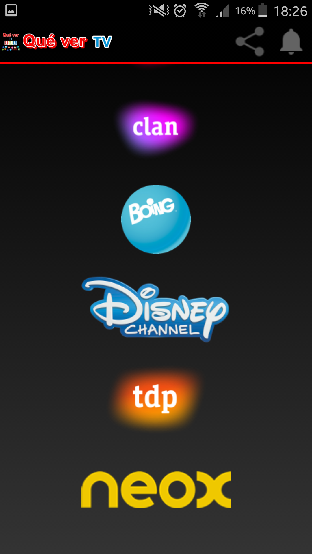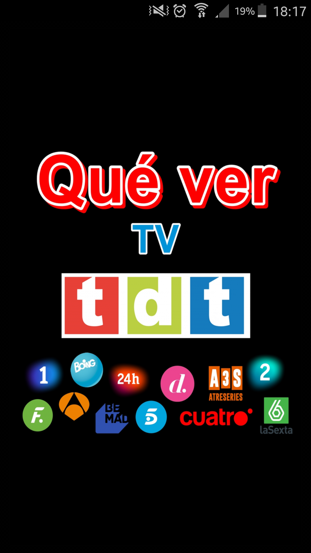 Guía de programación de televisión TDT en España. Todos los canales de TDT en España con su programación actualizada. Sabrás en cada momento que están echando en cualquier canal de televisión. Podrás consultar la programación de cualquier canal para hoy, mañana o pasado mañana. Lista de canales: La 1 La 2 Antena 3 Cuatro Telecinco La Sexta FDF Divinity Canal 24 horas Clan Boing Disney Channel Teledeporte Neox Nova Atres Series Mega Energy Be Mad Paramount Channel Ten DMax DKiss 13 TV Realmadrid TV Iremos actualizando la aplicación con los nuevos canales que vayan saliendo nuevos.