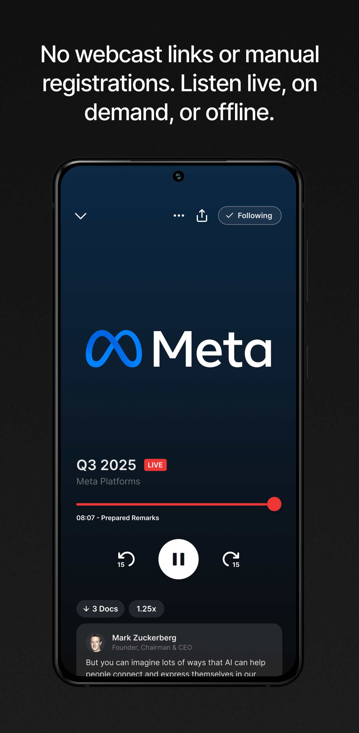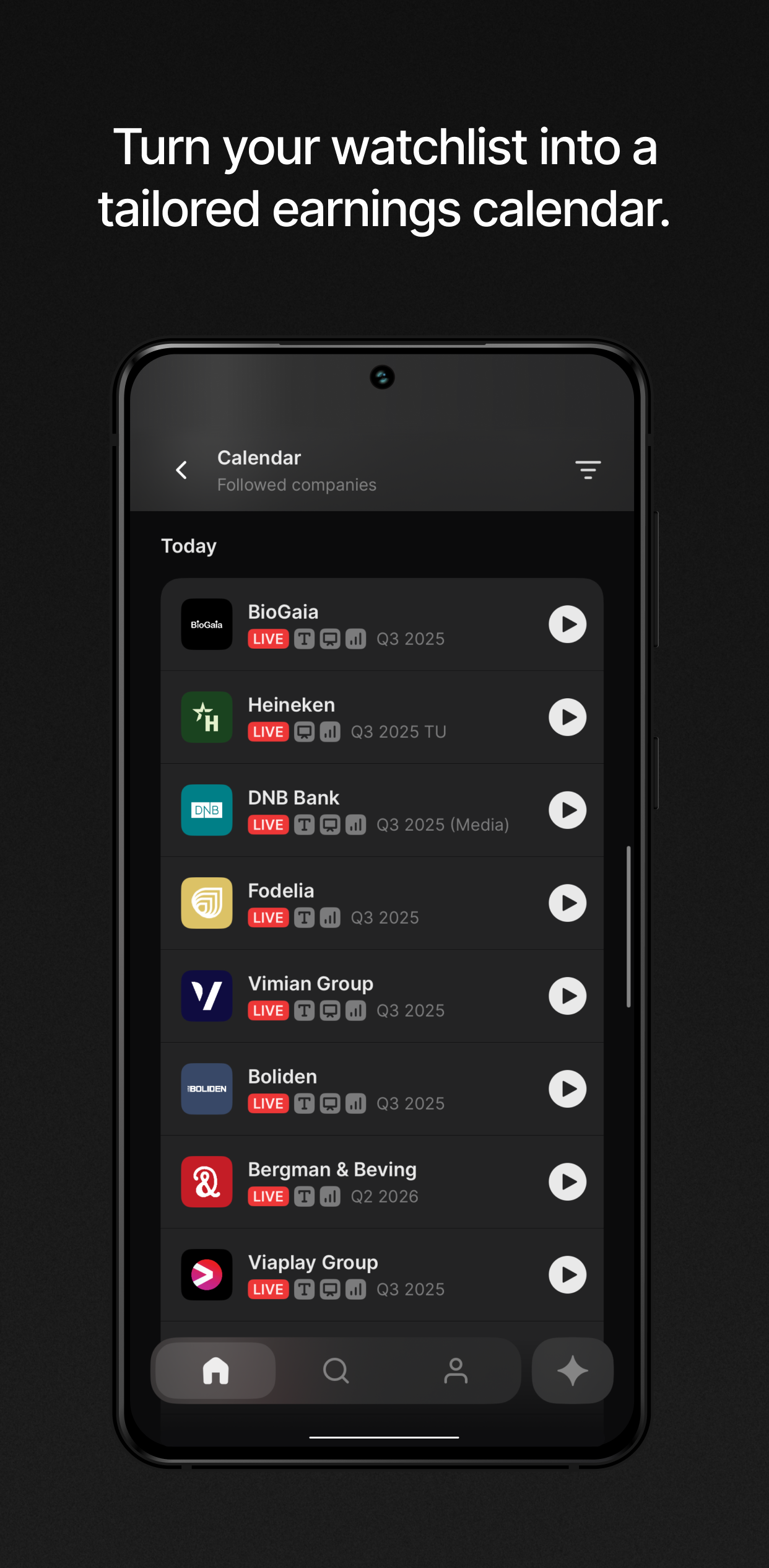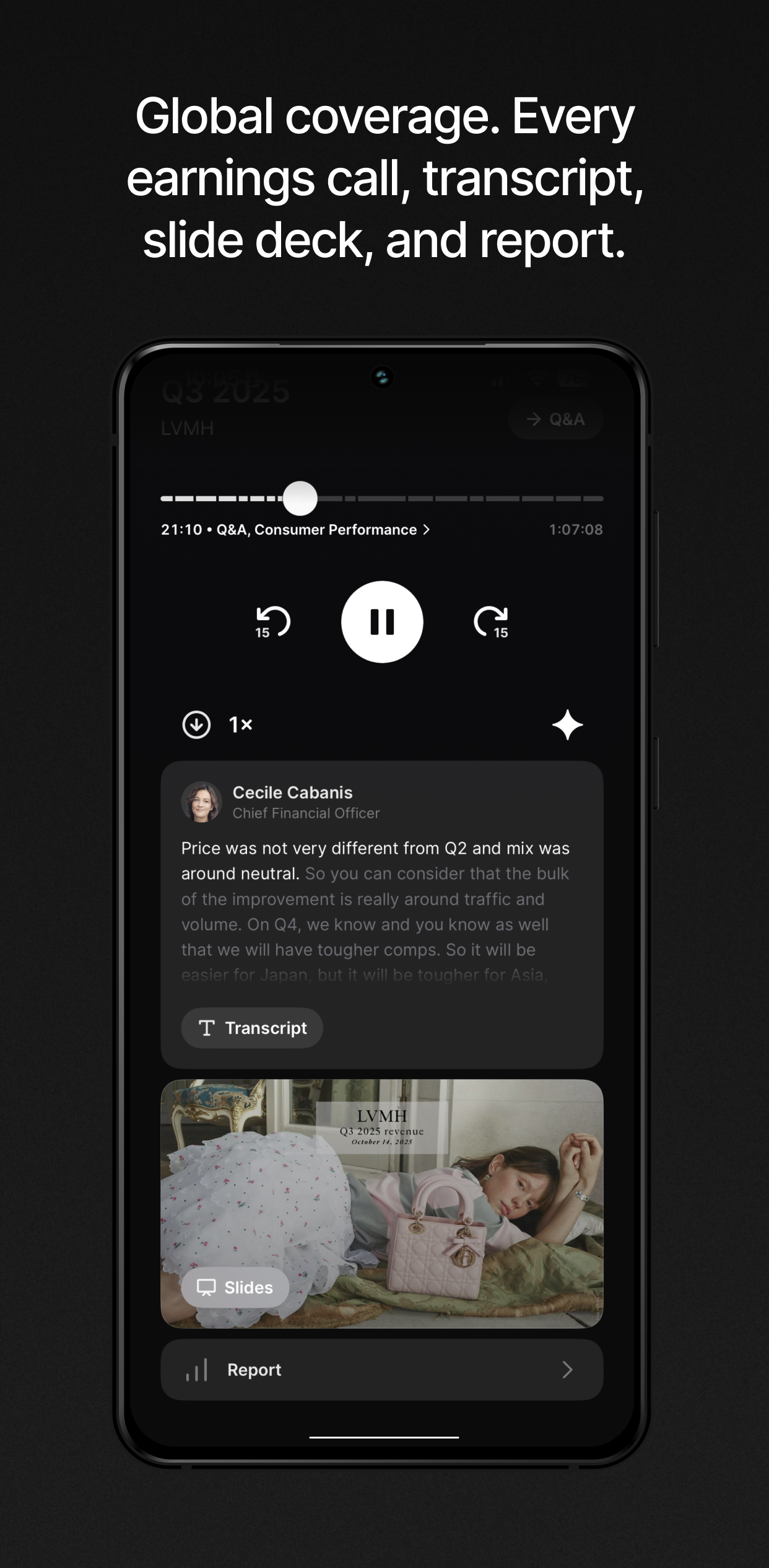 Research anytime, anywhere The #1 app for live earnings calls, AI chat, transcripts, analyst estimates, and more. All for free. Follow the companies that matter to you. Get a personalized feed with real-time updates. No more hunting for webcast links or registering for events manually. Just click and listen. Built for professionals. Loved by everyone. From hedge funds and asset managers to equity analysts and IR teams, Quartr is used daily by financial professionals around the world – whether for stock research or monitoring live events. What our users say: "Quartr is amazing, no way around it. It's the best right now for earnings calls, presentations, and financial reports." – @theshortbear "This is the best mobile app I have for earnings – highly recommended." – @jscherniack "I can't remember the last time an app had such a positive impact on my investment process." – @ankurshah47_ Access: • Live and recorded earnings calls and conferences • All IR material in one powerful AI chat • Searchable transcripts, even during live events • Reports, slides, and press releases • Analyst estimates and financial data Stay up to date: • Tailored notifications for company updates • Keyword alerts • Sync upcoming events to your own calendar • Easily track companies during earnings season Improve productivity: • Find the information you need faster • Follow the companies you're interested in • Search through all transcripts simultaneously • Highlight and store your key findings • See extracted segment data breakdowns • Cross platform sync with Quartr Pro Hear it live. Act with conviction. Quartr delivers global, industry-leading live coverage of company events. Read live transcripts as earnings calls unfold. Find what you need faster: Ask anything across all events and documents from public companies and instantly find what you need. No more manually digging through PDFs and documents. Easily store key findings: With Quartr, capturing important takeaways is as simple as it gets. Even during your lunch run or commute. Your watchlist. Your dashboard. Follow the companies that matter to you. Get a personalized feed with real-time updates, a tailored earnings calendar, and instant alerts when earnings calls go live. Be the first to know: Set keyword alerts for any company, product, or competitor. Get notified the moment they're mentioned, regardless of who's talking about it. Consensus estimates and financials: Access analyst consensus estimates, valuation multiples, and revenue segments split across products, business areas, and geographies. Cross platform sync with Quartr Pro: Your engagement in the products seamlessly syncs between desktop and mobile. X (Twitter): @Quartr_App LinkedIn: Quartr AB