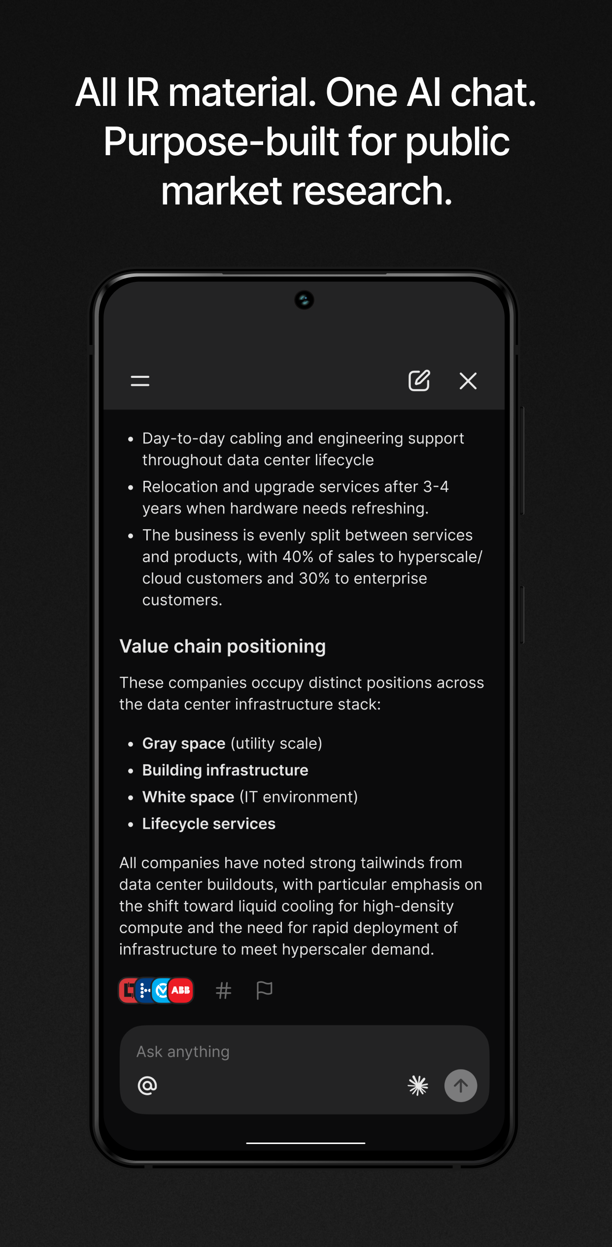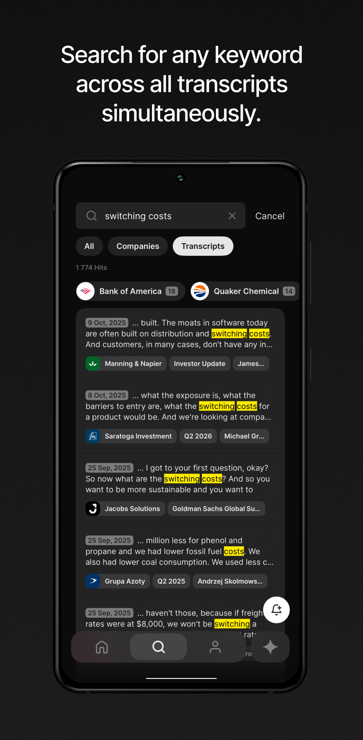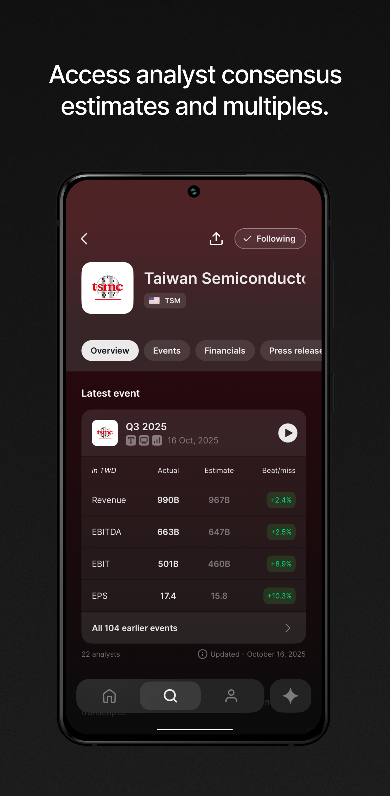 Research anytime, anywhere The #1 app for live earnings calls, AI chat, transcripts, analyst estimates, and more. All for free. Follow the companies that matter to you. Get a personalized feed with real-time updates. No more hunting for webcast links or registering for events manually. Just click and listen. Built for professionals. Loved by everyone. From hedge funds and asset managers to equity analysts and IR teams, Quartr is used daily by financial professionals around the world – whether for stock research or monitoring live events. What our users say: "Quartr is amazing, no way around it. It's the best right now for earnings calls, presentations, and financial reports." – @theshortbear "This is the best mobile app I have for earnings – highly recommended." – @jscherniack "I can't remember the last time an app had such a positive impact on my investment process." – @ankurshah47_ Access: • Live and recorded earnings calls and conferences • All IR material in one powerful AI chat • Searchable transcripts, even during live events • Reports, slides, and press releases • Analyst estimates and financial data Stay up to date: • Tailored notifications for company updates • Keyword alerts • Sync upcoming events to your own calendar • Easily track companies during earnings season Improve productivity: • Find the information you need faster • Follow the companies you're interested in • Search through all transcripts simultaneously • Highlight and store your key findings • See extracted segment data breakdowns • Cross platform sync with Quartr Pro Hear it live. Act with conviction. Quartr delivers global, industry-leading live coverage of company events. Read live transcripts as earnings calls unfold. Find what you need faster: Ask anything across all events and documents from public companies and instantly find what you need. No more manually digging through PDFs and documents. Easily store key findings: With Quartr, capturing important takeaways is as simple as it gets. Even during your lunch run or commute. Your watchlist. Your dashboard. Follow the companies that matter to you. Get a personalized feed with real-time updates, a tailored earnings calendar, and instant alerts when earnings calls go live. Be the first to know: Set keyword alerts for any company, product, or competitor. Get notified the moment they're mentioned, regardless of who's talking about it. Consensus estimates and financials: Access analyst consensus estimates, valuation multiples, and revenue segments split across products, business areas, and geographies. Cross platform sync with Quartr Pro: Your engagement in the products seamlessly syncs between desktop and mobile. X (Twitter): @Quartr_App LinkedIn: Quartr AB
