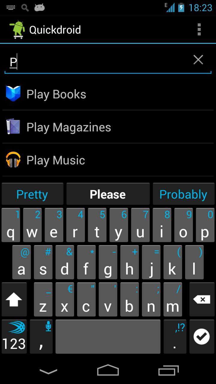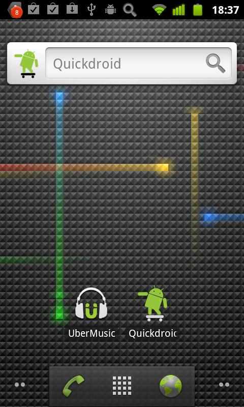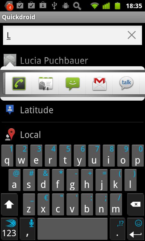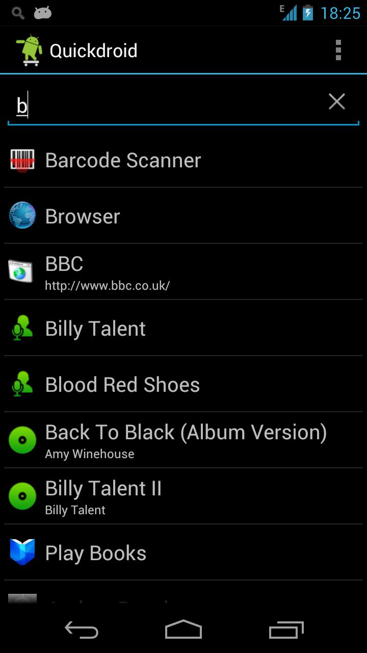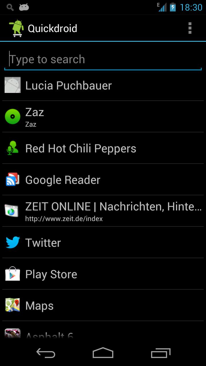 Quickly search, find and launch apps, contacts, bookmarks, artists, albums and songs on your phone - just like Quicksilver, GNOME Do or Launchy do on your computer. Key Features: - Quickly search, find and launch apps, contacts, bookmarks, artists, albums and songs - Learning aptitude: Give the user's favorite items a high ranking within the search results - As fast as Google's search app while providing better search results :-) - Search history for quick access to the most recently used items - Search widget support - ... How to use? - Launch Quickdroid by swiping up from the navigation bar or by long-pressing the search key - The 'Go' key on the soft keyboard, the trackball and the 'Enter' key launch the first suggested item - Flinging over the search input view clears the search text - The first time app sync may take some seconds