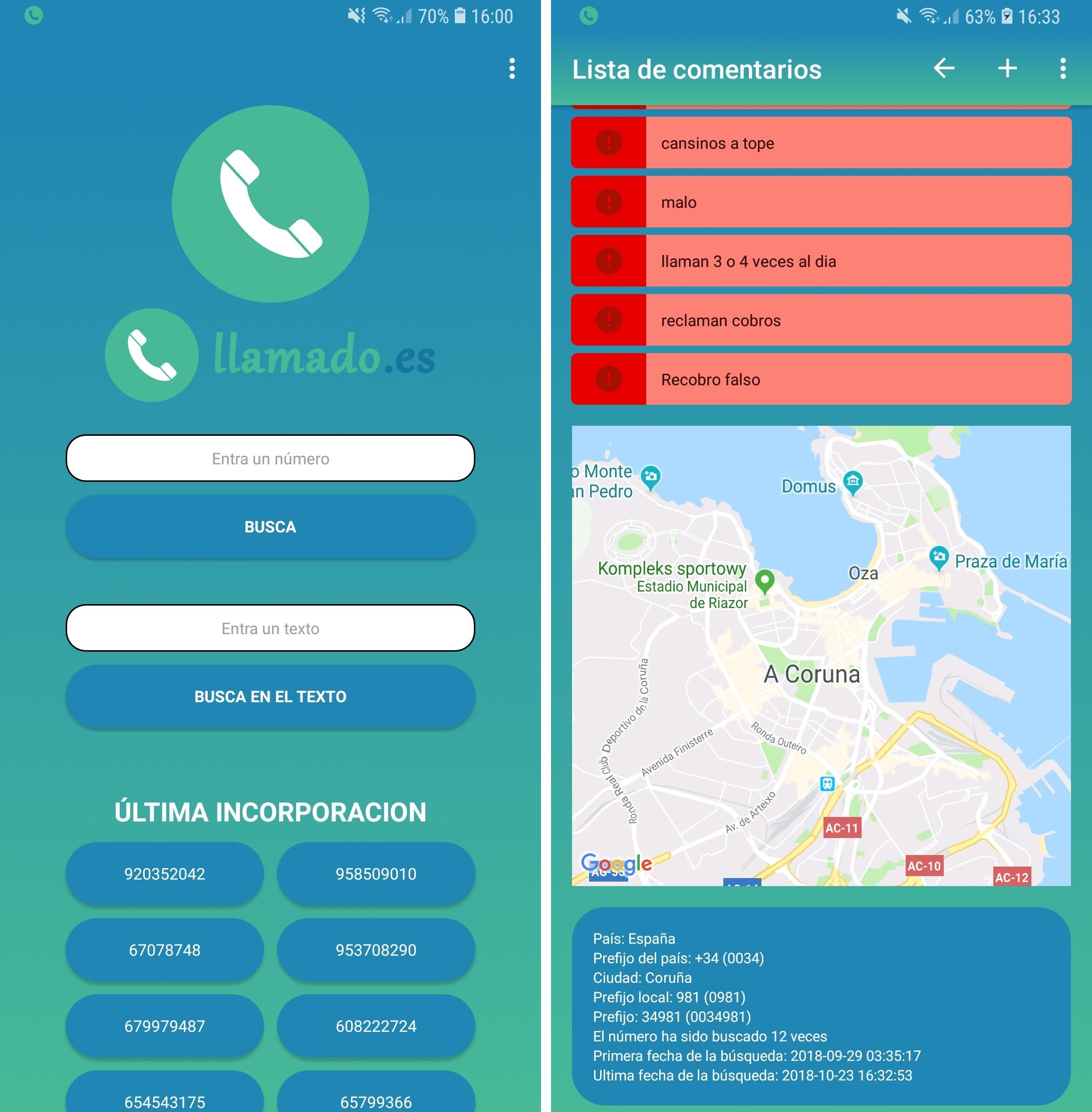 Nuestro servicio www.llamado.es responde a las necesidades de verificar y compartir las opiniones sobre números desconocidos. En nuestra página, se puede encontrar diferentes análisis respecto a un número de teléfono como: diagramas de la frecuencia de buscar ese número, últimas fechas de su búsquda, números parecidos, el número general de las visitas en nuestra página, el número general de las búsquedas de ese número, la inscripción de un número en letras, la cantidad de los comentarios en nuestra base y mucho más. Además, se propone la geolocalización de los números fijos para nuestros utilizarios inluyendo su visualización en el mapa y sobre el terreno via Street View.