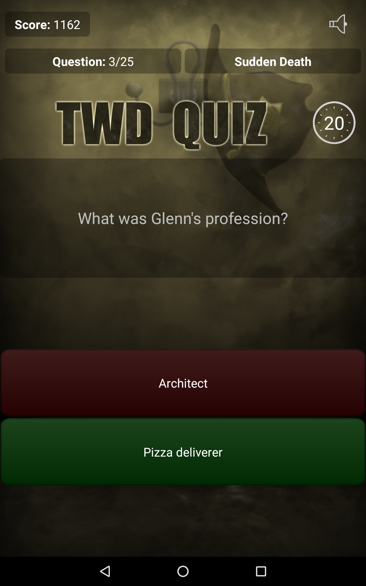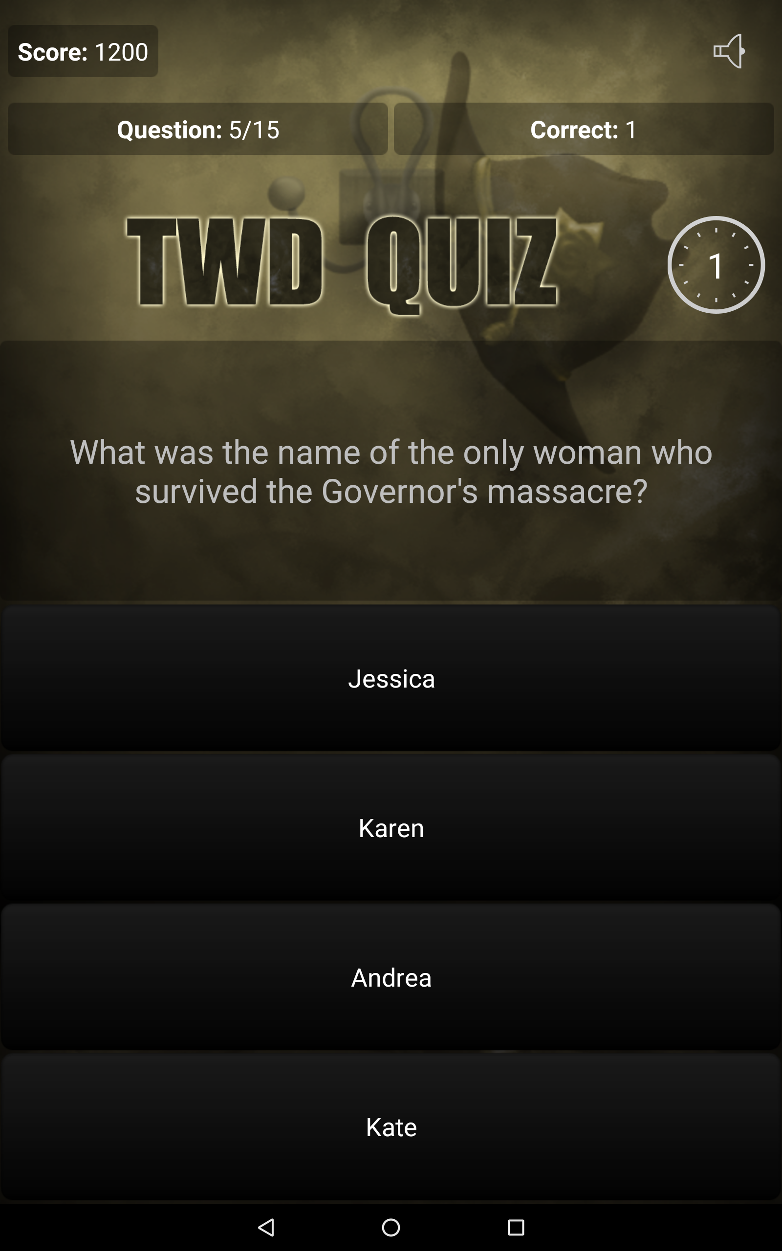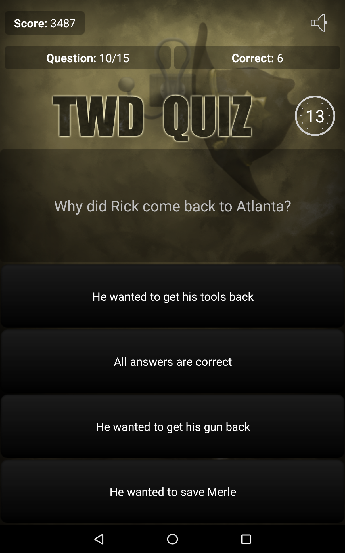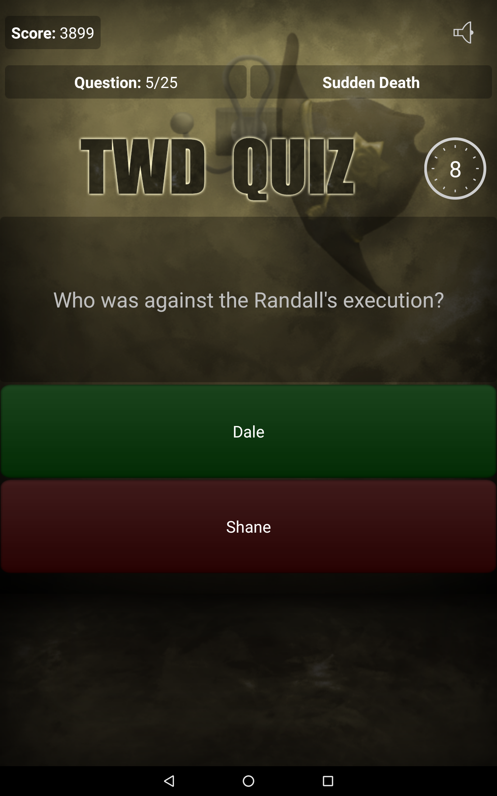 Are you an avid fan of The Walking Dead? Do you think you know everything about Rick Grimes, Daryl Dixon and Michonne? Are you familiar with all series trivia? Test your knowledge with our application, Quiz for The Walking Dead! Answer questions and get the most points! Quiz features: • Over 200 questions, • 3 game modes (Classic, Sudden Death, Time Challenge), • Online scores and achievements - compete with your friends and see which one of you knows The Walking Dead the best! • The opportunity to propose your own question, which, after moderation, may be included in our quiz. Thank you for all the proposals! • The quiz doesn't require an Internet connection to play, • Tablet-optimized UI, • And much, much more! Discover interesting facts and trivia, which you may not have known yet! Do not wait, play Quiz for The Walking Dead today! All intellectual rights belong to their respective owners. The application is unofficial and created for educational purposes.