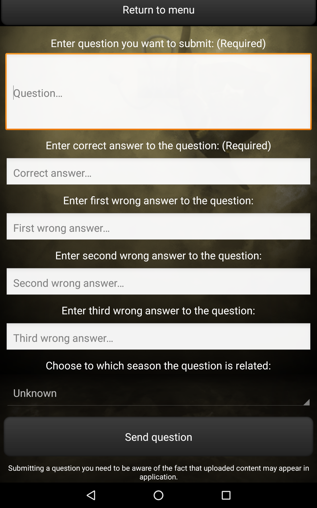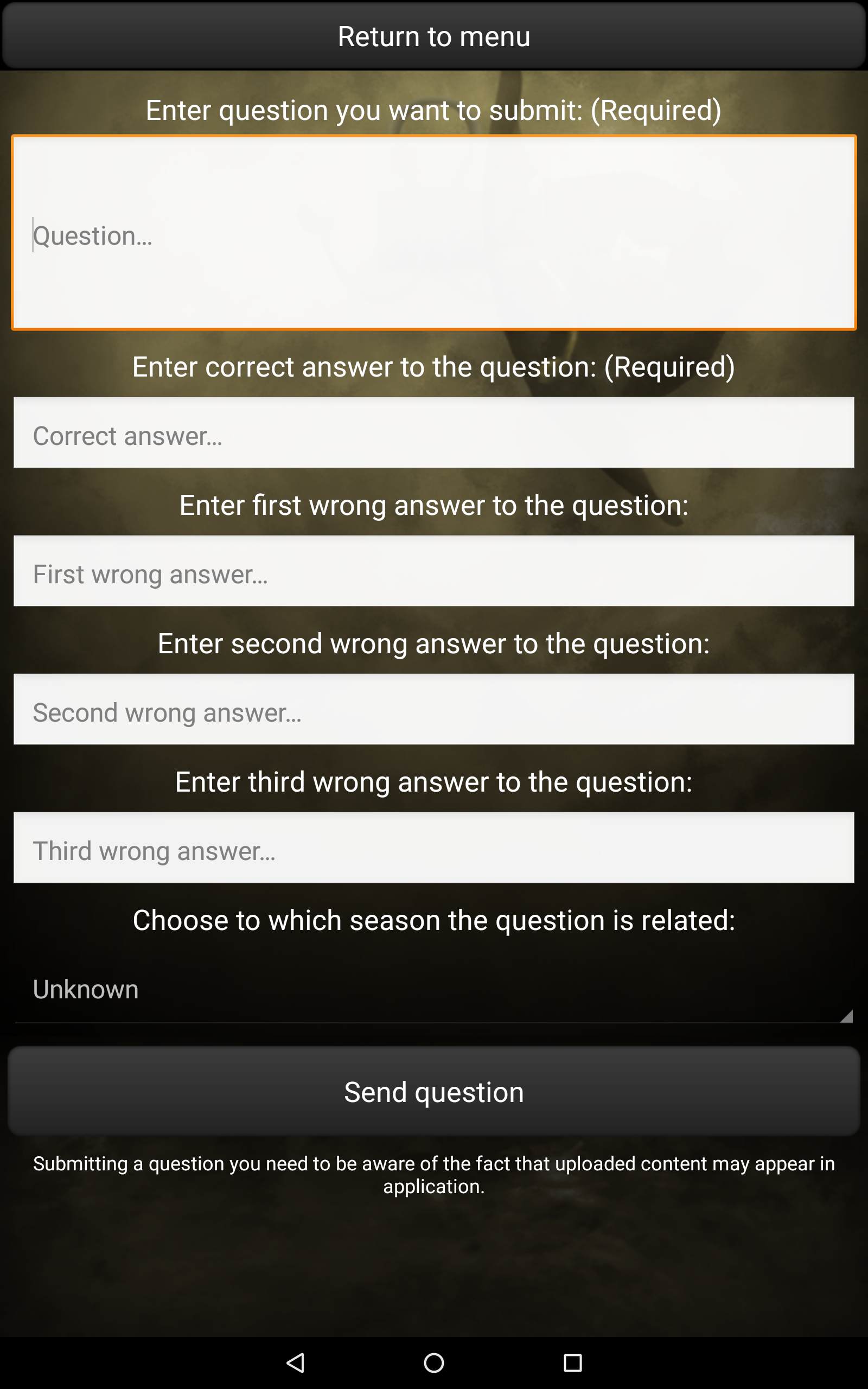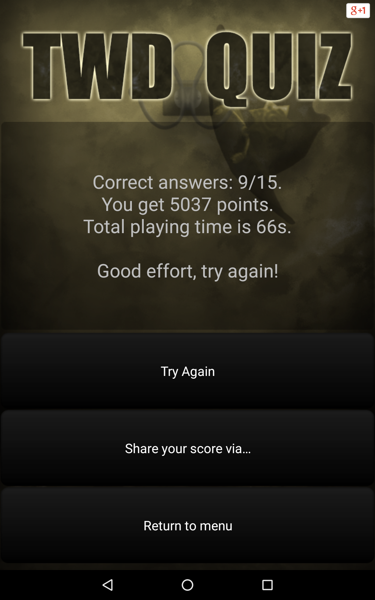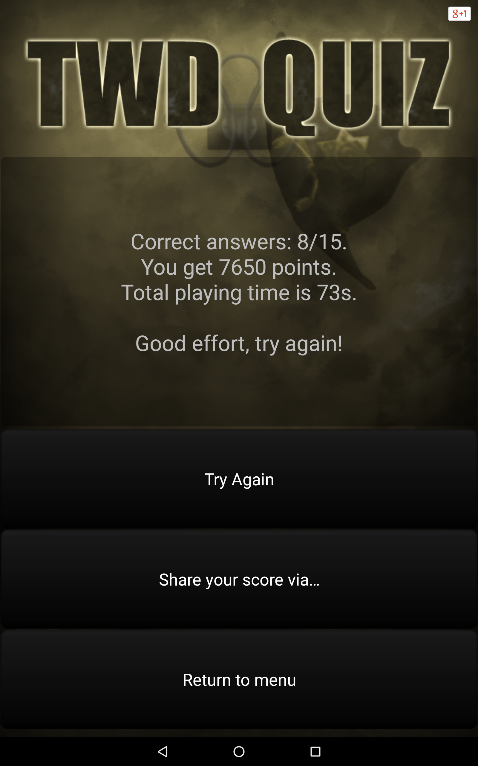 Are you an avid fan of The Walking Dead? Do you think you know everything about Rick Grimes, Daryl Dixon and Michonne? Are you familiar with all series trivia? Test your knowledge with our application, Quiz for The Walking Dead! Answer questions and get the most points! Quiz features: • Over 200 questions, • 3 game modes (Classic, Sudden Death, Time Challenge), • Online scores and achievements - compete with your friends and see which one of you knows The Walking Dead the best! • The opportunity to propose your own question, which, after moderation, may be included in our quiz. Thank you for all the proposals! • The quiz doesn't require an Internet connection to play, • Tablet-optimized UI, • And much, much more! Discover interesting facts and trivia, which you may not have known yet! Do not wait, play Quiz for The Walking Dead today! All intellectual rights belong to their respective owners. The application is unofficial and created for educational purposes.
