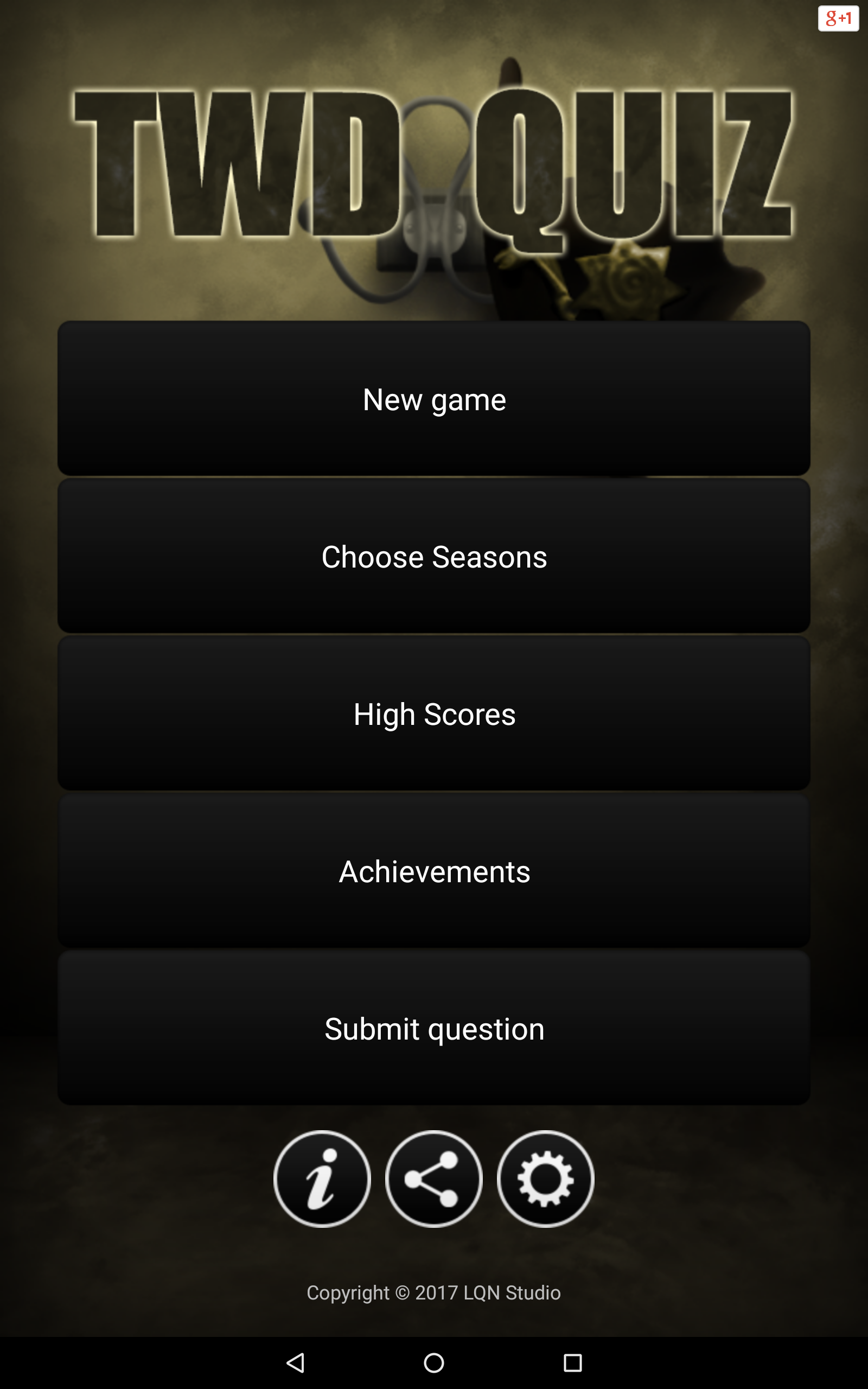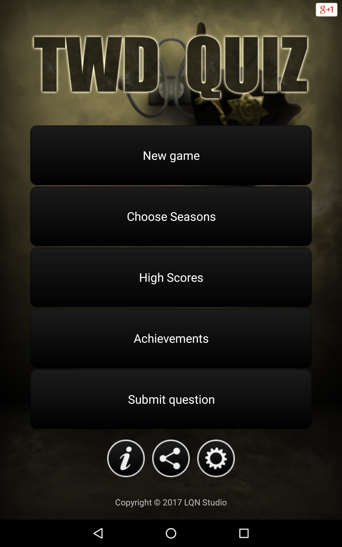 Quiz for The Walking Dead (Package Name: twdq.liquidNitrogen) is developed by LQN Studio and the latest version of Quiz for The Walking Dead 1.1.16 was updated on September 18, 2018. Quiz for The Walking Dead is in the category of Trivia. You can check all apps from the developer of Quiz for The Walking Dead. Currently this app is for free. This app can be downloaded on Android 4.2+ on APKFab or Google Play. All APK/XAPK files on APKFab.com are original and 100% safe with fast download.