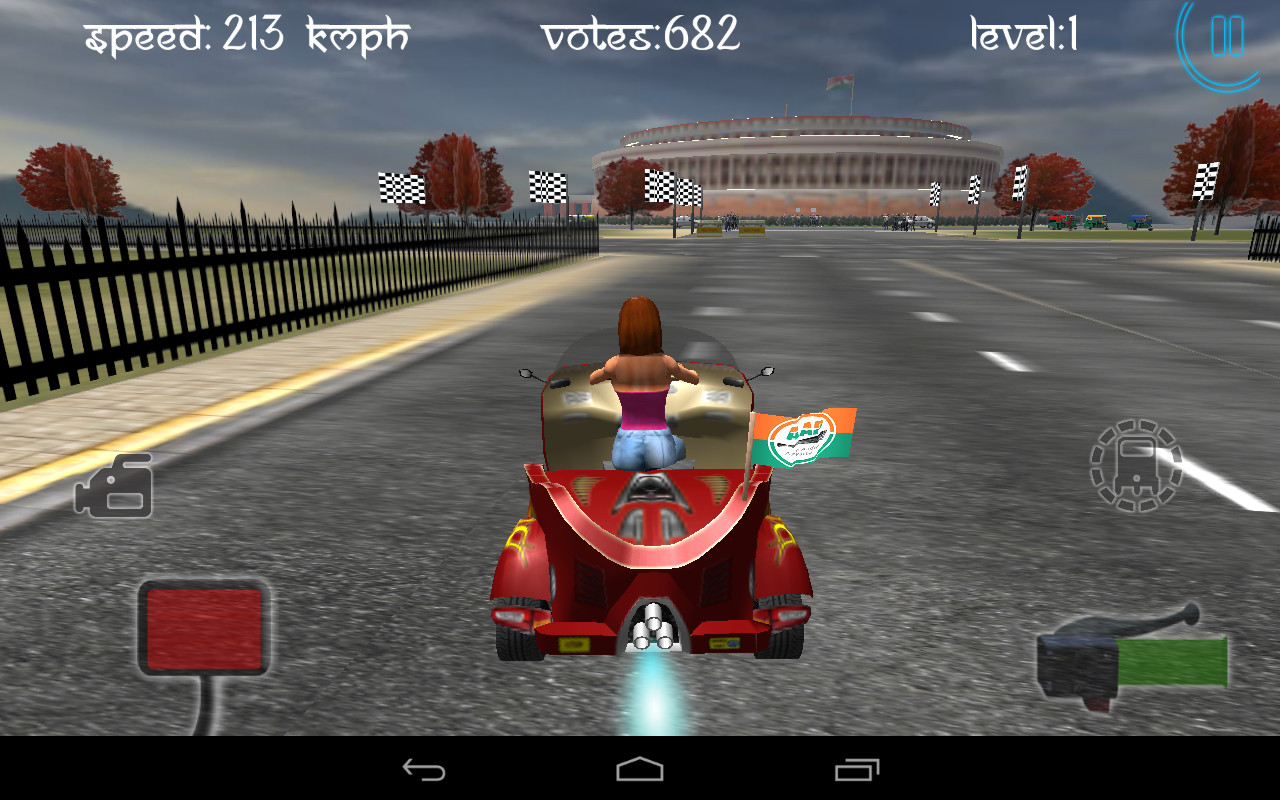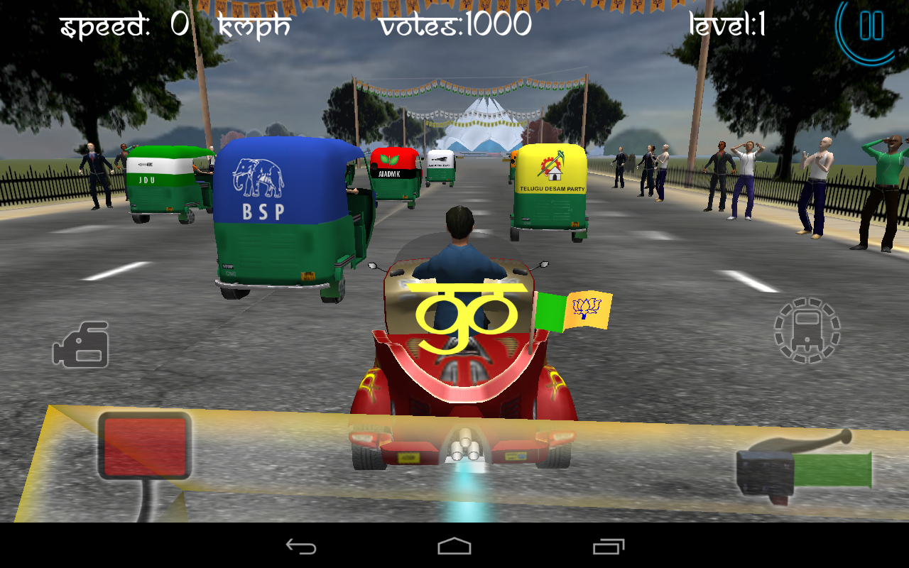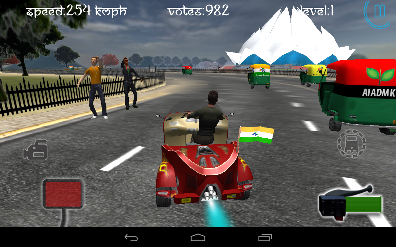 Beat the heat and buckle up, hit the gas and hold on tight.! Show off your driving skill, style and showmanship.! Dare to compete, show your mettle and race on Delhi track. ‘Race City Delhi’ – a highly immerse and quality game. 9 parties … 10 auto-rickshaws … one goal … WIN the RACE. FEEL THE RUSH Burn up the street with exhilarating 3D racing action. Experience the excitement and competition. It’s all about blistering, dizzying speed. DRIVE INCREDIBLE AUTO-RICKSHAW A varied collection of auto rickshaw are cobbled together to form a single globetrotting competition, coupling traditional circuit races with point-to-point cruises through political capital city DELHI along-with occasional drifting challenges. OUTSMART YOUR RIVALS This game seeks your optimal concentration to surpass your opponent. But beware. Your rivals can distract you from getting ahead of them. CONCENTRATE ON TARGET You have to reach Parliament to stake to form new government. Stellar features of the game: ★ Racing mode combined with stunning 3D graphics and 3D Real Time rendering ★ Sophisticated yet truly realistic driving auto-rickshaw models with their favorite political party emblem imprinted on them. ★ Carefully designed 8 levels of difficulties with accessible and intuitive controls ★ Touch or tilt to steer, as you experience state-of-the-art handling ★ Simple and effective controls ★ Restore option lets you recover after a gruesome crash or botched turn ★ Pick your favorite political party bearing their election emblem and auto-rickshaw driver ★ Enjoy High action camera mode ★ Submit the score and compete in world rankings through leader-board Attention! The speed will be your ally, only if you master! Be the first to know! Get all information about RCD, its new upcoming updates, powerful features, tips & more… FOLLOW US: https://twitter.com/GamesMango LIKE US: http://goo.gl/jJtpph