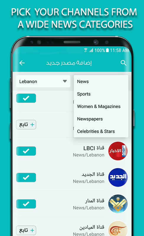 ✓ Follow/Unfollow your Lebanon and Syria news channels from various topics, including: Celebrities gossips, sports, websites, women, cooking, fashion, technology