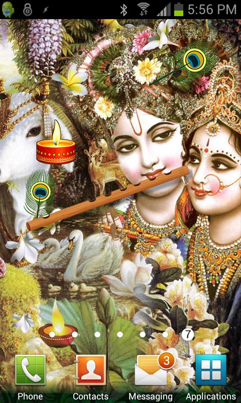 This is a beautiful high quality live wallpaper of Shri Krishna and Radha. It features Lord Krishna & Radha with his cow, shower of animated leaves, flowers, flutes and diyas. Shri Krishna is the soul of Radha and Radha is definitely the soul of Shri Krishna. The relationship of Radha and Krishna is the embodiment of love, passion and devotion. Radha's passion for Krishna symbolizes the soul's intense longing and willingness for the ultimate unification with God. She is the undivided form of Shri Krishna. She will remain a mystery unless one can know her inexpressible divine elements. She is worshiper as well as his deity to be worshiped. She being a beloved of Shri Krishna is known as "Radhika". The whole universe material and spiritual is the creation of Shri Radha - Krishna. Shri Radha is the presiding Goddess of Shri Krishna. The Paramatma - supreme Lord - is subservient to her. In her absence Shri Krishna does not exist. Krishna was born on the day, which was the 8th phase of the moon (Ashtami) and Janma means “birth”, the day when He was born is called Janamashtami. Krishna’s birthday is called by different names such as Janmashtami, Sri Krishna Jayanthi, Gokulashtami and the likes, since Krishna was born on the 8th day of the increasing phase of the moon, which in the Indian Calendar System is called Ashtami. The word Ashtami is etymologically similar to Octa in Greek, from which comes the word ‘eight’ in English. Radha is recognized as the loveliest of all the cowgirls. She was the wife of Ayana and the daughter of the cowherd Vrishabhanu and his wife, Kamalavati. Radha was a childhood friend and soulmate of Krishna and the two were inseparable as playmates and later as lovers. Theirs was a love hidden from society, given Radha's status of a married woman. They had their moments of love, passion and anger - just like any two lovers in love and yet their love could not stand the test of duty that Krishna had to face. Shri Krishna had to leave Vrindavan, and Radha, to ensure that the ideals of truth and justice were established but in the process had to let down the ideal of personal love. He became a king, defeated innumerable enemies and even married a number of times. And yet it is said Radha kept waiting for him to come back to her. Her love for Krishna is considered so divine and so pure that Radha herself obtained the status of a deity, with her name being inseparably linked to that of Krishna. Most of Krishna's images are considered complete when Radha stands by his side. Brajbhoomi where Lord Krishna was born comprises the twin cities of Mathura and Vrindavan. It is not just a sacred land where Lord Krishna was born and performed His cosmic leela, but a place full of divine reminiscences. It was here that He ultimately found Radha, His inseparable companion. Vrindavan, 15 km from Mathura, was the favorite haunt of the divine couple. Features: 1. High Quality Live wallpaper optimized to save battery. 2. You can hide or unhide moving items, only background will be visible. 3. You can interact with moving items just touch to interact with them. 4. You can choose direction of moving items. 5. You can select speed of moving objects. 6. You can enable or disable interaction with moving objects. 7. You can also enable or disable hit counter in the background. Please note free apps may contain ad which may support us to generate more free live wallpapers and applications for you. Thank you.