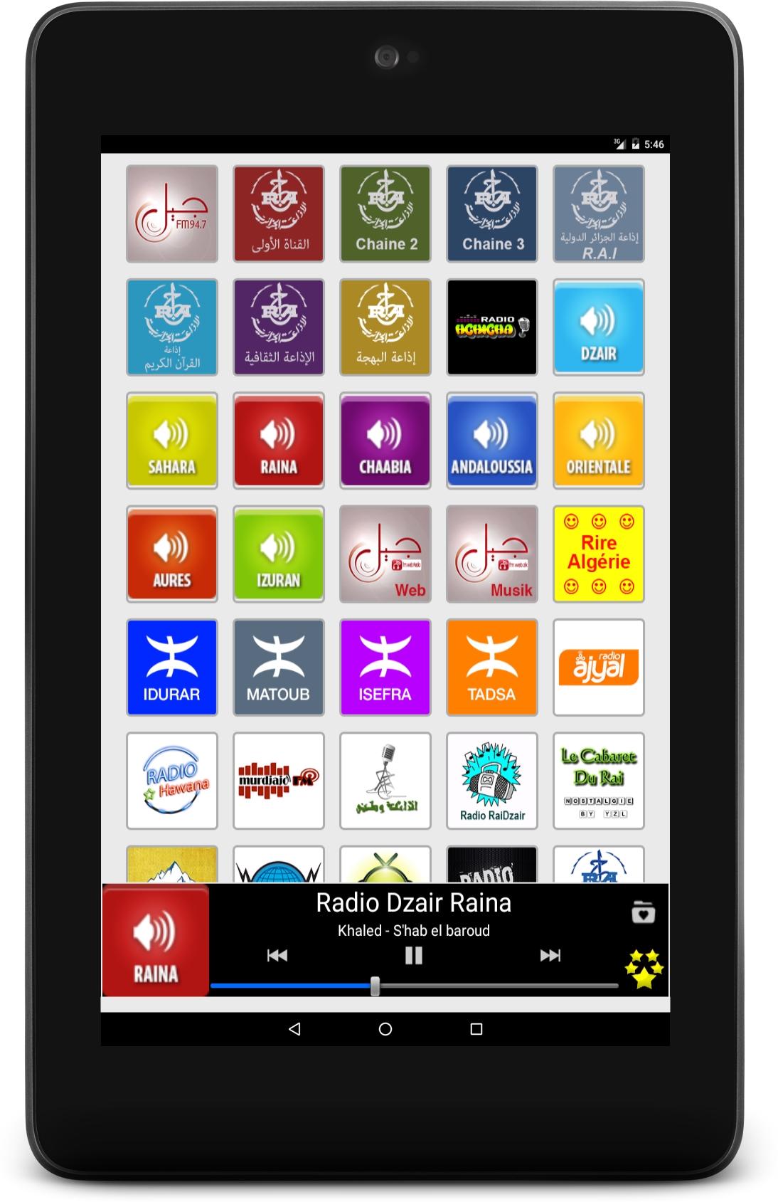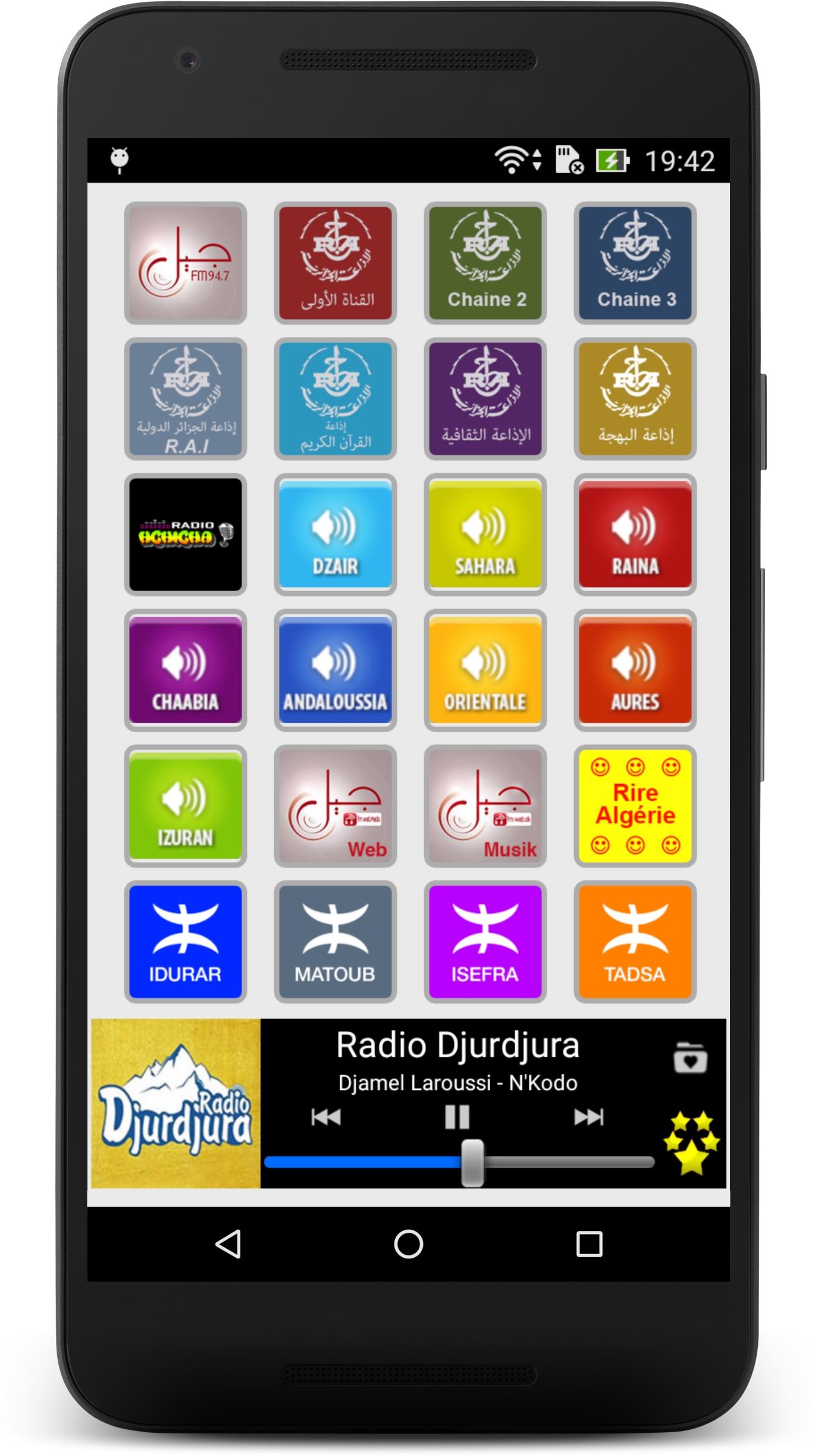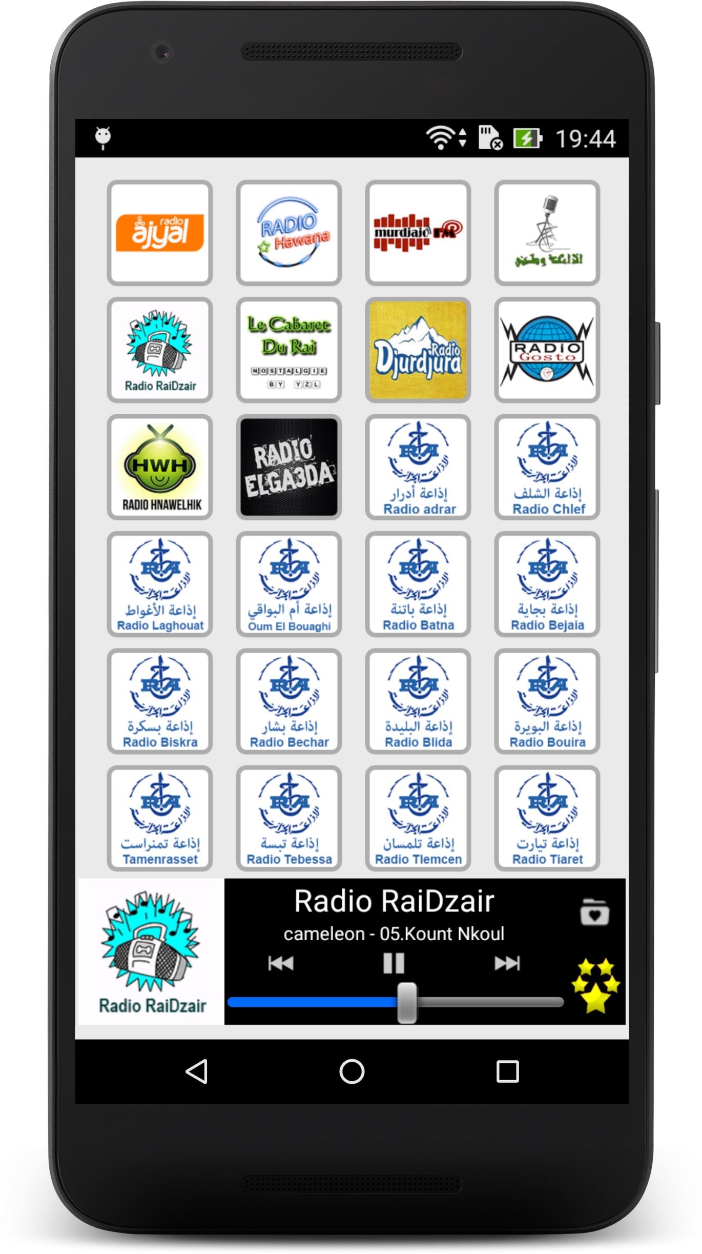 Listen live to your favourite Algerian radio stations and to your preferred program with Radio Algeria. Wherever you are, in Algeria or abroad, at home or in mobility, our application allows you to have easy access to the best and most popular Algerian radio stations. Culture, music, sport, news, humour… you find everything there! Several functionalities are the strength and originality of Radio Algeria: - An extremely simple and intuitive user interface which allows you to select, with a just click, the radio which you want to listen to or to change radio stations in a ultra-fast way. - A wide choice of radios, of any categories, based on the last audience research: • Generalist radio stations: Chaine 1, El Bahdja, Radio Dzair … and their numerous news broadcasts, entertainment programmes or cultural programmes. • Music radio stations: Jil FM Musik, Radio Hchicha , Le Cabaret Du Rai and many others that offer the best of pop, rock, Jazz, Blues, House, Techno, etc. • Sport and news radios stations: Radio Algérie International, Chaine 3… and their fascinating sports, political or economic debates. • Local radio stations: for local news and information (Cities: Alger, Oran, Constantine, Annaba, Blida, Batna, Gafsa, Djelfa, Setif, Sidi Bel Abbes, Bejaia, Tlemcen, El Oued, Skikda …). Radio Algeria is also: - A listening in the background that allows you to do other activities on your Smartphone whilst continuing to listen to your favourite station. - An easy management of your favourites list: you can modify the order of appearance of your radios whenever you feel like it. And you can hide simply and quickly stations that you aren’t interested in. - A daily and continuous follow-up on our part to repair as fast as possible audio streaming dysfunctions. These repairs not require an update of the application. So, no action on your part is required. Our team is dedicated to providing a superior quality of experience for the user. Of course, we remain open to your comments and suggestions. Do not hesitate to leave us a message or an encouragement via Play Store. Below, the available radio stations: - Jil FM - Chaine 1 - Chaine 2 - Chaine 3 - Radio Algérie International - Radio Coran - Radio Culture - El Bahdja - Radio Hchicha - Radio Dzair - Radio Dzair Sahara - Radio Dzair Raina - Radio Dzair Chaabia - Radio Dzair Andaloussia - Radio Dzair Orientale - Radio Dzair Autres - Radio Dzair Izuran - Jil FM Web - Jil FM Musik - Radio Rire Algérie - Radio Idurar - Matoub Idurar - Isefra Idurar - Tadsa Idurar - Radio Ajyal - Radio Hawana - Murdjajo FM - Radio Watani - Radio RaiDzair - Le Cabaret Du Rai - Radio Djurdjura - Radio Gosto - Radio Hnawelhik - Radio Elga3da - Radio Adrar - Radio Chlef - Radio Laghouat - Radio Oum El Bouaghi - Radio Batna - Radio Bejaia - Radio Biskra - Radio Bechar - Radio Blida - Radio Bouira - Radio Tamenrasset - Radio Tebessa - Radio Tlemcen - Radio Tiaret - Radio Tizi Ouzou - Radio Djelfa - Radio Jijel - Radio Sétif - Radio Saida - Radio Skikda - Radio Sidi Belabbes - Radio Annaba - Radio Guelma - Radio Constantine - Radio Medea - Radio Mostaganem - Radio Msila - Radio Mascara - Radio Ouargla - Radio Oran - Radio El Bayadh - Radio Illizi - Radio Bordj Bouarreridj - Radio Boumerdes - Radio Eltarf - Radio Tissemsilt - Radio Eloued - Radio Khenchla - Radio Souk Ahras - Radio Tipaza - Radio Mila - Radio Ain Defla - Radio Naama - Radio Ain Temouchent - Radio Ghardaia - Radio Relizane Warning: Radio Algeria requires an Internet connection and depends on the radio broadcast. Some stations can be temporarily unavailable.
