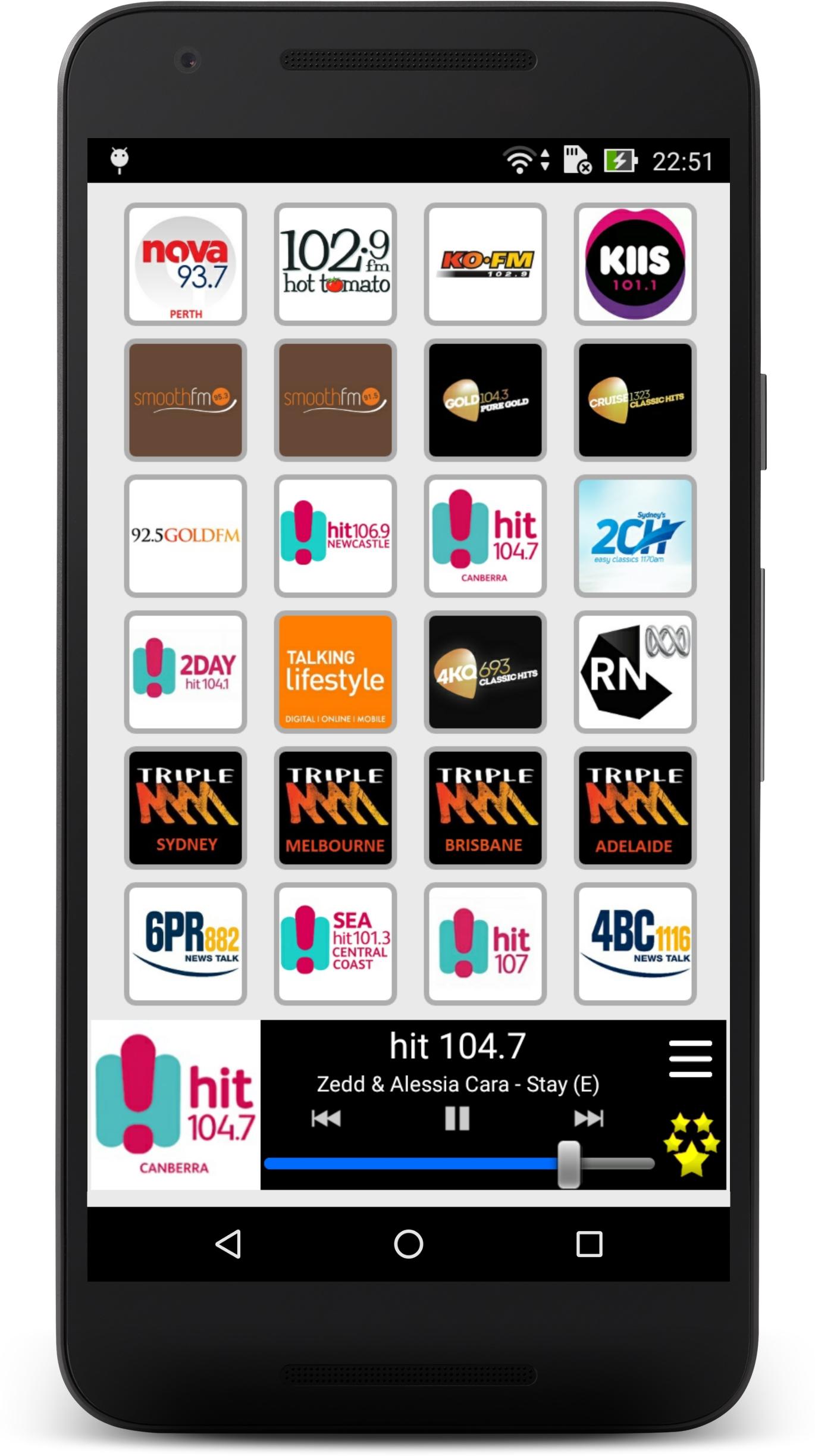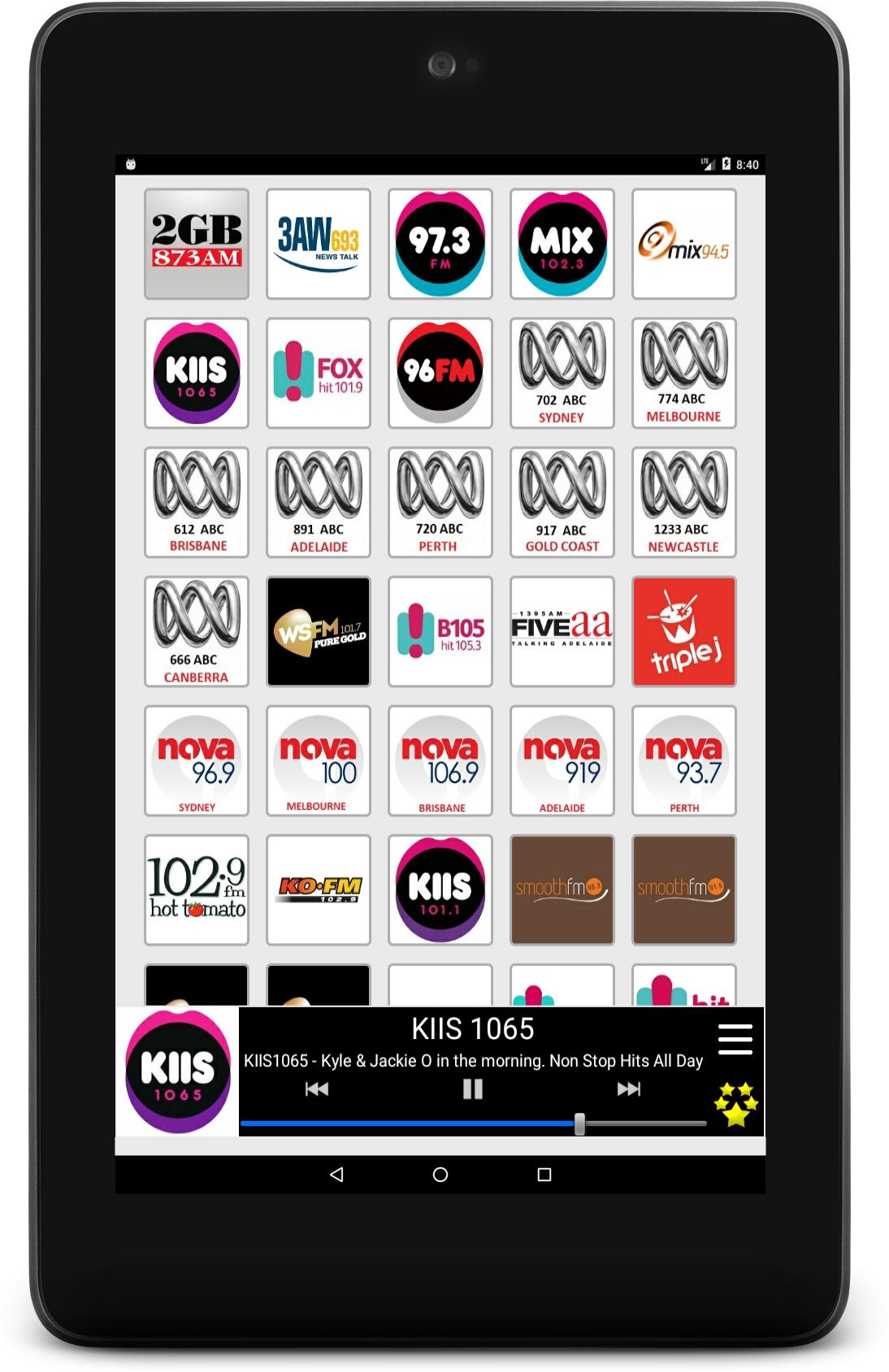 Listen live to your favourite Australian radio stations and to your preferred program with Radio Australia. Wherever you are, in Australia or abroad, at home or in mobility, our application allows you to have easy access to the best and most popular Australian radio stations. Culture, music, sport, news, humour… you find everything there! Several functionalities are the strength and originality of Radio Australia: - An extremely simple and intuitive user interface which allows you to select, with a just click, the radio which you want to listen to or to change radio stations in a ultra-fast way. - A wide choice of radios, of any categories, based on the last audience research: • Generalist radio stations: ABC, Mix 102.3, 97.3 FM … and their numerous news broadcasts, entertainment programmes or cultural programmes. • Music radio stations: Mix 94.5, KIIS 1065, Fox hit 101.9, 96FM and many others that offer the best of pop, rock, Jazz, Blues, House, Techno, etc. • Sport and news radios stations: 3AW, 2GB, 6PR … and their fascinating sports, political or economic debates. • Local radio stations: for local news and information (Cities: Sydney, Melbourne, Brisbane, Adelaide, Perth, Gold Coast, Newcastle, Canberra, Hobart…). Radio Australia is also: - A listening in the background that allows you to do other activities on your Smartphone whilst continuing to listen to your favourite station. - An easy management of your favourites list: you can modify the order of appearance of your radios whenever you feel like it. And you can hide simply and quickly stations that you aren’t interested in. - A daily and continuous follow-up on our part to repair as fast as possible audio streaming dysfunctions. These repairs not require an update of the application. So, no action on your part is required. Our team is dedicated to providing a superior quality of experience for the user. Of course, we remain open to your comments and suggestions. Do not hesitate to leave us a message or an encouragement via Play Store. Below, the available radio stations: - 2GB - 3AW - 97.3 FM - Mix 102.3 - Mix 94.5 - KIIS 1065 - Fox hit 101.9 - 96FM - ABC 702 - ABC 774 - ABC 612 - ABC 891 - ABC 720 - ABC 917 - ABC 1233 - ABC 666 - WSFM - hit 105 - FIVEaa - Triple J - Nova 96.9 - Nova 100 - Nova 106.9 - Nova 91.9 - Nova 93.7 - Hot Tomato - KOFM - KIIS 101.1 - smooth fm 95.3 - smooth fm 91.5 - GOLD 104.3 - Cruise 1323 - GOLD FM - hit 106.9 - hit 104.7 - 2CH - 2DAY hit 104.1 - Macquarie Sports Radio - 4KQ - RN - 2MMM - 3MMM - 4MMM - 5MMM - 6PR - SEA FM - hit 107 - 4BC - hit 92.9 - Mix 106.3 - ABC Local Radio Hobart - ABC Classic FM - 6iX - ABC NewsRadio - SEN 1116 - i98FM - 1494 2AY - 1332 3SH - 1089 3WM - Wave FM 96.5 - 1053 2CA Canberra - 2CC Canberra - MIXX FM 101.3 - MIXX FM 107.7 - Star FM - 7HOFM - 2CC Canberra - MIXX FM 101.3 - MIXX FM 107.7 - Star FM - 7HOFM Warning: Radio Australia requires an Internet connection and depends on the radio broadcast. Some stations can be temporarily unavailable.