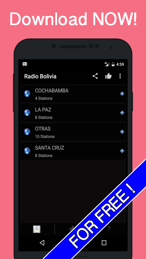 Would you like to be always connected to the best music and all the successes of your favorite musical genres? Now you will always have the latest news, soccer match results and am and fm radio broadcasts live! Radio Bolivia is the live radio application where you'll find the best of Bolivia stations! Stop searching your favorite stations on the internet, with our application, you can listen to all stations in Bolivia. Access all online radio stations, create a list of your favorite radio stations. Listen to all the breaking news. All local and national FM radio stations are available with just one click! And the best thing about our application is that you can listen to the radio unlimited, totally free! Quickly navigate through hundreds of radio stations, search by region for the station you want to listen to. You can search by the name of the station, frequency or by the region of the desired radio. Create lists unlimited, you can put your favorites so you do not have to look for them again. Share with your friends and family through mail, messages, social networks and messaging. Listening to internet radio was never so easy and fast! Enjoy the uninterrupted transmissions of the best Latin pop genres, reggaeton, cumbia, rancheras, electro, electronica, house and techno. Learn to dance your favorite music. Listen to news, sports events, match stories, and enjoy whenever and wherever you want with your friends the classic matches of Bolivia and others! If you like to listen to the radio before going to sleep, now with the new functionality you can program the time to turn off the radio, so you can save battery in the mobile just like the TV Sleep !. This radio app from Bolivia is the fastest of the playstore! We deliver the best radio broadcast without delays or delays! Download radios from Bolivia today! Some of the radios that you can find in this great app of radios of Bolivia are: Mundial Cochabamba 96.7 Radio Clasica 100.3 Radio Estrella 93.1 Radio Fides (Cochabamba) 95.1 Radio Fides (Oruro) 98.3 Radio Maria (Bolivia) 101.9 Radio Mega DJ 89.8 El Sonido de la Vida 89.3 Erbol FM 100.9 FM La Paz 96.7 La Poderosa 100.3 La Red Deportiva 88.5 Melodía FM 99.1 Panamerica Cl`sica 90.7 Audiokiss 90.7 Radio Activa 91.9 Radio Andrés Ibanez (Rai) 97.9 Radio Betania 93.9 Rádio Bolívia 98.3 Radio Catolica Carisma 103.1 Radio Classica FM 106.9 Radio FM Bolivia / Gigante 94.9 Radio Nueva Splendid 1220 Radio Solidaria RKM 90.9 Radio Maria (Bolivia) 106.5 Radio Patria Nueva (La Paz) 94.1 Radio Restauración FM 98.9 Radio Nuevo Tiempo (La Paz) 88.3 Radio Panamericana FM (La Paz) 106.3 Radio Patria Nueva (La Paz) 93.5 Radio San Simon 102.4 Radio Ancoraimes 95.3 Radio Astro 89.5 Radio Chacaltaya 93.7 Radio Doble 8 - D8 88.5 Radio Estelar FM 92.5 Radio Fides (La Paz) 101.3 Radio FM Bolivia 94.9 Radio Fides (La Paz) 98.3 Radio Hit FM 99.1 Radio Integración 90.3 Radio La Tremenda 95.9 and many more! Follow your favorite artists. Install Radio Bolivia, FREE and start enjoying your favorite music in one application! It is without a doubt the best radio application available on the market for Bolivia. *** Characteristics*** 📻Hundreds of stations of Radio am and fm in Direct Create your own favorite radio lists 📻 Live broadcast 24 hours! 📻Time timer to automatically turn off the radio (Sleep Timer) Personalized Custom Volume Control. 📻Takes care the battery of your mobile, low battery consumption. 📻 Listen instantly and immediately! You can listen to Radio Bolivia at the same time that you use other applications on your mobile.