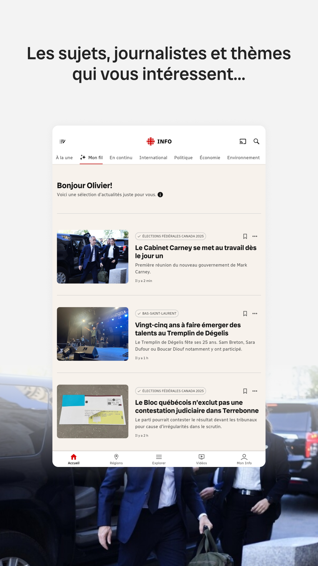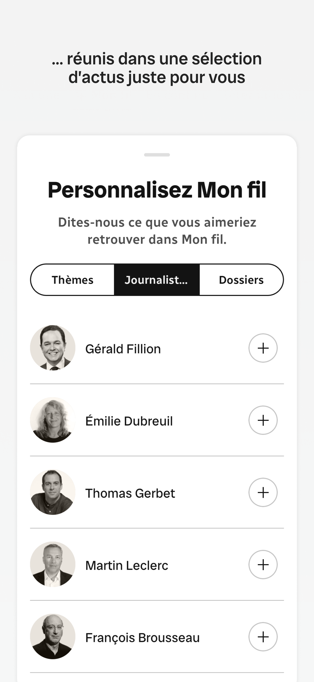 • Explorez Mon fil, une sélection personnalisée d’articles selon ce que vous consultez, ainsi que les journalistes, sujets ou dossiers ajoutés à vos suivis.