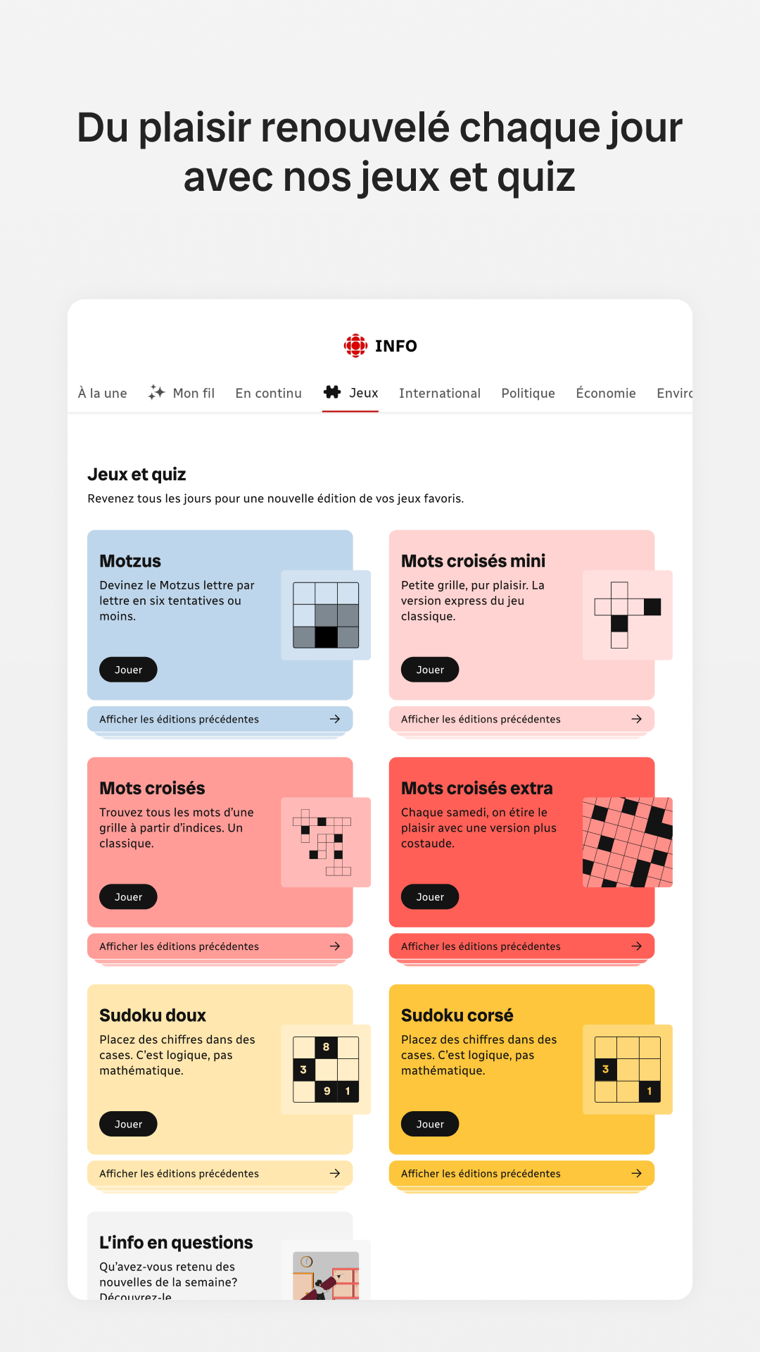 • Faites travailler vos méninges entre deux nouvelles avec nos quiz et jeux renouvelés chaque jour. Au menu : Motzus (la version radio-canadienne du « mot du jour »), mots croisés mini, standard et extra, et sudokus en modes doux et corsé.