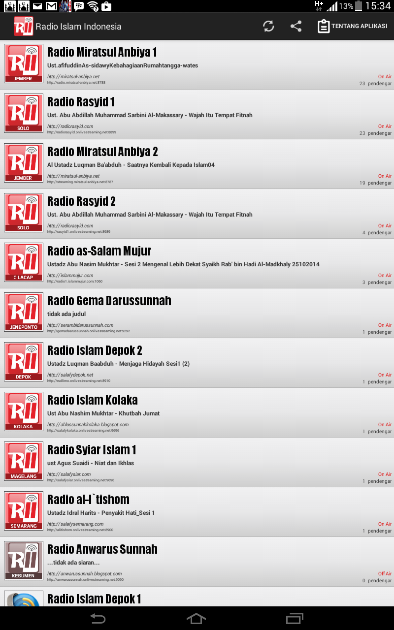 Radio Islam Indonesia is an app collecting several online streaming islamic radios which base their broadcasted lessons on al-Qur'an and As-sunnah, in Arabic language and Bahasa Indonesia.
