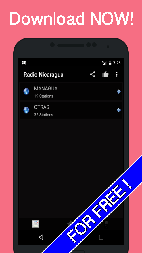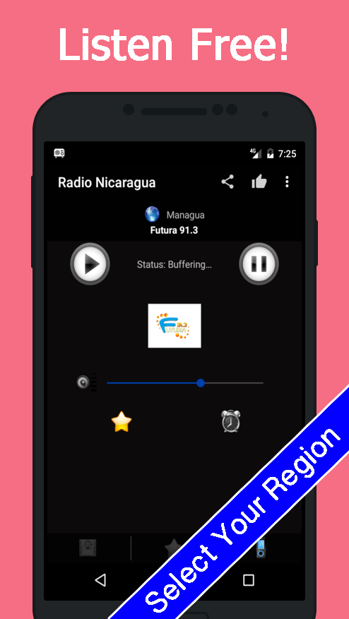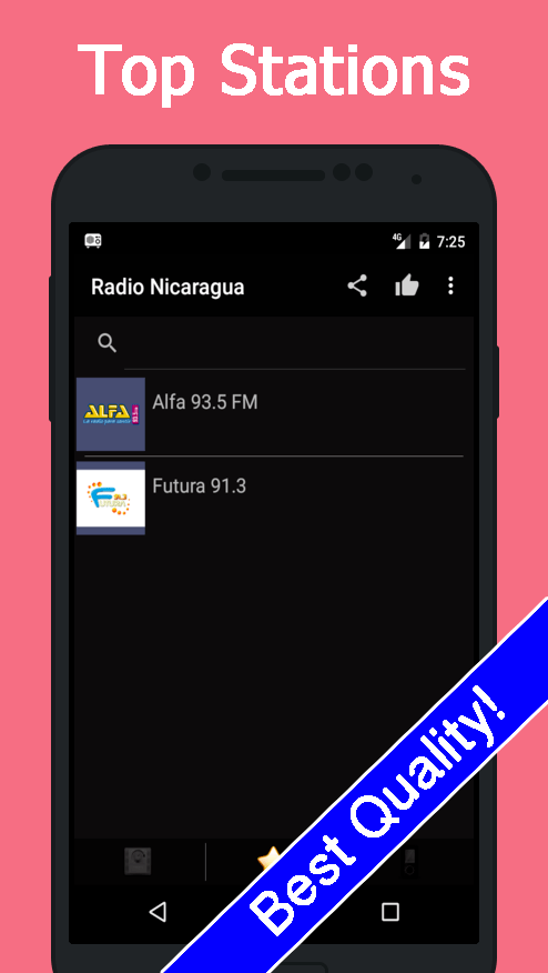 Would you like to be always connected to the best music and all the successes of your favorite musical genres? Now you will always have the latest news, soccer match results and am and fm radio broadcasts live! Radio Nicaragua is the live radio application where you'll find the best of Nicaragua stations! Stop searching your favorite stations on the internet, with our application, you can listen to all stations in Nicaragua. Access all online radio stations, create a list of your favorite radio stations. Listen to all the breaking news. All local and national FM radio stations are available with just one click! And the best thing about our application is that you can listen to the radio unlimited, totally free! Quickly navigate through hundreds of radio stations, search by region for the station you want to listen to. You can search by the name of the station, frequency or by the region of the desired radio. Create lists unlimited, you can put your favorites so you do not have to look for them again. Share with your friends and family through mail, messages, social networks and messaging. Listening to internet radio was never so easy and fast! Enjoy the uninterrupted transmissions of the best Latin pop genres, reggaeton, cumbia, rancheras, electro, electronica, house and techno. Learn to dance your favorite music. Listen to news, sports events, match stories, and enjoy whenever and wherever you want with your friends the classic matches of Nicaragua and others! If you like to listen to the radio before going to sleep, now with the new functionality you can program the time to turn off the radio, so you can save battery in the mobile just like the TV Sleep !. This radio app from Nicaragua is the fastest of the playstore! We deliver the best radio broadcast without delays or delays! Download radios from Nicaragua today! Some of the radios that you can find in this great app of radios of Nicaragua are: Advent Stereo 92.7 Alfa 93.5 FM Amante FM 96.3 Clasica 101.9 FM Favorita FM 92.9 Futura 91.3 Joya FM 103.9 Radio Maranatha 103.5 Radio Uraccan Rosita 94.5 Radio Maria (Nicaragua) 99.9 Oxigeno FM 94.5 Radio Corporacion 540 Radio La Sandino AM 740 Radio La Pachanguera 95.1 La Marka 90.9 La Nueva Radio Ya 600 La Picosa 97.9 FM La Tuani 100.3 Levantate el show 95.1 fm Lite FM 107.1 Radio Managua 670 Suprema 106.3 Radio Estrella del Mar 104.3 Radio La Sandino FM 107.5 Radio Faro Celestial 106.9 Radio 580 Radio ABC Stereo 99.7 Radio Estereo Fe! 100.8 Fm Radio Hit 104.7 FM La Buenisima 93.1 La Mega Nicaragua 94.1 Radio Mi Favorita 98.5 Radio Tigre 93.9 Radio ELE 95.3 Fm Radio Juvenil 101.5 Radio La Primerisima 91.7 Radio Stereo Rica Nicaragua 105.9 Radio Pirata 99.9 Radio Nuevo Tiempo 98.9 Radio Ondas de Luz 94.3 Radio Tropicalida 89.9 Viva FM 98.3 Radio Activa 101.1 FM Radio Stereo Ritmo 104.1 Radio Nuevo Tiempo S.A. 103.3 Stereo Apante 94.9 Radio Caribbean Soul 90.7 Radio Restauracion 107.9 La Costenisima 101.3 and many more! Follow your favorite artists. Install Radio Nicaragua, FREE and start enjoying your favorite music in one application! It is without a doubt the best radio application available on the market for Nicaragua. *** Characteristics*** 📻Hundreds of stations of Radio am and fm in Direct Create your own favorite radio lists 📻 Live broadcast 24 hours! 📻Time timer to automatically turn off the radio (Sleep Timer) Personalized Custom Volume Control. 📻Takes care the battery of your mobile, low battery consumption. 📻 Listen instantly and immediately! You can listen to Radio Nicaragua at the same time that you use other applications on your mobile.