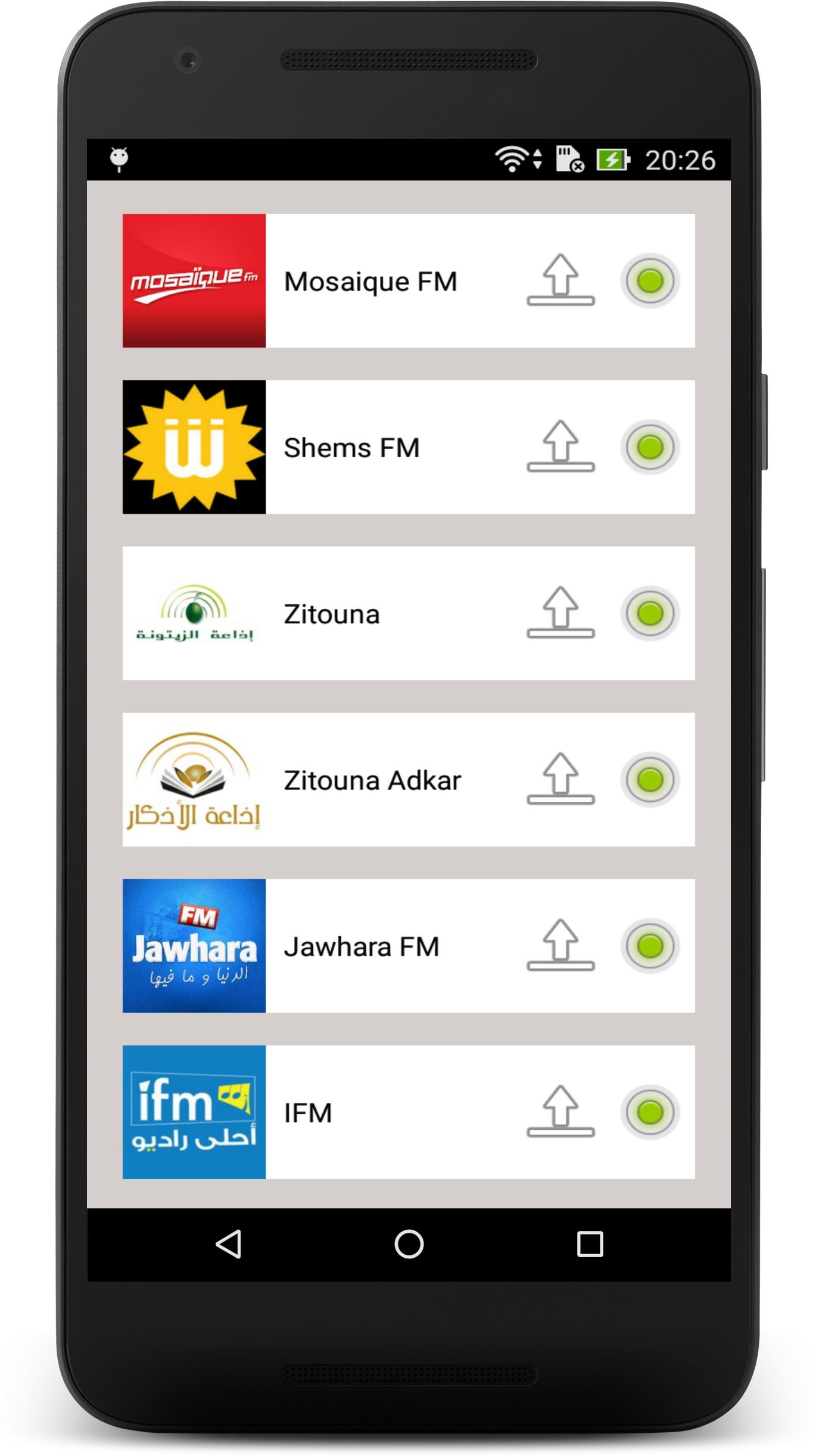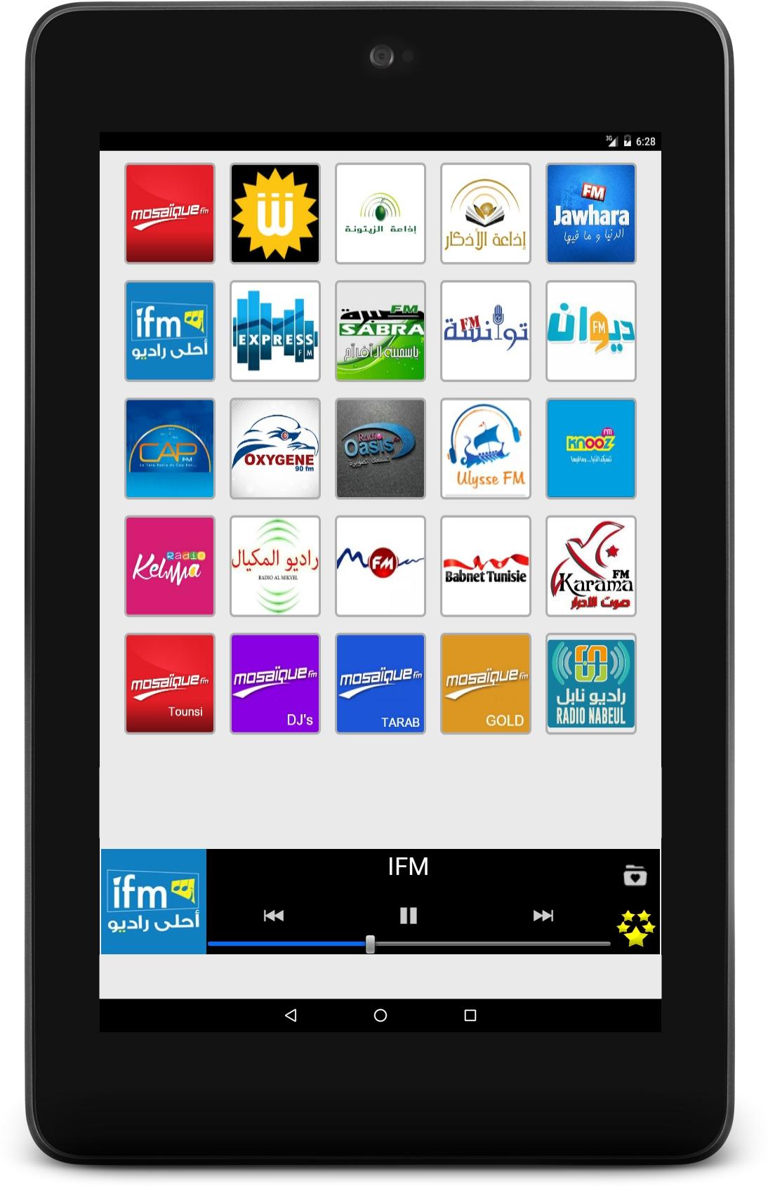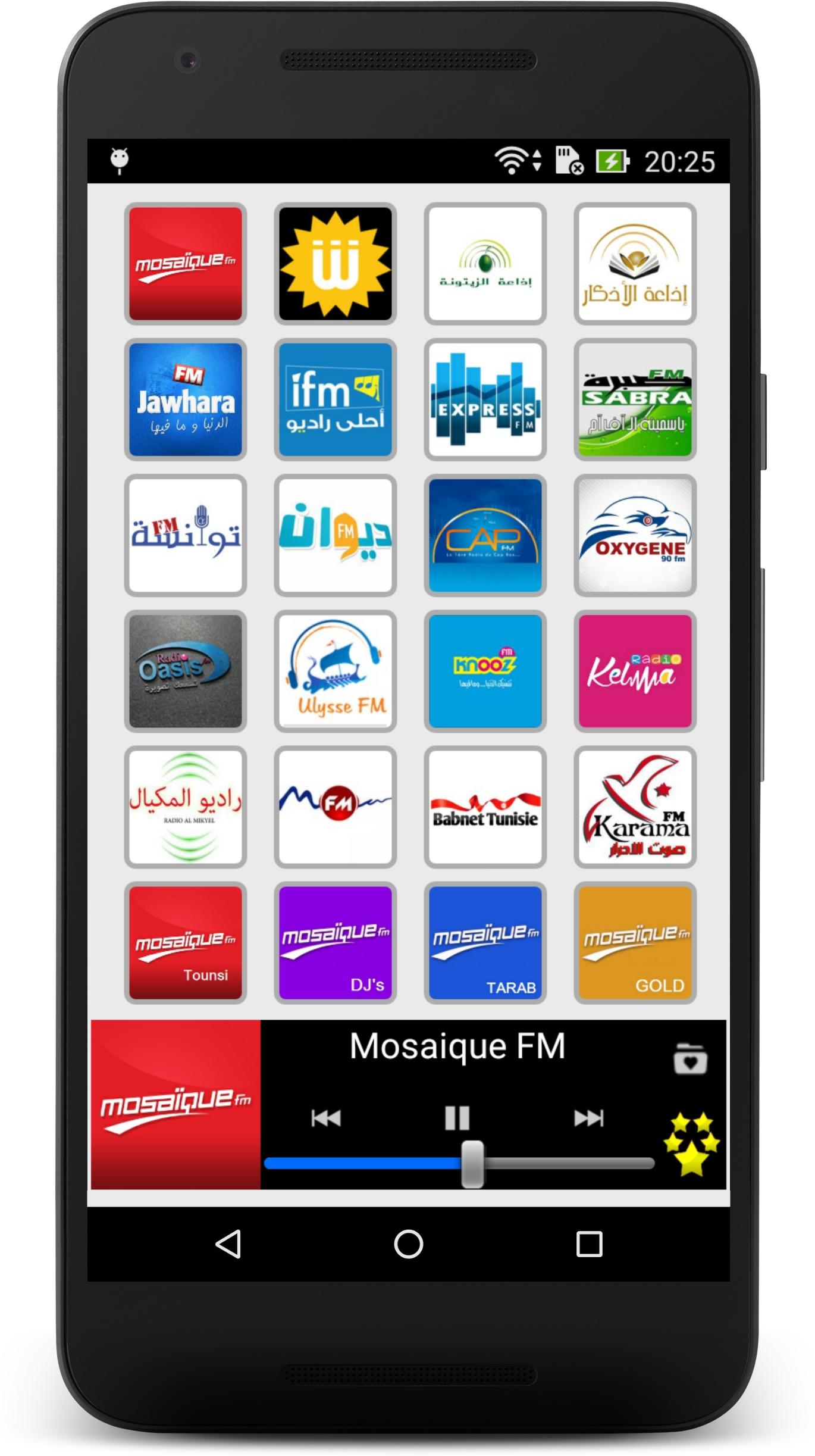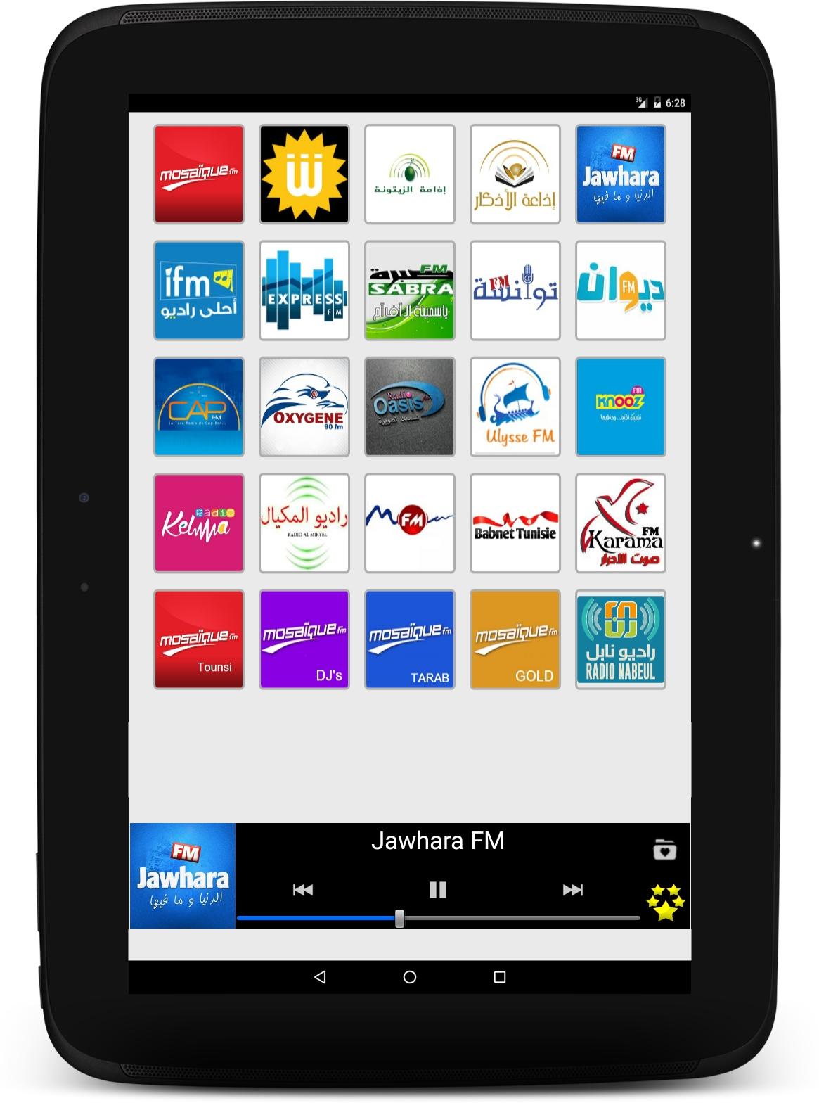 Listen live to your favourite Tunisian radio stations and to your preferred program with Radio Tunisia. Wherever you are, in Tunisia or abroad, at home or in mobility, our application allows you to have easy access to the best and most popular Tunisian radio stations. Culture, music, sport, news, humour… you find everything there! Several functionalities are the strength and originality of Radio Tunisia: - An extremely simple and intuitive user interface which allows you to select, with a just click, the radio which you want to listen to or to change radio stations in a ultra-fast way. - A wide choice of radios, of any categories, based on the last audience research: • Generalist radio stations: Mosaïque FM, Shems FM, Jawhara FM … and their numerous news broadcasts, entertainment programmes or cultural programmes. • Music radio stations: IFM, MFM, Mosaïque Tarab and many others that offer the best of pop, rock, Jazz, Blues, House, Techno, etc. • Sport and news radios stations: Oasis FM, Radio 6 … and their fascinating sports, political or economic debates. • Local radio stations: for local news and information (Cities: Tunis, Sfax, Souss, Bizerte, Gabes, Monastir, Gafsa, La Soukra …). Radio Tunisia is also: - A listening in the background that allows you to do other activities on your Smartphone whilst continuing to listen to your favourite station. - An easy management of your favourites list: you can modify the order of appearance of your radios whenever you feel like it. And you can hide simply and quickly stations that you aren’t interested in. - A daily and continuous follow-up on our part to repair as fast as possible audio streaming dysfunctions. These repairs not require an update of the application. So, no action on your part is required. Our team is dedicated to providing a superior quality of experience for the user. Of course, we remain open to your comments and suggestions. Do not hesitate to leave us a message or an encouragement via Play Store. Below, the available radio stations: - Mosaique FM - Shems FM - Zitouna - Zitouna Adkar - Jawhara FM - IFM - Express FM - Sabra FM - Zitouna Coran - Diwan FM - Cap FM - Oxygene - Oasis FM - Ulysse - Knooz FM - Radio 6 - Radio Al Mikyel - Radio MFM - Babnet Tunisie - Karama FM - Mosaique Tounsi - Mosaique DJs - Mosaique Tarab - Mosaique Gold - Radio Nationale - Radio Internationale - Radio Jeunes - Radio Culture - Radio Sfax - Radio Monastir - Radio Kef - Radio Tataouine - Radio Gafsa - Noise FM Warning: Radio Tunisia requires an Internet connection and depends on the radio broadcast. Some stations can be temporarily unavailable.