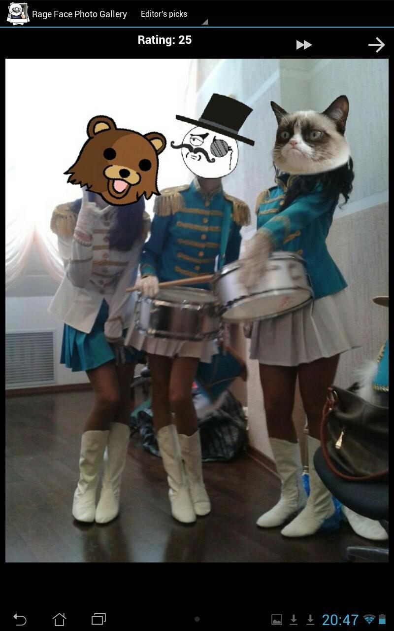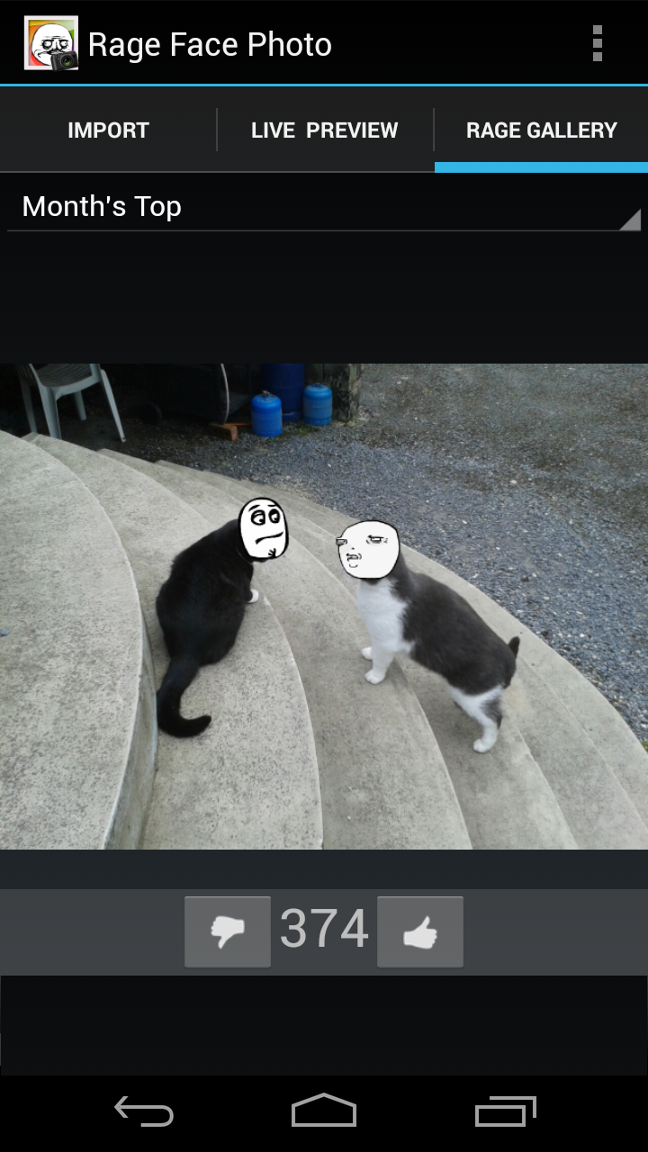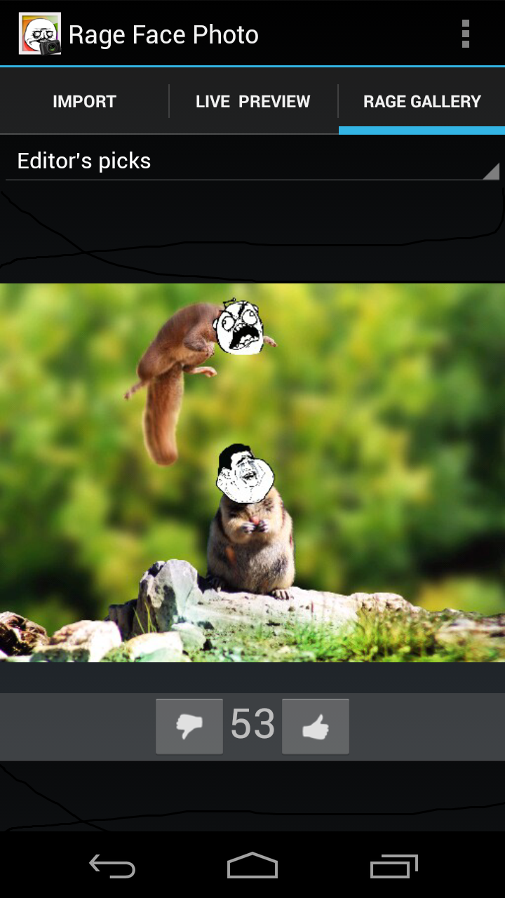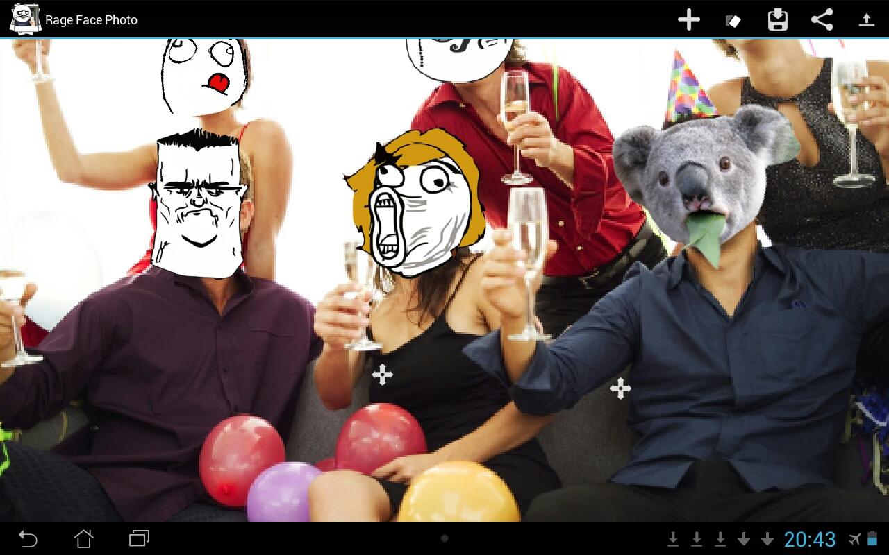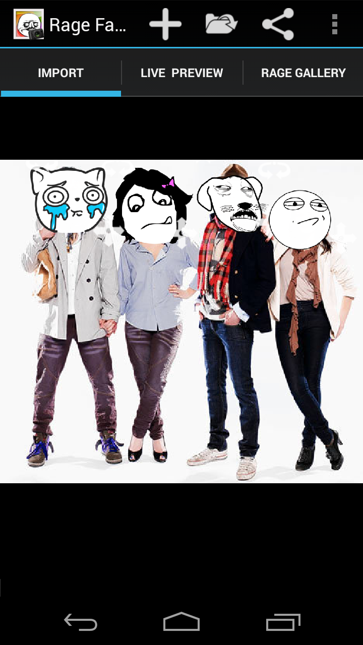 Rage Face Photo is a fun photo application that can detect faces and replace them with rage faces (otherwise known as meme faces or tumblr faces). This is the only application of this type featuring a live preview, which lets you see and change the rage faces before taking the photo and see how it will look! It is also possible to import previously taken pictures and photos, and have their faces replaced with rage faces. Resize, reposition and change rage faces before saving or sharing your new photo with the world. Features over 200 of the most popular rage/troll faces, but you can also load your own images! For funny updates like us on Facebook: https://www.facebook.com/pages/Rage-Face-Photo/103039869820189 This application is fully featured, and displays a small ad when connected to the internet.