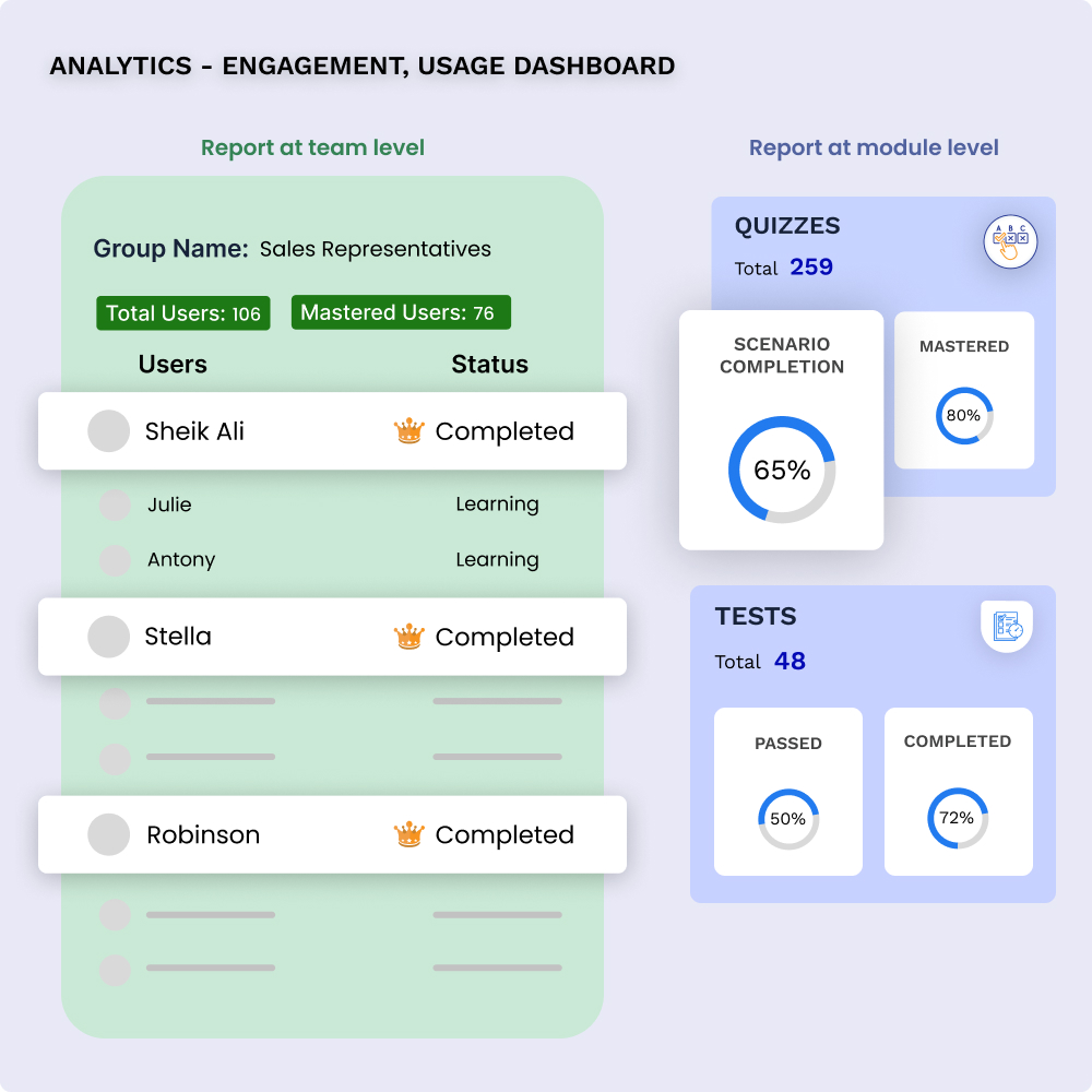 • Personalized Enablement: Tailored microlearning and reinforcement of critical topics and scenarios for every role and team across the hierarchy.