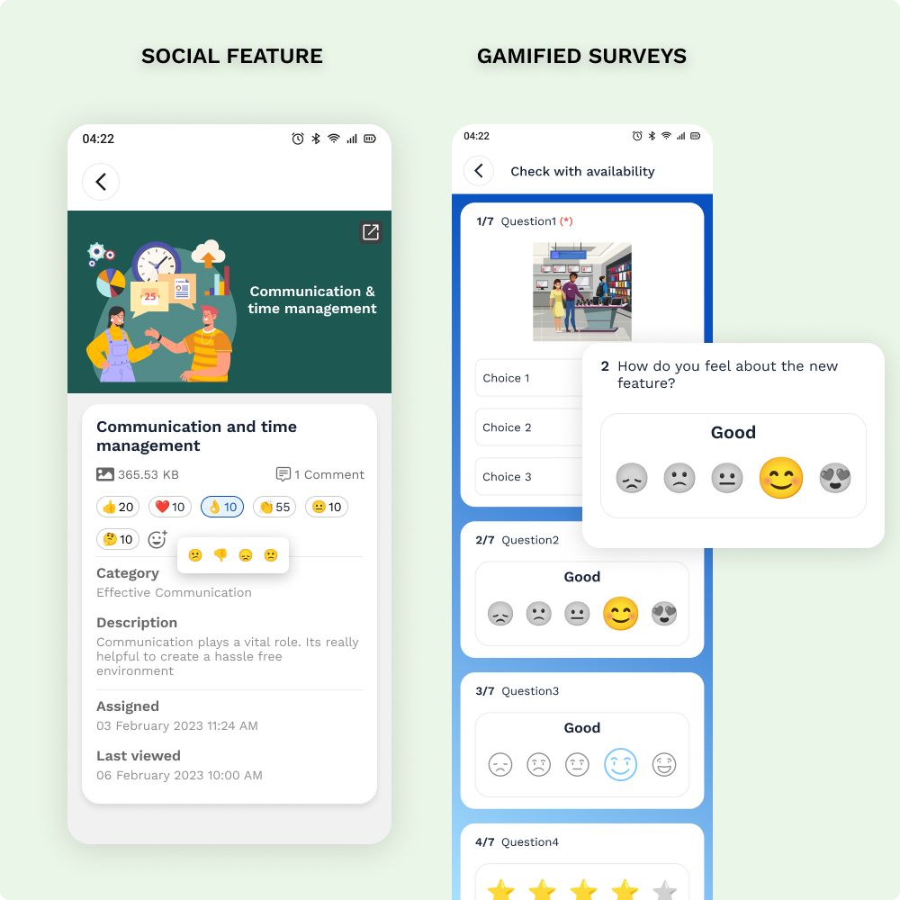 • Gamified Learning Experience: Points with leaderboards, badges, and rewards encourage continuous learning and improvement, supporting high employee engagement and retention.