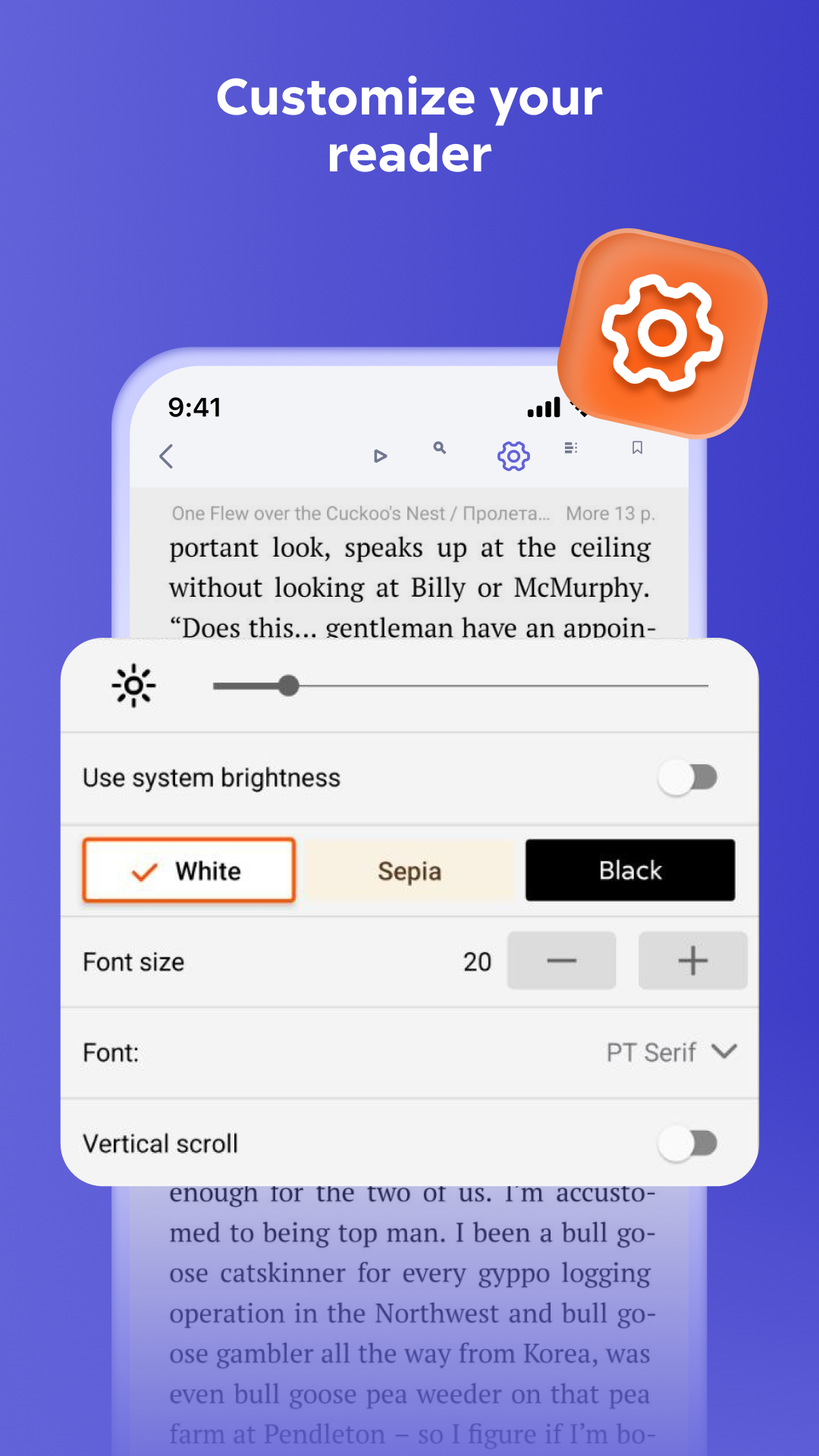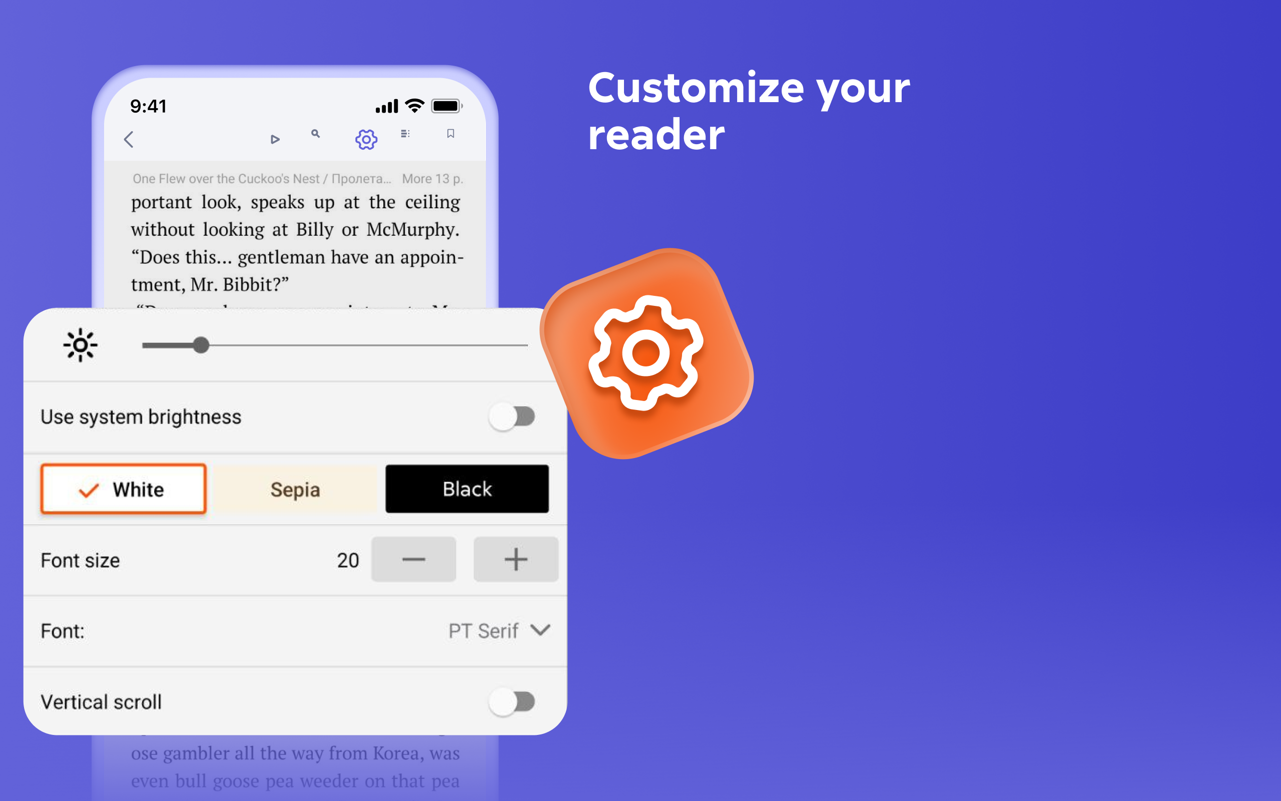 · fine-tune your reading experience for maximum comfort — adjust book background, screen brightness, and font size
