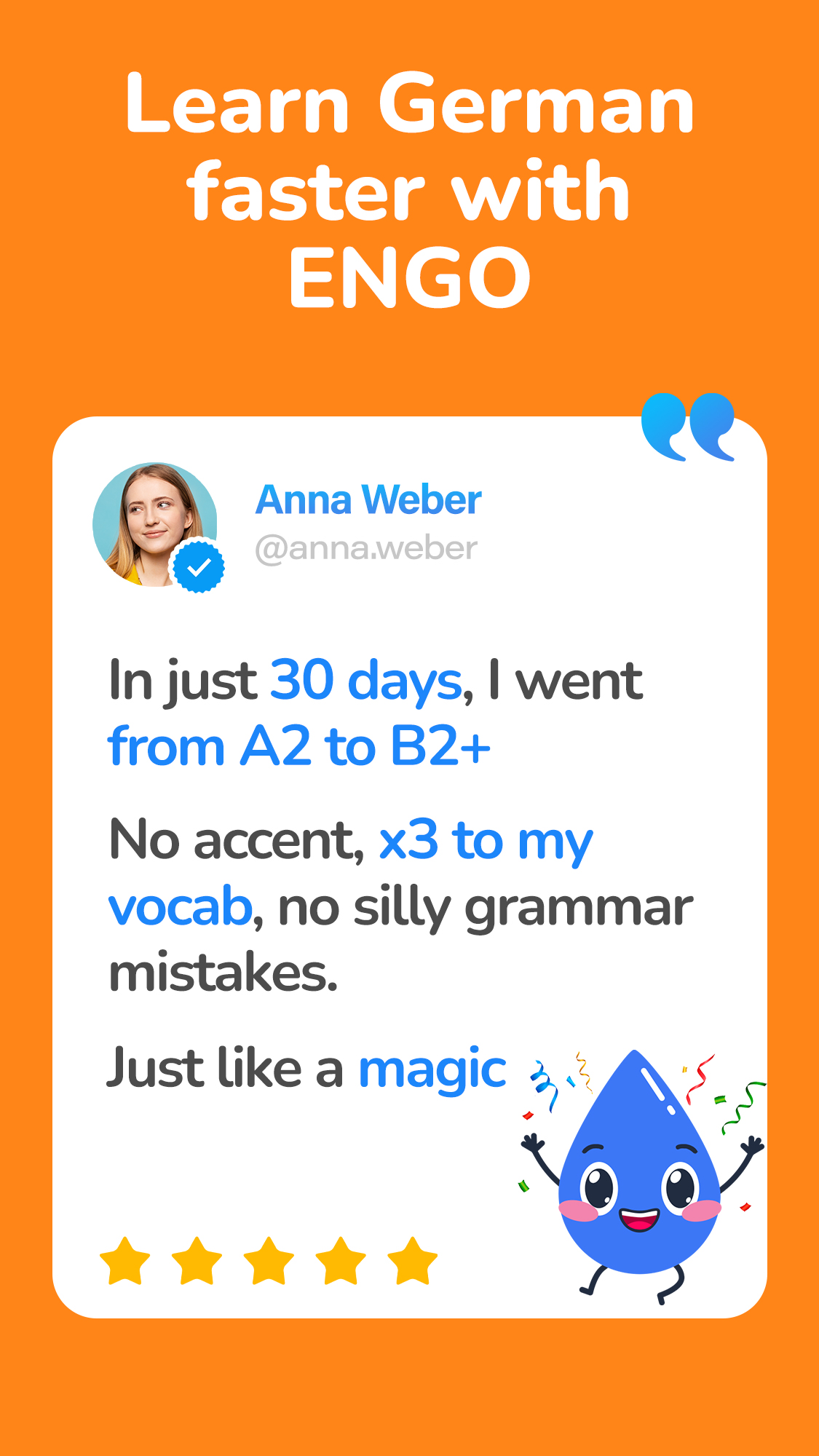 ENGO is a unique and effective German language learning app. Learn German in context with entertaining books & stories at your level. Build your German vocabulary with smart flashcards from topics you enjoy the most. Download Engo FREE and start learning German today! 🇩🇪 Key Features: Interactive Reading: Read German books and translate words instantly. Vocabulary Building: Learn new German words and phrases. Flashcards: Use flashcards to remember vocabulary. Video Learning: Watch German videos, movies, and TV shows with subtitles. Structured Courses: Complete A1, A2, B1, and B2 level courses. Pronunciation Practice: Improve your German pronunciation with feedback. Speaking Practice: Engage in real-life scenarios to practice speaking. Easily read and listen to German anytime, anywhere. Just 5 minutes a day and one story each day to learn German faster. Complete Courses for All Levels ENGO offers comprehensive courses for all levels: A1, A2, B1, and B2. These courses cover everything from basic grammar and vocabulary to advanced language skills. Each level is designed to build on the previous one, ensuring a smooth learning curve. Improve Pronunciation ENGO includes features to help you improve your German pronunciation. With speech recognition technology, you can practice speaking and get instant feedback. This way, you can sound more like a native speaker and improve your confidence in speaking German. Real-Life Speaking Scenarios Practice speaking German in real-life scenarios with ENGO. Our app provides interactive exercises that simulate real conversations. This helps you become more comfortable using German in everyday situations, from ordering food at a restaurant to asking for directions. Learn New Words Our app offers a vast library of German words for you to learn. You can explore new vocabulary and practice it in various ways to ensure you remember it. ENGO’s intuitive design makes learning German fun and effective. Flashcards for Memory ENGO uses flashcards to help you remember German words. Flashcards are a proven method for memorizing vocabulary, and with ENGO, you can create custom flashcards or use our pre-made sets. This way, you can learn German words at your own pace. Watch Videos with Subtitles Improve your listening skills by watching German videos, movies, and TV shows with subtitles. This feature helps you understand spoken German in different contexts, making it easier to learn the language naturally. You can follow along with the subtitles and learn new phrases and expressions. Read and Translate With ENGO, you can read German books and easily translate words you don’t understand. Each story includes a quiz to practice grammar, vocabulary, and articles (der, die, das). Retake quizzes to improve reading comprehension and prepare for exams like Goethe, DSH, TestDaF, and TELC. A must-have app for learning German for travel, daily life, or exam preparation. ENGO is your best companion for mastering German! Download today and start learning German fast and easily with ENGO!