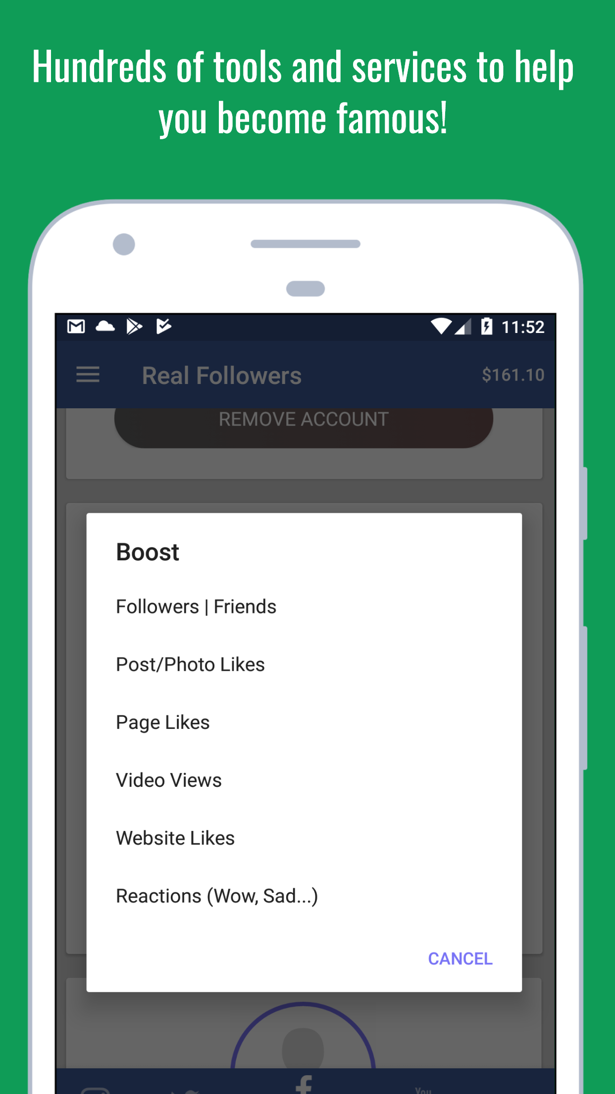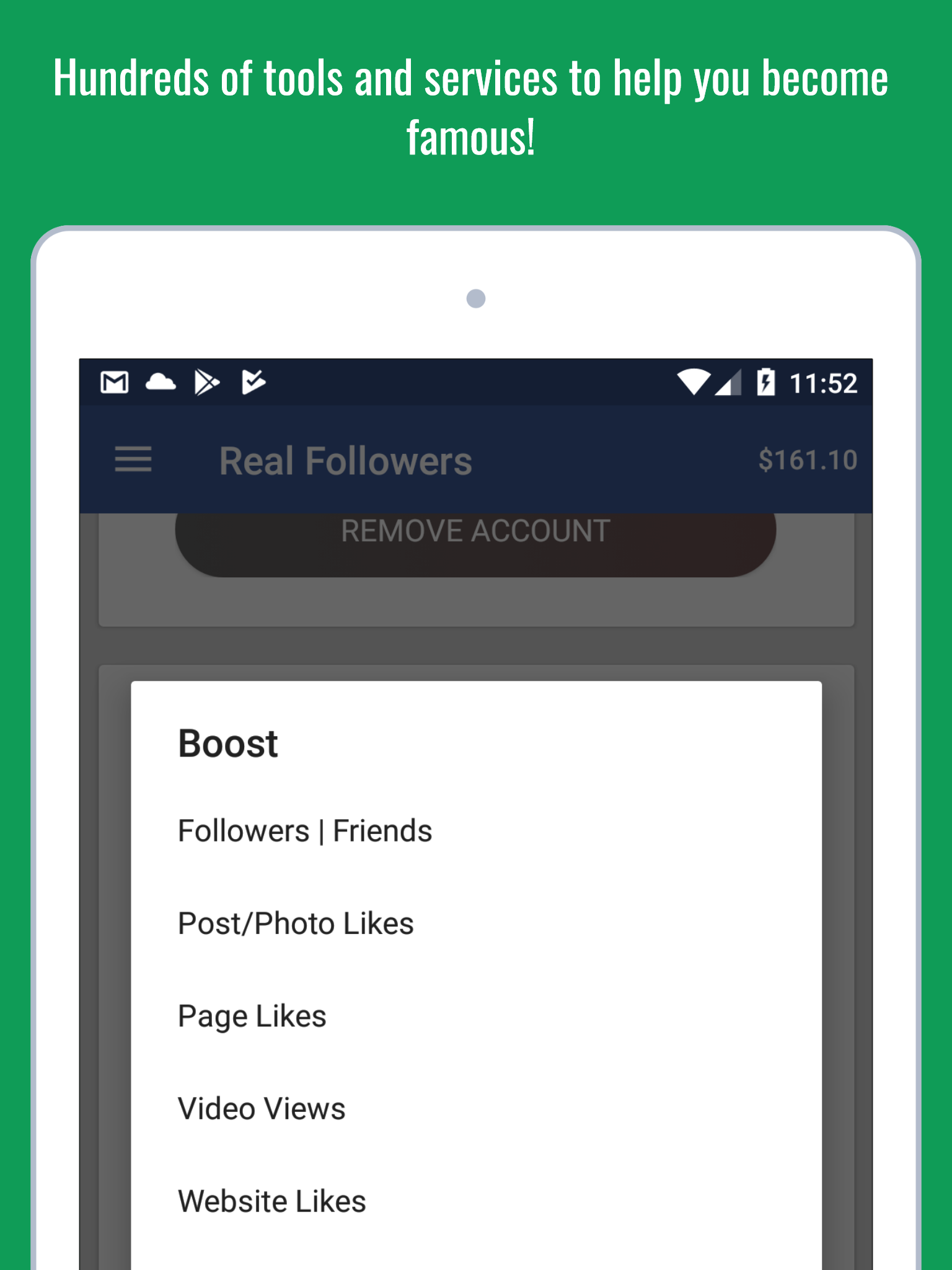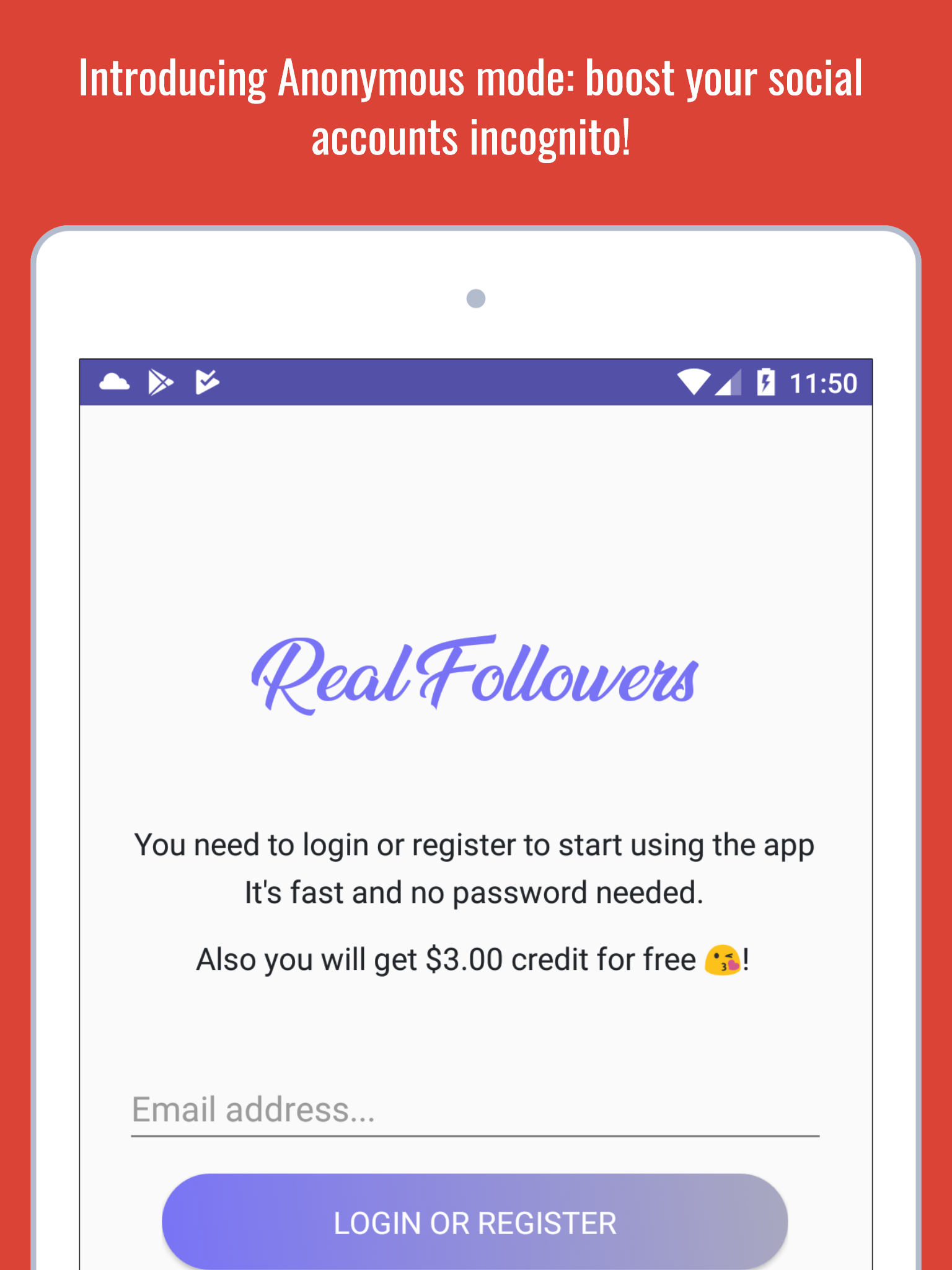 ** NEW: Get free credit everyday! ** Want to increase your online visibility? want to become famous? want to become an influencer followed by millions? Look no more! With Real Followers, you can boost your online social presence with our free tools and tips! It's as easy as: - Add your Instagram, Facebook, Twitter, YouTube or SoundCloud account (we won't ask for your password, and you should never give your password to any 3rd party app!) - Our AI-driven bots will scan your account and decide of the best way to boost it - Select what you want to boost (Followers, Likes, Views, Downloads, Shares...) - Follow our suggested SEO tips (for eg. by including specific tags to your post) - Become famous! 100% guarantee! Disclaimer: Real Followers is 3rd party app and is not affiliated, in any way, to Instagram, YouTube, Twitter, Facebook or SoundClound.