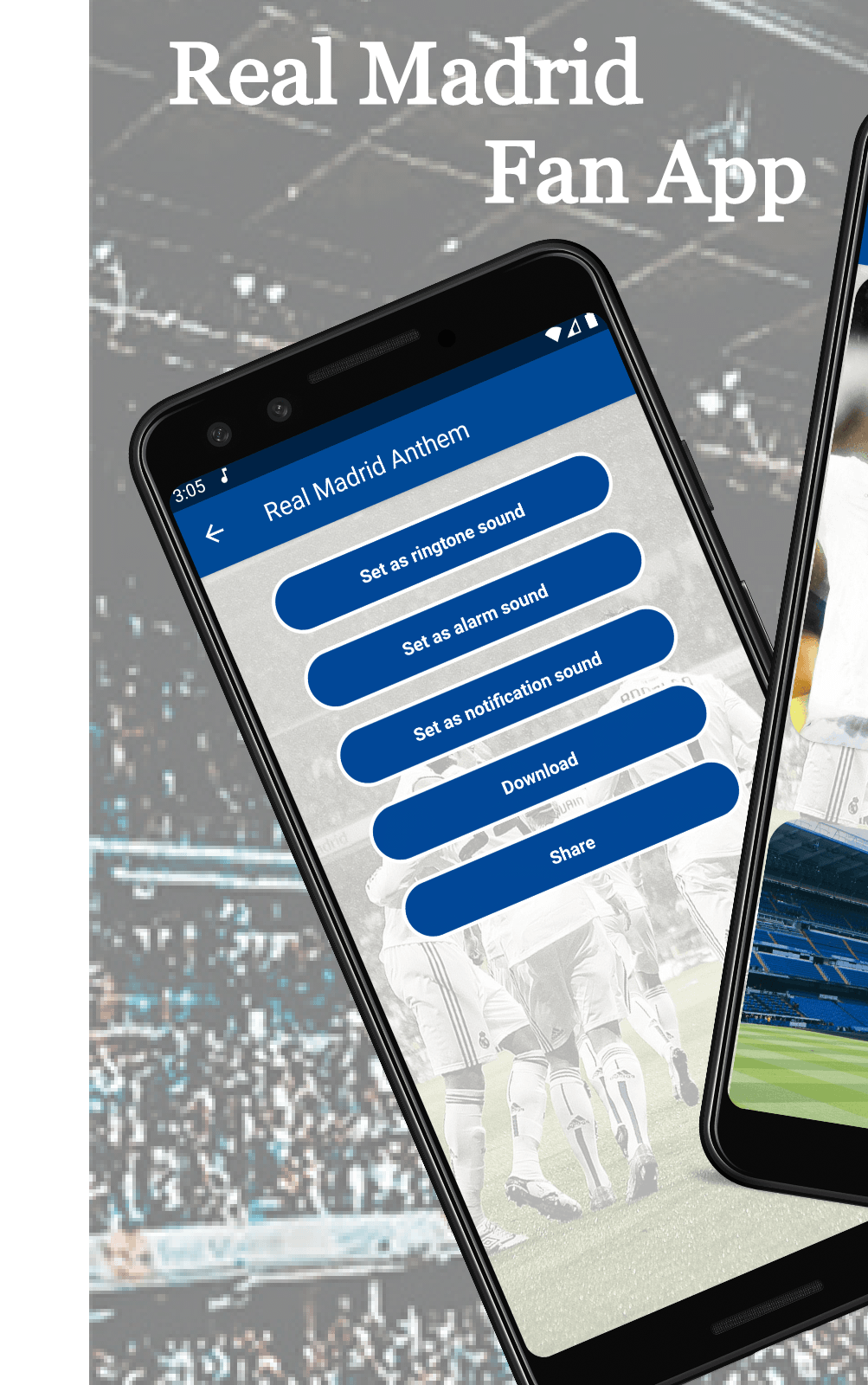 This app is designed for Real Madrid, one of the best teams in La Liga. Personalizing your phone with Real Madrid CF tools has never been easier. It contains many features for passionate Madrid supporters. These are football match videos, free wallpapers, background images, photos, Gifs, stickers,ringtones, songs and special music. Madrid Fan app is the best choice for you. Real Madrid is one the oldest Spanish football teams in La Liga Spain. The team has Millions of fans. Real Madrid won a total of 34 La Liga, 19 Spanish cups and 11 Spanish super cups championship. There are many legendary football matches that nobody can forget. This Real Madrid app contains highlight videos of goals and highlights from La liga and champions league games. Real Madrid F.C. app is the best choice for personalizing your android device. All tools are now collected in one app. You can find background images and wallpapers which you can download and share with your loved ones. We are always uploading new best wallpapers for you. Find many Santiago Bernabeu and player wallpapers. This application has many interesting collections that you can use as wallpapers. Download your free best Real Madrid ringtones and wallpapers and set a new ringtone now. You can find hundreds of Real Madrid CF best Gifs and stickers. Share all free stickers and gifs on social media, message applications, and email with your friends. It provides you downloading gif stickers on your device. It contains a huge collection of funny gifs and amazing stickers which you can send for texting via social media. Browse all kinds of anime gifs for messaging such as player gifs, stadium gif funny gif and then share them on social media. Find many songs in the Real Madrid C.F. app. You can listen to it anytime you want. It contains almost 100 different Real Madrid free ringtones. Just enjoy it! It is a free app only for real Real Madrid FC fans. There are lots of Real Madrid songs that you can set as ringtone sound, set as notification sound, set as SMS sound or set as alarm sound on your device. Get fun with your ringtones. It is a Real Madrid sound collection of unique and diverse Free Ringtones for Android with excellent quality. You can download ringtones on your device to set them for default ringtone, message ringtone, alarm ringtone. Moreover, use Real Madrid CF App to set the notification sounds of social apps such as Tiktok, Facebook, Instagram or Twitter. Set Free Ringtones for Android for messaging and call apps. Wallpaper category will give you a lot of awesome images of Real Madrid CF players, pride symbols and many more. You can share, download or set as wallpaper these amazing Real Madrid images. Moreover you can find impressive photos of Real Madrid players and stadium. All Real Madrid CF contents are selected carefully with high quality. -- Features -- *Free app *Special Real Madrid videos *Huge Real Madrid Gif colllection *Share Real Madrid stickers with your beloved ones *Listen and Download Real Madrid songs *Share Real Madrid musics on social media *Set as ringtone for Android / contact ringtone / alarm sound / SMS sound / notification sound *Wonderful Real Madrid images you can set as wallpaper *Real Madrid football players: Ronaldo,Bale,Zidane,Benzema,Modric,Alaba,Marcelo, Isco,Mariano *Download wallpapers on your phone or tablet *Feel La Liga on your phone *Share Real Madrid wallpaper with your friends *Compatible with 99% of devices *Does not affect battery performance. *User friendly DISCLAIMER: This app is made by Real Madrid fans, and it is unofficial. The content in this app is not affiliated with, sponsored, endorsed, or specifically approved by any company. All copyright and trademarks are owned by their respective owners. The videos, ringtones, gifs and wallpapers in this application are gathered from the web. If they are infringing your copyright, please contact us.