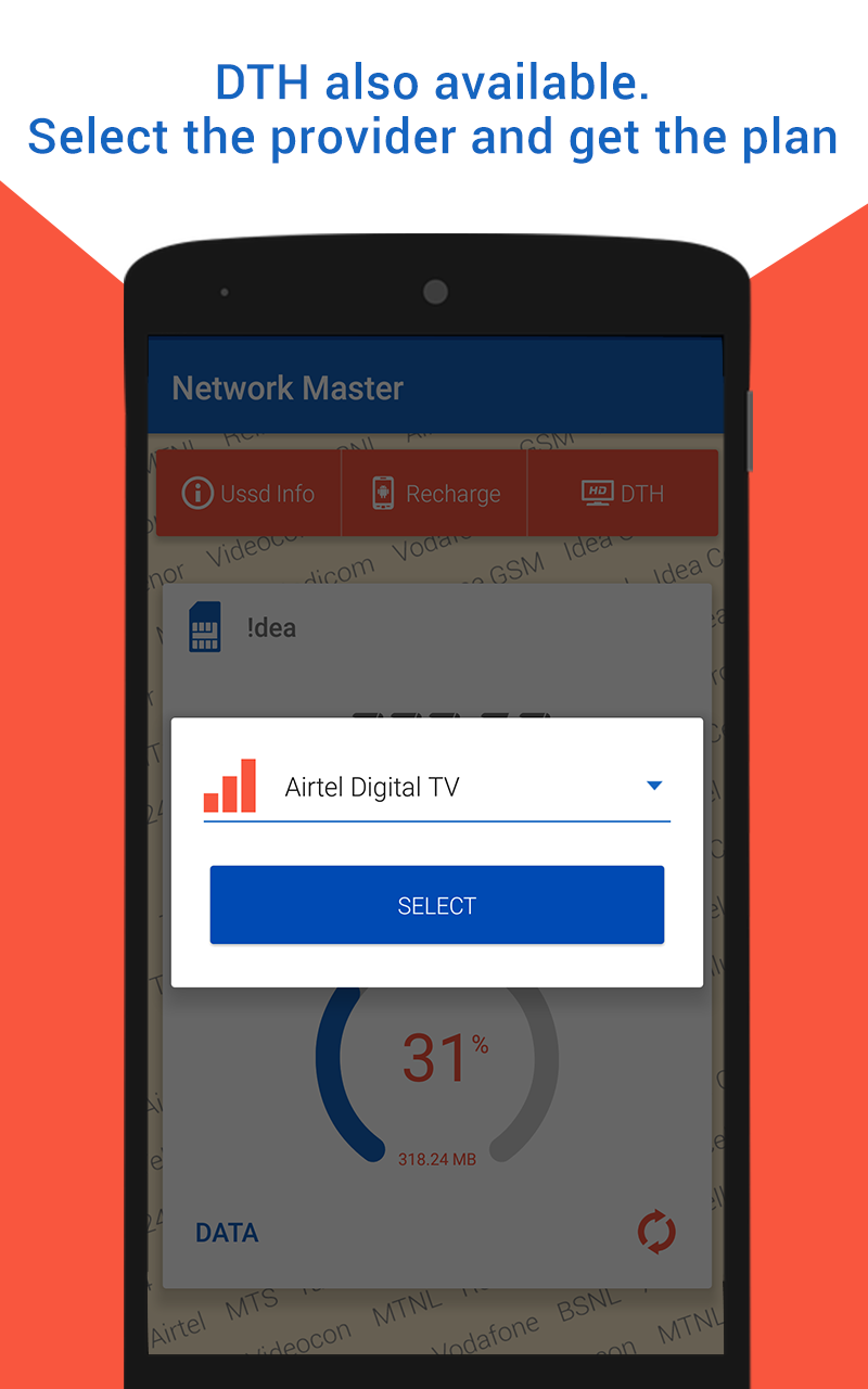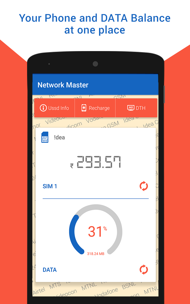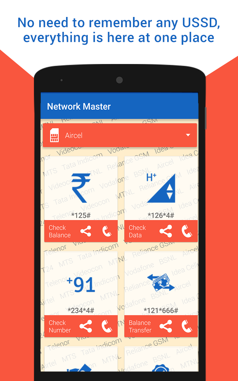 Recharge, Plans, Packs and USSD codes for all mobile operators in India! Complete mobile operator’s solution for mobile users in India! Do you want the best data or balance offer before you recharge? It’s much easier now! It is very difficult task to remember USSD codes to check your balance, checking remaining internet data, own mobile number and best offer in this hectic life. Don’t worry, we have developed this magical app to collect all the USSD codes for all the most popular Indian network operators at one place. Using this very useful android app, you can use almost all mobile networks USSD code at your fingertip without remembering them! Get your best recharge packs offers. Network Master India App provides list of network USSD code from all major telecom companies in all region in India like Airtel, Aircel, Reliance, Vodafone, BSNL, Idea, Tata DoCoMo, Telenor, Tata Indicom etc. Features of Network Master India App: • Check Your Number: With the help of this app you can easily check your own number. Now, you don’t have to remember your own mobile number. • Data Balance Enquiry: You can check your internet data balance using this app without dialing USSD Codes. • Balance Enquiry: Network Master provides the balance enquiry for all telecom operators. • Balance Transfer: Using this amazing android app, you can also transfer balance to users within the same network. • Best Offer: You can find details about Top-up Vouchers, Special Tariff Vouchers (STV), Combo Vouchers and Full Talk Time recharge offers by using dialing • Talk Time Loan: This app also provides the operator codes for talk time loan. The most important features of this app is, it works online mode as well as offline mode means if you have no internet access you can also use almost all the features of this awesome mobile recharge app. Network Master includes all the Codes for Balance Check, 2G Internet Balance, 3G Internet Balance, Recharge, Know Your Number, Best Offer, Balance Loan etc. when we are using data pack we can check all type recharge plan like Top up, Special recharge, Roaming,3G,2G etc. according to Circle How to use? - Enter your name and mobile number - Select Your Network - Select your region or area - Get your best offers recharge plans and pack plans for your operator Everyone wants to get best benefit on prepaid mobile recharge. Are you wasting your time by searching Prepaid Recharge Plans, Packs and Offers on the web? No worries, Find the most suitable recharge product / price for what you exactly need. We are trying continuously to make improvements and feature additions. Please keep your app updated to the latest version. Recharge Plans, Packs are regularly updated according to the operator’s update. Download this Network Master India App on your android device and get the best USSD Android app experience ever! Best Recharge packs, Plans offers app for Indian mobile users!