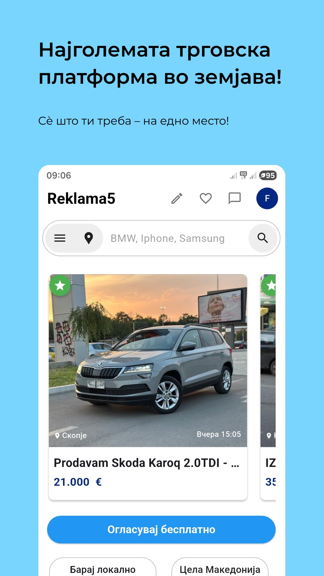 An average of over 300,000 listings, with over 3.5 million visitors / month and a total of more than 60 million page views per month, Reklama5 today is the largest trading platform in Macedonia, as well as the most visited website in Macedonia. In Reklama5 private individuals and companies can buy and sell new and used products and to offer services also serve for the presentation of your business. If you want to sell your car, if you interested in engines, looking for job, or want to post an event, offer categories for almost all wishes. ► Motor Vehicles ► Real Estate ► Home and Garden ► Apparel and Footwear ► Mobile phones ► Health ► TV, Video, Photo and Multimedia ► Musical Instruments and Equipment ► Watches and Jewelry ► Baby and Children's Products ► Health, Beauty Doda. and equipment ► CD, DVD, VHS Music, Movies ► Books and literature ► Office & School Supplies ► Leisure and hobbies Animals ► Sports equipment and activities ► Antiques, Art Collection. ► Business and activities, machines tools ► Food and cooking ► Shops, Shop ► Services, servicers ► Employment ► Events, Nightlife, Exhibitions ► Holiday, Travel, Tickets, Cruises ► Personal contacts ► Other Search listings! Find exactly what you are looking for a Reklama5 application you can easily view and filter all listings. -Prebaruvanje by categories and subcategories -Prebaruvanje by Region -Prebaruvanje keyword -Prebaruvanje the number of ad Add New Listing, quick and free! Install Reklama5 application and immediately start selling your items. Share favorite listings with friends on social networks: Facebook, Instagram, Viber, Twitter, SMS, E-Mail ... For our part always strive to offer the highest productivity. We are constantly working on further developing the portal for listings desires of users. Reklama5 guarantee high quality content announcements. Hence they checked all advertisements before publication. Almost all of our advertisers have been verified users. Representatives of the media or legal / physical person, you are able by email to establish contact with us. Please leave your questions and your phone number. We will respond as soon as possible. We appreciate your feedback on our application. It helps us to further improve. Thank you for your trust in using our services and we wish you much success with your listings.