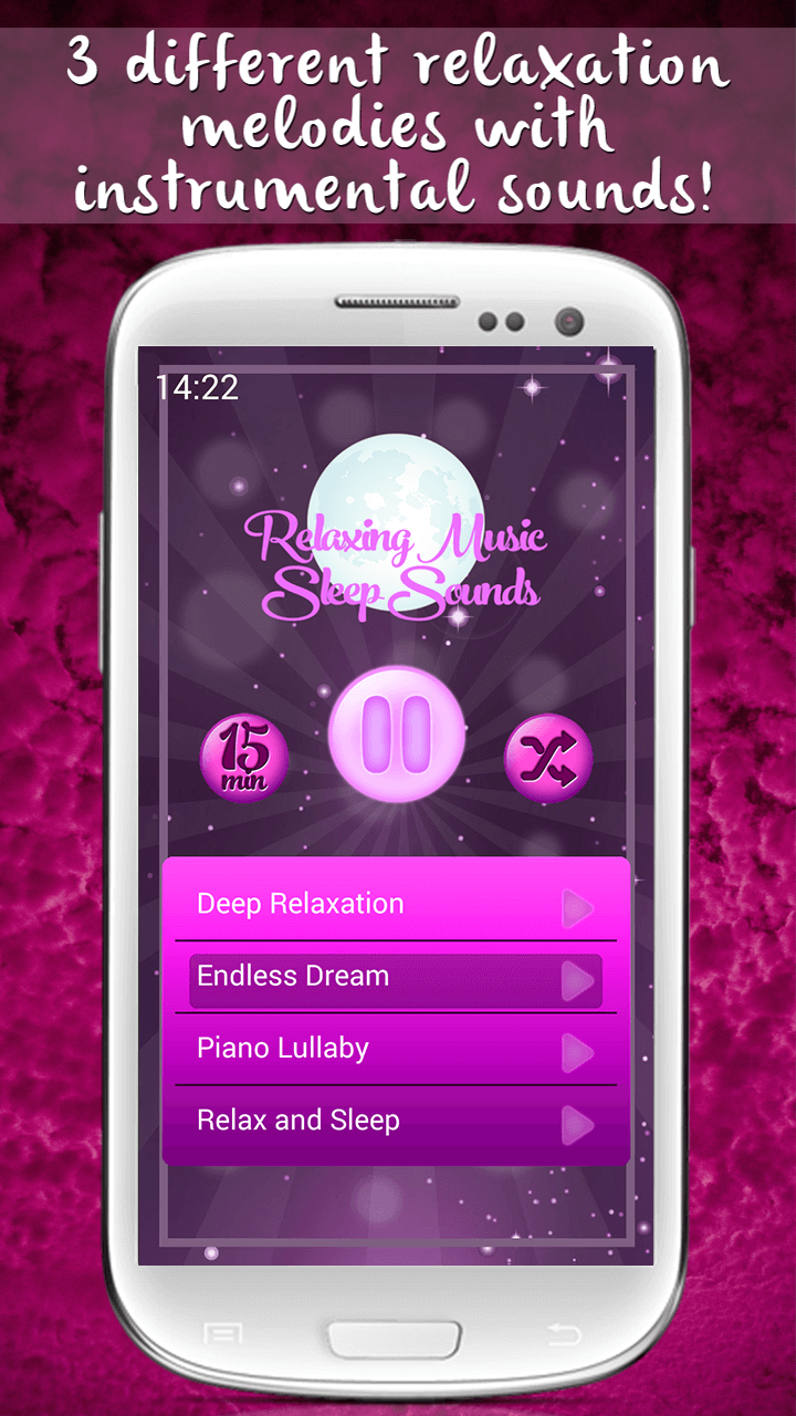 You have insomnia and you're constantly feeling tired? You need a sleep aid for your newborn baby? You need soothing music to encourage stress relief? You're at the right place! Download ✯ Relaxing Music Sleep Sounds ✯ and forget about all your worries! Features: Relaxation music for deep sleep, meditation, and stress relief! 3 different relaxation melodies with instrumental sounds! Options for setting different time intervals! Exquisite graphic design and intuitive tap controls! Suitable for all generations of users! New relaxing music for sleeping coming soon! No more lack of sleep for you! It's high time for you to sleep better and to improve your sleeping habits! Lull yourself to sleep with ✯ Relaxing Music Sleep Sounds ✯ and when you awake, you will feel like brand new. Improve your health and your mental skills during the day by getting a good nights' sleep. This collection of relax music sounds provides you with excellent music therapy which will relax your body and give your brain a chance to take a break from daily pressures and problems. If tiredness has become a normal feeling for you, you should definitively do something about it. Instrumental music and meditation melodies are here for you to save you from insomnia. Download this white noise app and enjoy in your sweet dreams. Do you want to relax for 15 minutes during the day at home or at office? Do you want to daydream about beautiful natural landscapes? Do you want to increase your concentration, focus, and perception? Besides curing insomnia and increasing your sleep quality, “sleeping music” can help you improve your quality of life in general. You can incorporate these relaxing sounds in your daily activities and use them as a perfect getaway from all the technology of modern society. All you need to do is download this app with “nature sounds”, install it on your phone, press the play button, and turn off your worries. Listen to these new age ambient music and let your mind become overwhelmed with peace and calm. Enjoy in three different relax melodies, all of which are equally beautiful and pleasant for the ear. ✯ Relaxing Music Sleep Sounds ✯ - for all fans of “mediation music”! Listen to this relaxing music for sleeping during various activities - during exercise, during your yoga meditation sessions, while massaging, during a quick nap, or while putting your baby to sleep. It is widely known that classic music such as piano music, guitar music, and violin music is very efficient for relaxing the brain and improving our concentration and therefore it is often used as therapy music. Studies have shown that it can help lower your blood pressure, relieve your stress levels, help fight depression and manage pain, and make you more at ease and open with your self. Besides that, it can enhance your mental alertness and memory. Therefore, even if you've never tried listening to classic instrumental music, you should definitively try listening to these “sleep music” sounds and see how they work for you. We are sure that you're going to be thrilled with the results. This soothing music for relaxation and meditation can help you achieve state of deep relaxation anytime you want. Put on your earphones and enjoy in natural sounds and birds singing. Rain sounds, sea sounds, waves on a beach, and sounds of the ocean can help you fall asleep faster. Sounds of lightning, storm, and thunder will lower your anxiety and make you feel at ease with the world. “Relaxing Music” Sleeping Sounds is waiting for you! Legal info: ===== This is a free application. Songs are originally designed as a sleep and relax aid and they are believed to be in a public domain. If you are an author of a song or you are aware that copyright belongs to a commercial author, please report to us immediately. Thank you!