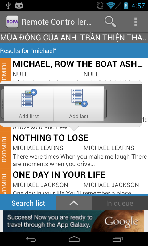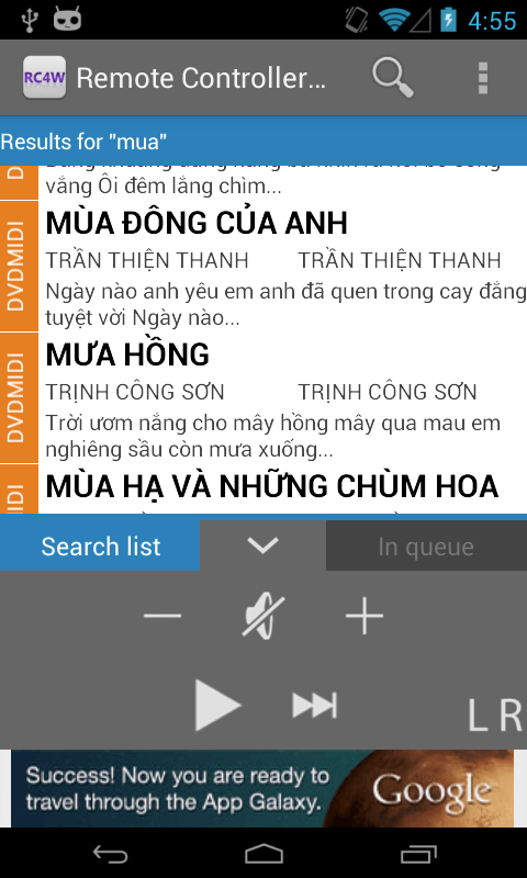 NOTICE: this program is abandoned and not developed anymore. Please search for newer: LetmKara. NOTICE: this program is client. You need the server (running on Windows) to make use of this. Server can be get at: http://rc4w.blogspot.com This is a remote controller program. It controls Walaoke through wifi. Walaoke is a karaoke-player that can be found at www.walaoke.com. Walaoke is a very good karaoke-player running on Windows. It can plays: kar, midi, mp3+lrc, mp3+xml, video karaoke (mkv, vob, avi, wmv, ...) and flash (swf). But it doesn't have a good database manager and remote controller. But it is still good. I wrote this program so that Walaoke user can have better karaoke experience. This aim to make song-selection-process easier. Before, you need find your song in song book and select it by entering the Song Number using remote control. Now with this, you can search song by name, artist, author, and by lyric (a few words at begining of the song). FEATURE: + Search song by name, by artist, by author, by lyric + Control play, next song + See playing list + ... This program is still under development. I intent to add more features in the future. If you love singing karaoke, this is the program for you. If you own a karaoke bar, using this program may give your client a professional feeling about your bar.