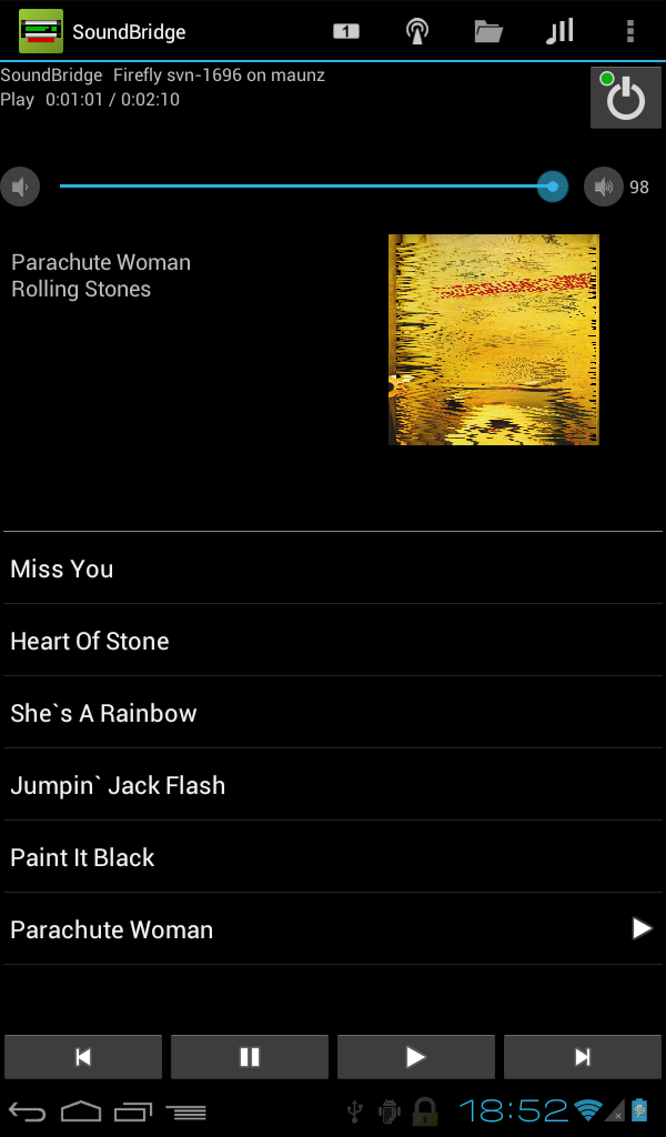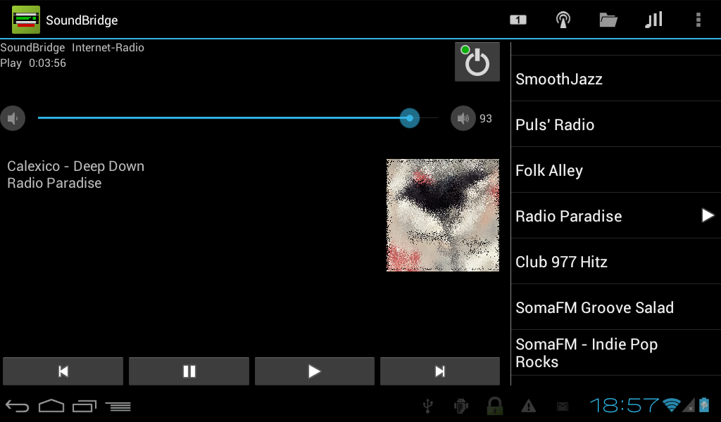 Remote for SoundBridge extends your Android smartphone to remote control the Roku SoundBridge and Pinnacle SoundBridge HomeMusic. It works even with basic SoundBridge players without graphical display. Instead of imitating the original infrared remote control the app has a more sophisticated approach: It utilizes the whole screen and the keyboard of the phone to let the user easily browse and search his music collection and the Radio Roku internet radio directory. Features: * Scan network for SoundBridge devices. * Connect to different music servers including UPnP, DAAP, and Internet radio. * Browse playlists, artists, composers, albums, songs, genres, and folders at music server. * Browse favorites, genres, locations, and top stations from Radio Roku. * Edit favorites from Radio Roku. * Play and edit stations of your presets list. * Save and restore presets. * Search music server for title, artist, or album. * Display status and current song info. * Show cover art (Depends on music server, radio station and song info). * Copy current song title and URL to clipboard. * Control power, play, pause, next, previous and volume buttons. * Manage the song queue: Display, set, insert, append and remove songs. Set Repeat and Shuffle mode. * Sleep timer. * Scrobble with last.fm (Works with UPnP and DAAP servers but not with Internet radio. Requires a last.fm account). * Search the Web for the now playing song (long press on song info!). * Easy switching between multiple players. * Pause during phone calls. Explanation of permissions: * Network communication: The app uses the network to communicate with the SoundBridge. If you enable to display cover art or scrobble with last.fm then the app may contact various internet sites. * System Tools - prevent phone from sleeping: If you enable the settings Keep Wi-Fi on or Scrobble then this permission is required to prevent the phone from shutting down Wi-Fi during sleep. * Phone calls - read phone state and identity: If you enable the setting Pause during phone call then the app needs this permission to listen for changes in the phone state, like incoming calls or off-hook. The app never uses the identity of the caller, but there is no separate permission in the Android system to distinguish between phone state and caller identity.