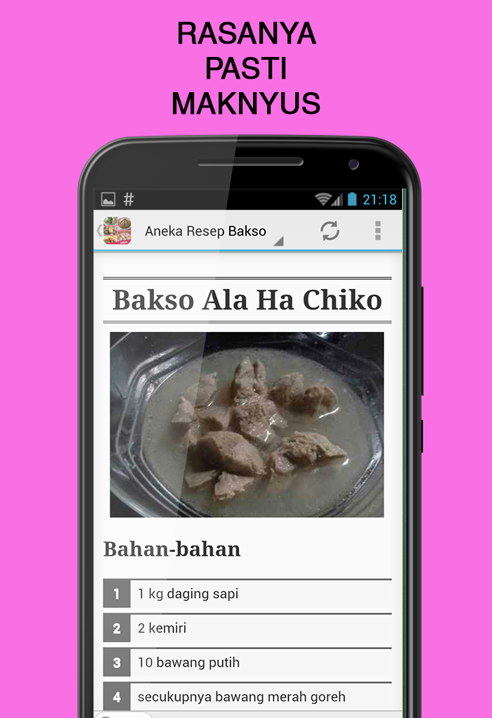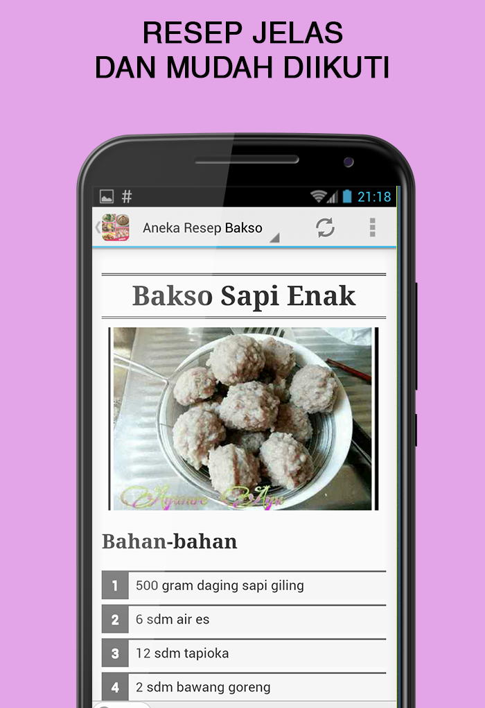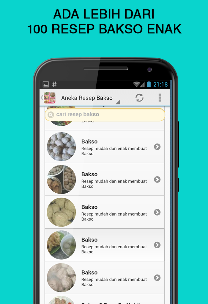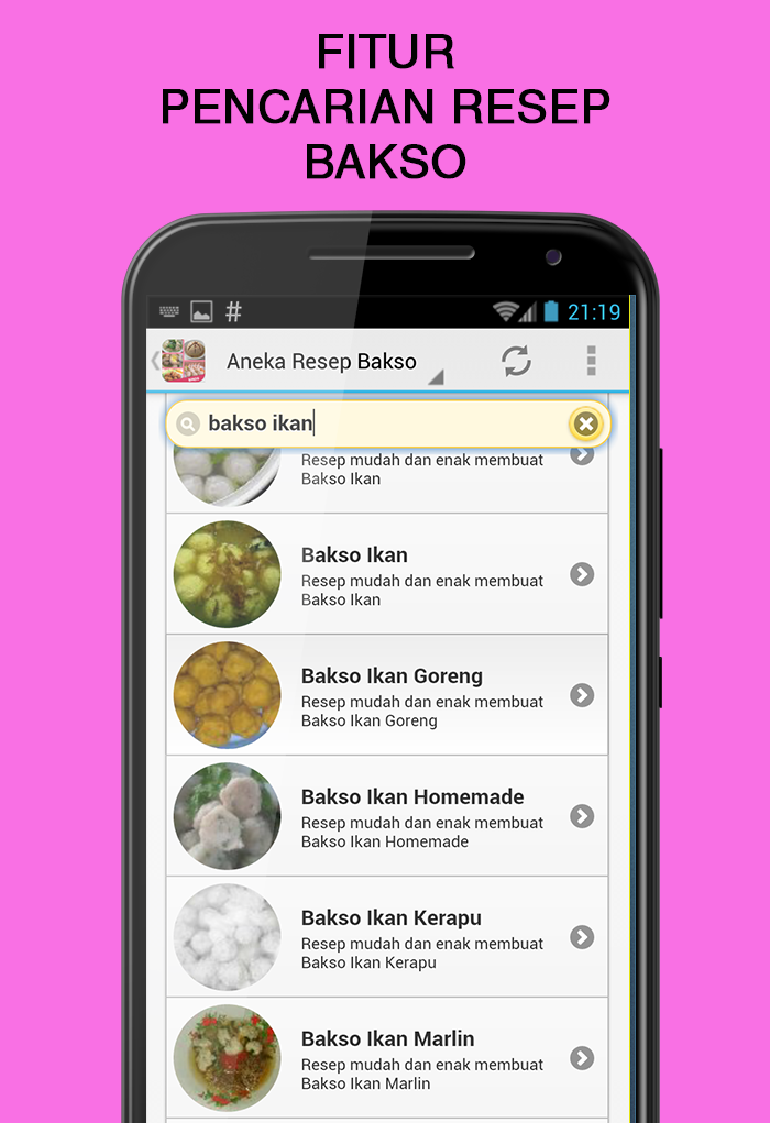 Anda bingung mau membuat bakso seperti apa? Temukan berbagai referensi olahan bakso dalam aplikasi resep bakso ini. Ada lebih dari 200 resep yang bisa anda coba secara gratis, mulai resep yang sederhana hingga berbagai resep bakso terkenal seperti resep bakso sapi bakso ayam bakso ikan bakso bakar bakso tahu bakso goreng bakso sapi kenyal bakso solo bakso urat bakso malang Fitur Aplikasi # 200++ Resep Bakso # Fitur Pencarian Resep # Desain menarik dan mudah digunakan # Ilustrasi gambar sajian yang menarik # Video cara memasak bakso