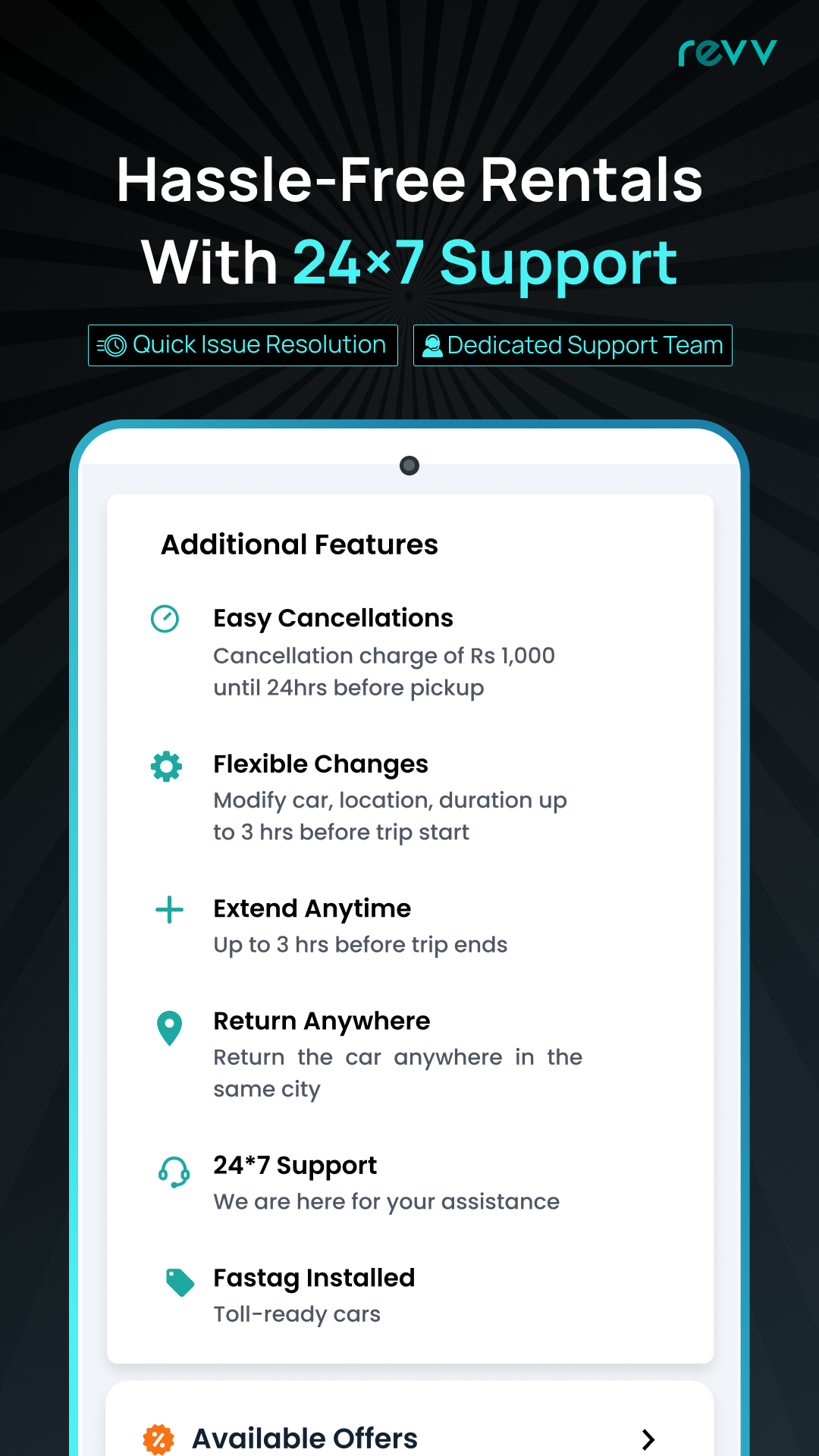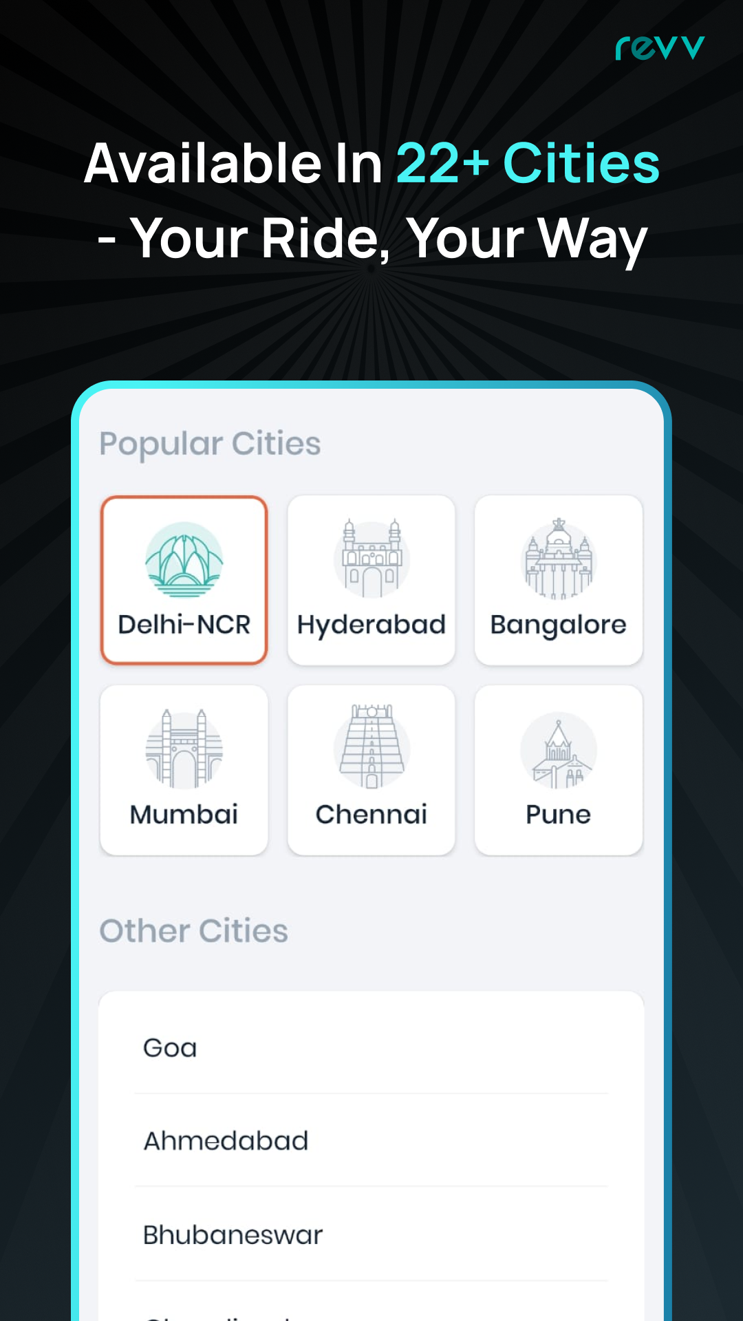 Revv is available in 22+ cities including Bengaluru, Hyderabad, Chennai, Mumbai, Pune, Delhi NCR, Kolkata, Ahmedabad, Chandigarh, Jaipur, Vizag, Goa, and Kochi, with expanding coverage. Whether it’s daily rentals, monthly car subscriptions, or long drive car bookings, Revv makes self drive car rentals simple, flexible, and reliable.