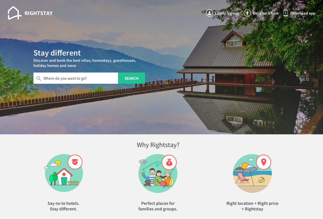 Say no to hotels. Stay different! Find unique places to stay with the Rightstay By MakeMyTrip mobile app. Choose from a wide variety of stay options - villas, homestays, guest houses, holiday homes, apartments, bungalows, tree houses and even celebrity homes. This summer vacation find your perfect stay in the hills. With over 2000 listings in more than Indian cities, Rightstay helps you find a place that’s just right for you. Plan your vacation with your friends and family this summer and save movey! How it works? 1. Download the 'Rightstay By MakeMyTrip' mobile app. 2. Pick a place: intuitive search & smart filters help you find the right place to stay, be it a villa or apartment. 3. Send a request: Fill in your preferences and send a booking request to our super awesome hosts. 4. Book: Book easily with just a click after a host accepts your booking request. What makes Rightstay by MakeMyTrip the best place to book your next stay? Wide variety of options: Find the best villas, homestays, guest houses, holiday homes, apartments, bungalows, tree houses and even celebrity homes. Verified properties: Rightstay Ninjas work all day and night and travel to each of these places to personally verify these places so that there are no surprises. Value for money: Book a full villa or a cottage and stay together instead of spending a bomb on multiple hotel rooms. Right location at right price: On the beach, near the airport or in upscale neighbourhoods, find affordable places right where you want to stay. Coverage: Find unique stay options in Goa, Coorg, Ooty, Kerala, Dharamshala, Assam, Nainital, Shimla, Mahabaleshwar and 50 other cities. What’s more in this for you? 1. Find your right stay from over hundreds of listings across all cities in India 2. Traveling with a large group? Find that ideal homestay to accommodate everyone together 3. Search for last-minute accommodations in metros or even smallest hill stations 4. Traveling with pets or need a kitchen to cook baby food? Rightstay lets you book pet friendly places and even villas with your own private kitchen.