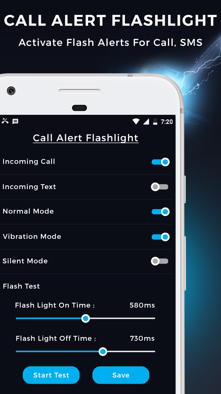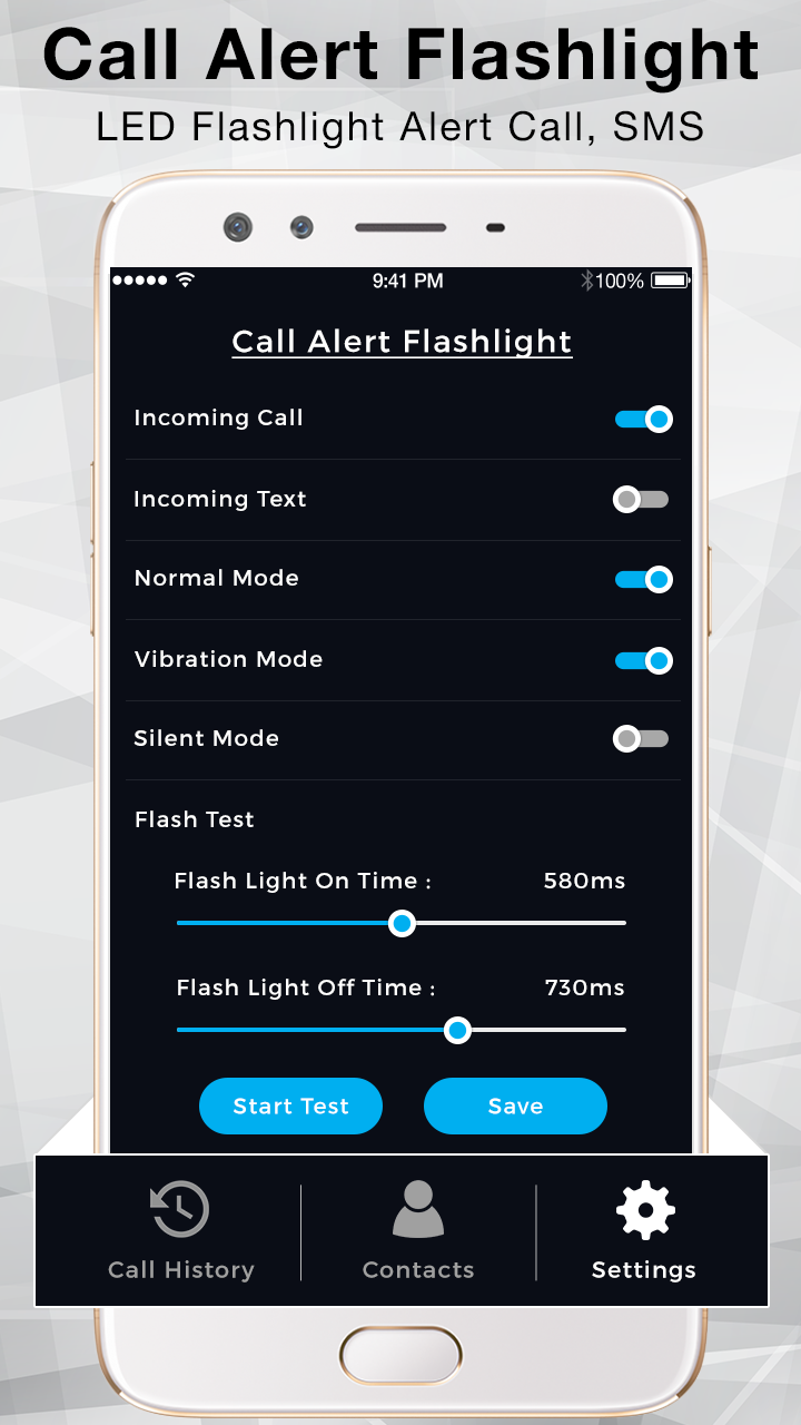 Are you worried from missing missed call, low battery sms alert, google alerts and smart notifications? Don’t worry your problems are solved try out our Ringing Flashlight alerts, flash call 2017 and flash call alert, be alert for blinking flashlight. Ringing Flashlight alerts allows you to blink the device's flash when you receive phone or SMS text or app notifications. The Iphone Ringing Flashlight feature finally available for Android phones. Ringing Flashlight for iphone 6 - Flash blink when you received a Phone Call, SMS and Notifications. Bright Free Flash on call and SMS alerts application. A Cool Ringing Flashlight alerts or flash alerts application. Ringing Flashlight, Led flash alerts and ringing flashlight helps you do not miss any call or sms. Flash alerts on call and sms. Flash Light alert will give you flash notification on incoming calls and text messages. Flashlight Alert on Call / SMS is a smart app to alert you when you receive a phone call, text message & any other social notifications with the blink of your flashlight. Best free flash on call / SMS app. Enable blinking LED flashlight for incoming calls and sms messages. You can use this application as flash blink on notifications, flash light on call, flash alerts on call, flash alerts notifications, Brightest Flashlight on call and sms. LED call and sms blink LED indicator. Flash blinking on call most brightest Flash blink Flash on call and Flash on SMS will notify you clearly. You can now get color flash alert notified everytime you get a call or SMS with a powerful and flash alert on call and sms and notification like i phone. Good for contacts backup. Flash Alerts in call and sms is an awesome ringing flashlight alerts. Flash light call alert will help you specially at night time when your phone is in silent mode or even mute. A bright, fast and simple Torch. The most elegant LED flashlight! This is the only torch without anything! Only light! It's a flashlight, not a toy. You can choose whether you want to enable flash for normal, vibrate or silence mode. With the most elegant design and the fastest startup, it definitely outruns a real flashlight. Just like a mobile torch, with this FREE APP you’ll be able to add brightness to any situation! Ringing Flashlight Alerts is also Caller ID - Who Called Me is the top reverse look-up service for mobile and land lines. Do not miss any ringing phone calls anymore. Try for free. Features : - Blink led flash alerts on Call, ringing flashlight - Blink led flash alerts on SMS - When you receive a call, new text message, the flash will blink. - Flash on call and sms can be set to work in any phone mode ( Ring, Vibrate, Silent ) - Ringing flashlight when phone have incoming Call and incoming SMS - Flashlight on Incoming Call - Phone contacts backup and restore - Phone contacts copy to sim - Phone contacts recovery app - Flash Blinking on Sms Message - You can regulate blinking frequency. - With Ringing Flashlight, each time you received a Phone Call, SMS, or Notifications, your phone's Flashlight will Blink to notify you, make sure you are not missing anymore. Best ways to use Flash Alerts ? + Hospitals or meeting or in silent zones. + When you are in a noisy area and won't hear your phone ring. + This app may also help you find your phone in dark. + Helps those who are hearing impaired. Advance: Color Flash Light Alerts Call! Flashlight Notification Flash Alerts On Call Flashlight Alert on Call / SMS Missed Call Alert Real Flashlight - Ultra Bright Flash on Call & SMS Feedback - If you like our application please rate 5 start for us - If you find any problems with Flash Notification please E-mail us Thank for your support! Keywords : Ringing Flashlight, Flash Alerts, Flash On Call, Flashing Alerts & Notifications