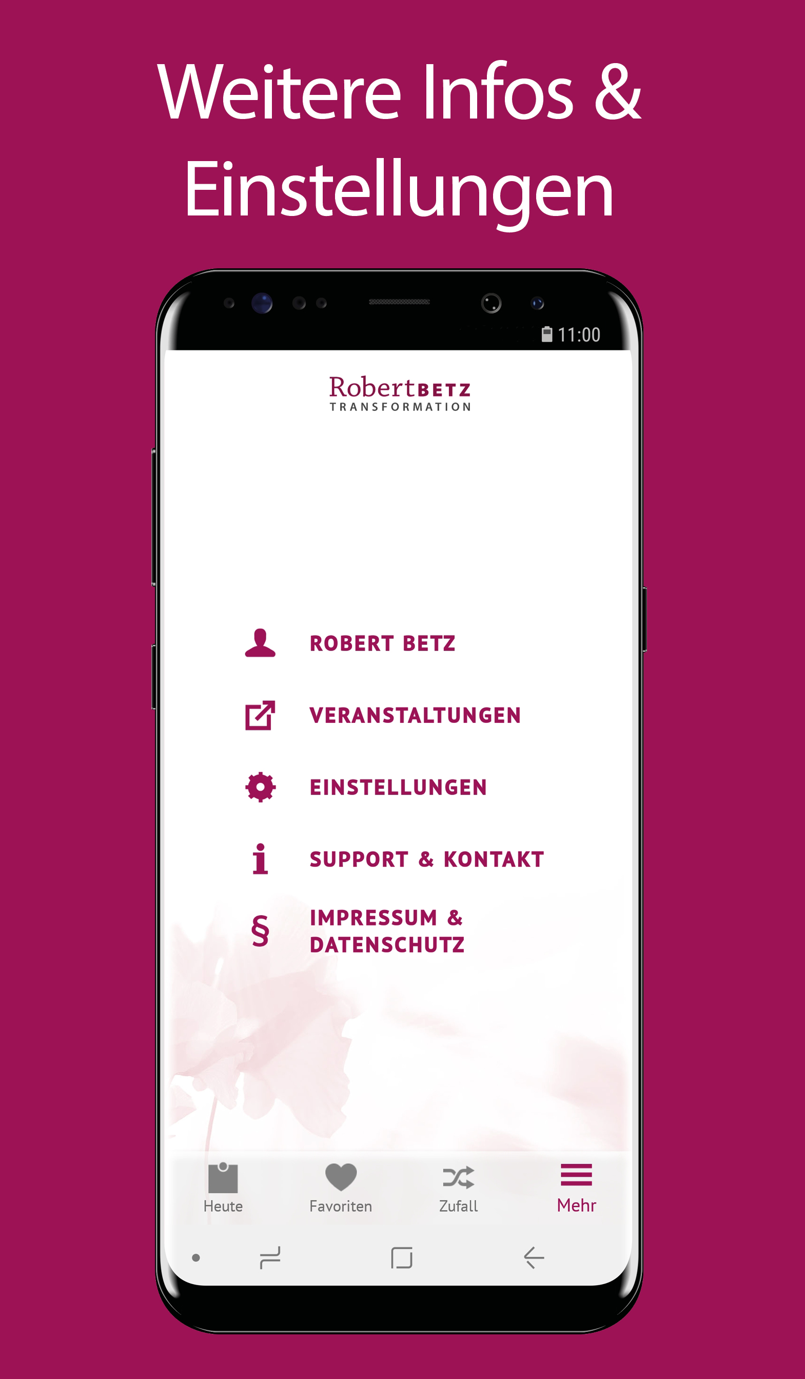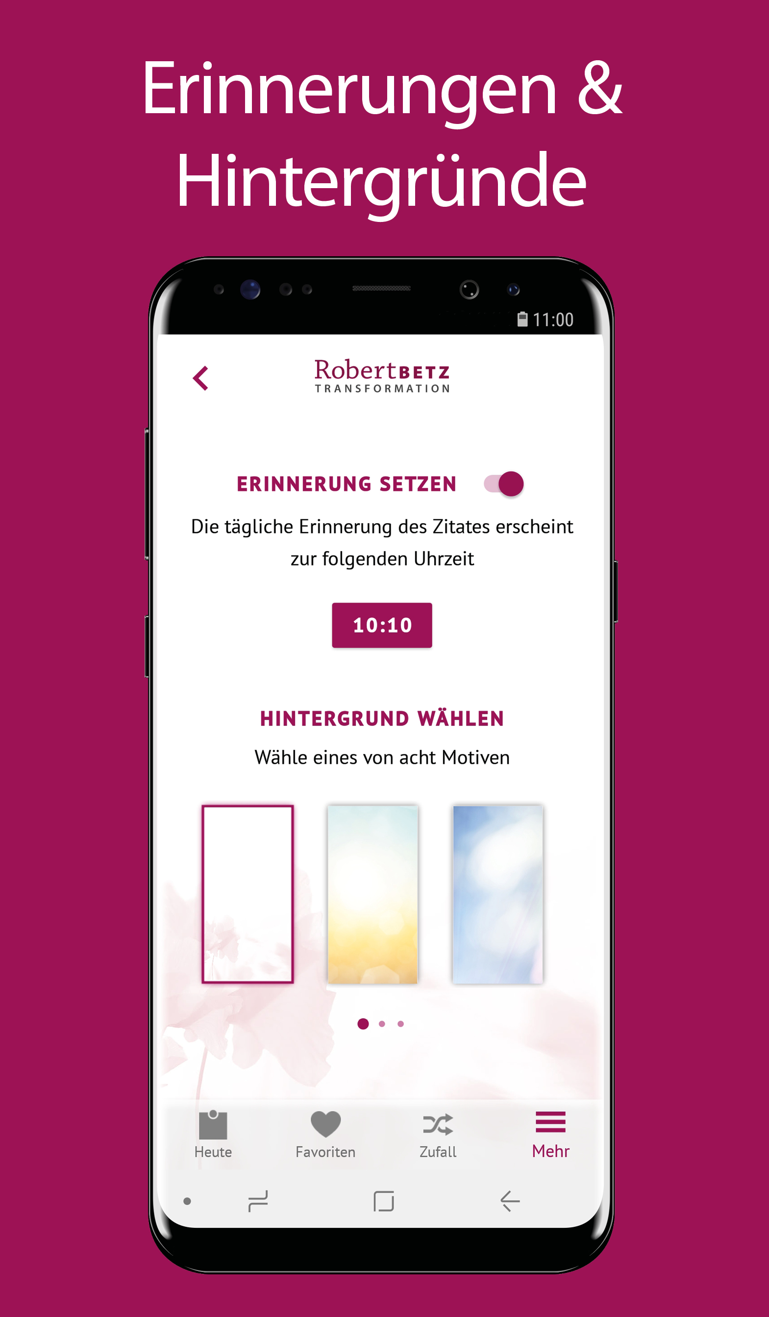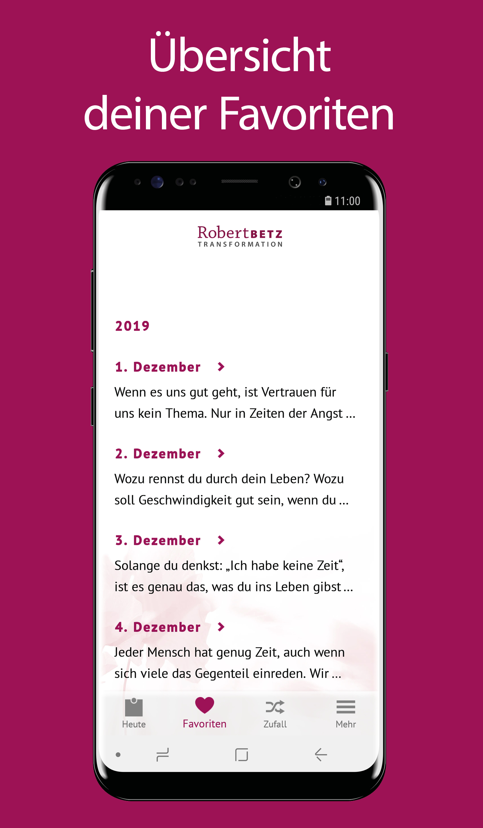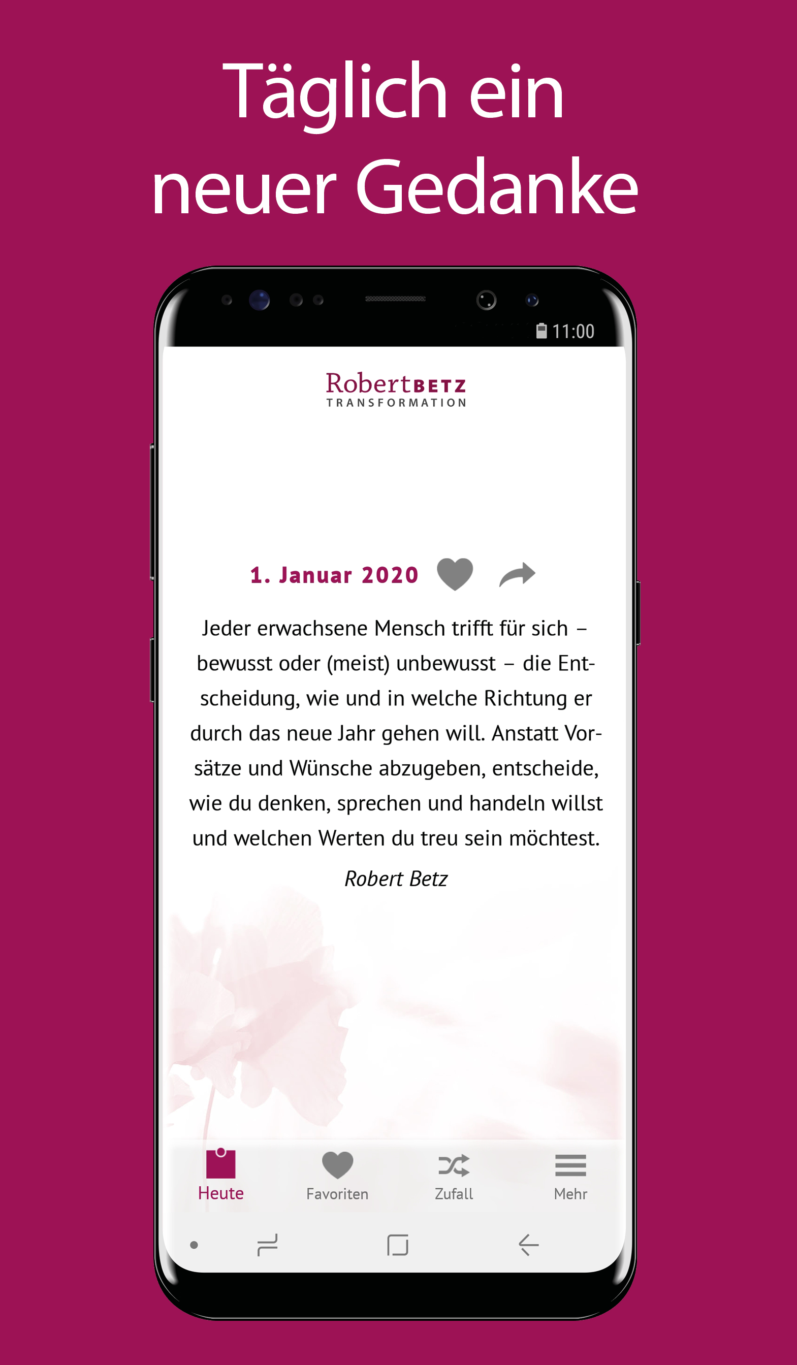 This app contains new quotes every day up to and including December 31, 2022 and will be replaced from January 1, 2023 by a new app ("My thought for the day - Robert Betz") with a subscription function. From this point on, no more new quotes will be imported into this app. However, the app can continue to be used in the future with all quotes provided up to this point (e.g. display of past quotes via the random function). With our thoughts we create our feelings as well as our entire life reality, for us alone and in every community. However, our subconscious is full of untrue thoughts that distort reality. What you think of yourself is how others treat you. What you think about life is revealed to you. What you think about your fellow human beings, they confirm to you like a mirror. In this app you will receive a thought every day that you can put at the beginning of your day like a mental "locomotive". He can push, shake and inspire you on the way from "normal" to happy people. The Robert Betz app offers you the following functions at a glance: • Be inspired daily by a thought for the day by Robert Betz • Set a time to display the daily thought with a reminder • Mark individual favorites and have them displayed in an overview • Let yourself be surprised by a random thought with the random function • Share individual thoughts with friends • Switch between different background themes • Find out more about Robert Betz and his work The quotes in this app help you to lead you from unconsciousness to awareness, from ambiguity and confusion to clarity, from strife to peace, from bondage to freedom and from fear to love. Thoughts are infinitely powerful. Receive them with love and when your heart tells you, "Yes, that's right!" then live the thoughts. This will change your quality of life in an amazingly short time. Live the change, be the change yourself.
