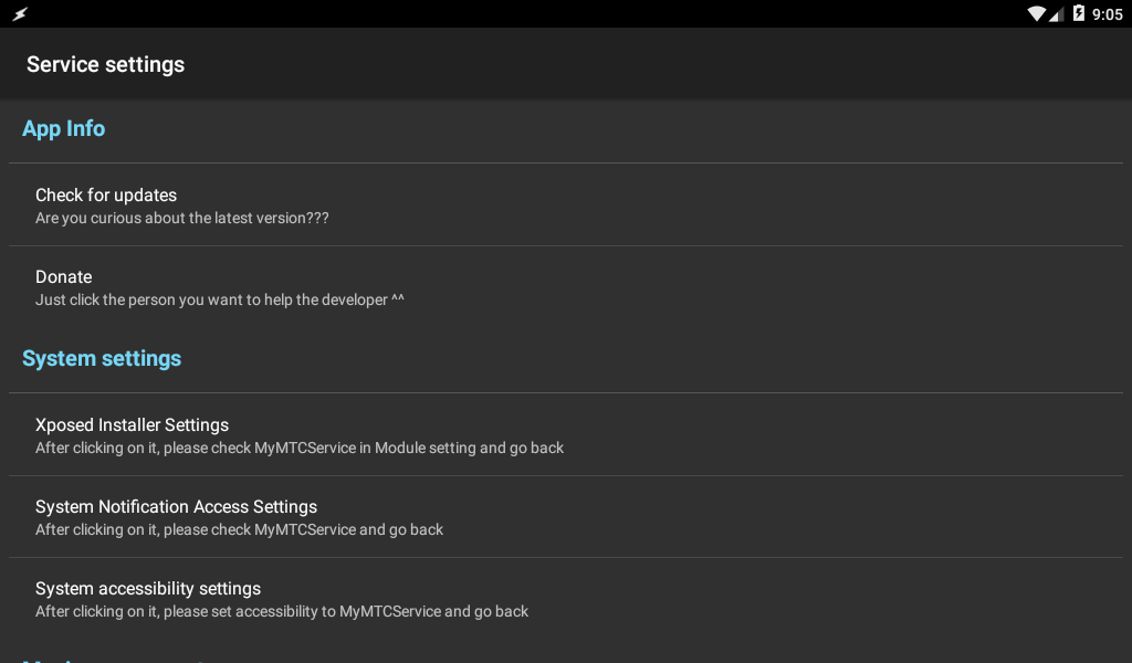 In the Android All-in-One Unit using the RockChip CPU (RK3188 / PX3 / PX5 / PX6), using the steering wheel remote control This app is designed to help you control your system easily and help you to drive safely. (*) Before MyMTCService was released, You can download a new firmware ROM settings.ini here - https://drive.google.com/open?id=1IuF_zlz4kicJlT6iYWGiG3hJ6-KZUPje 1) copy to /sdcard/mymtcservice/settings/ 2) Settings -> System settings -> Select ROM settings File (*) Function list 1. Use the remote control to control the start / next / previous / pause / stop commands for the music program. - The following players are controlled by dedicated commands. (Will be added on a continuous basis upon request.) => JetAudio(plus), PowerAMP - Other players can be controlled using media signals. - It is possible to play instantly with the remote control handle as a representative player designation. (Apps with some unsupported apps can only run) 2. It shows the playback information about the music being played by using the floating widget. - You can open the player by double-click. - Player support for most standard music information - It also supports the radio frequency information being played. - Default music players are supported if xposed-mtc-music is installed. (android 4.4) 3. You can run / switch frequently used apps with handle remote control by providing favorite list function using pop-up window. - Pop up / move forward with MODE key - Move to front / back with volume key, selectable with MUTE key 4. Volume control function and replace the volume bar. - Volume control at boot - Circular volume bar for volume control (RED, BLUE, GREEN theme selection applied) 5. Screen brightness control - Control screen brightness at boot - Use the sunrise / sunset times to automatically control screen brightness. - Automatic screen brightness control for rear camera operation (*) Especially when you set the screen dark at night, the rear camera is also dark. 6. Automatically launch the navigation app - Network connection (WIFI or 3G) automatically executes the navigation program. (Since it can not be used normally if the network is not connected) 7. When the last program executed at boot time - This will remove some of the inconvenient features you know only those who have used it. 8. Front camera automatic switching function - Displays the front camera for 10 seconds after using the rear camera with the AV-IN function. 9. Added OBD connection function (function in xposed-mtc-manager) - Thank you MVG-V70 (*) System Requirements 1. It works only with some custom ROMs. (Such as Malaysk and Hak9k) 2. Requires root authority. (Required for controlling some music programs) 3. Supports Android 4.x, 5.x, 6.x, 7.x, 8.x,9.x 4. Only devices with MCU version MTC series (MTCB / MTCC / MTCD / MTCE) are available. 5. Xposed Installer must be installed. 6. Notification access must be enabled. 7. Use Location Services. (Used for brightness control according to sunrise / sunset time) 8. Accessibility rights must be set. (*) Basic button interlock function 1. NEXT / PREVIOUS: Move to next / previous music songs, Act as channel flipping on genuine radio, Auto play / play music (if no apps work) 2. VOL UP / DOWN: Volume up / down control, forward / back in favorite window 3. Mode (MODE): Run your favorite app and move forward 4. MUTE: Music / Radio pause (*) Required privilege - INTERNET: Use to check the network availability. - SYSTEM_ALERT_WINDOW: Use to display favorite, music playback information. - Accessibility: Control music player - WRITE_SETTINGS : Used to adjust the brightness of the screen. - ACCESS_FINE_LOCATION: Use to find the sunrise / sunset time. - WRITE_EXTERNAL_STORAGE: Used to read / write environment setting values - ACCESS_WIFI_STATE / CHANGE_WIFI_STATE : Used to change WIFI configuration.