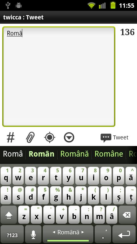 Dictionary plugin for Multiling O Keyboard autocorrect and word prediction Instruction: ⑴ Install this plugin and Multiling O Keyboard. https://play.google.com/store/apps/details?id=kl.ime.oh ⑵ Run O Keyboard and follow its setup guide. ⑶ Slide space bar to switch languages. If you have font issue, read this: http://honsoapps.appspot.com/1/ma.html Wikipedia: Romanian (also known as Daco-Romanian or Moldovan; obsolete spellings Rumanian, Roumanian; autonym: română, limba română [ˈlimba roˈmɨnə], "the Romanian language", or românește, lit. "in Romanian") is a Romance language spoken by around 24 million people as a native language, primarily in Romania and Moldova, and by another 4 million people as a second language.[5][6] It has official status in Romania, the Republic of Moldova, the unrecognized state of Transnistria, and the Autonomous Province of Vojvodina in Serbia. It is one of the official languages of the European Union, the Latin Union, and of the autonomous Mount Athos in Greece.[citation needed] Romanian speakers are scattered across many other countries, notably Australia, Italy, Spain, Ukraine, Bulgaria, the United States, Canada, Argentina, Israel, Russia, Portugal, the United Kingdom, France, and Germany