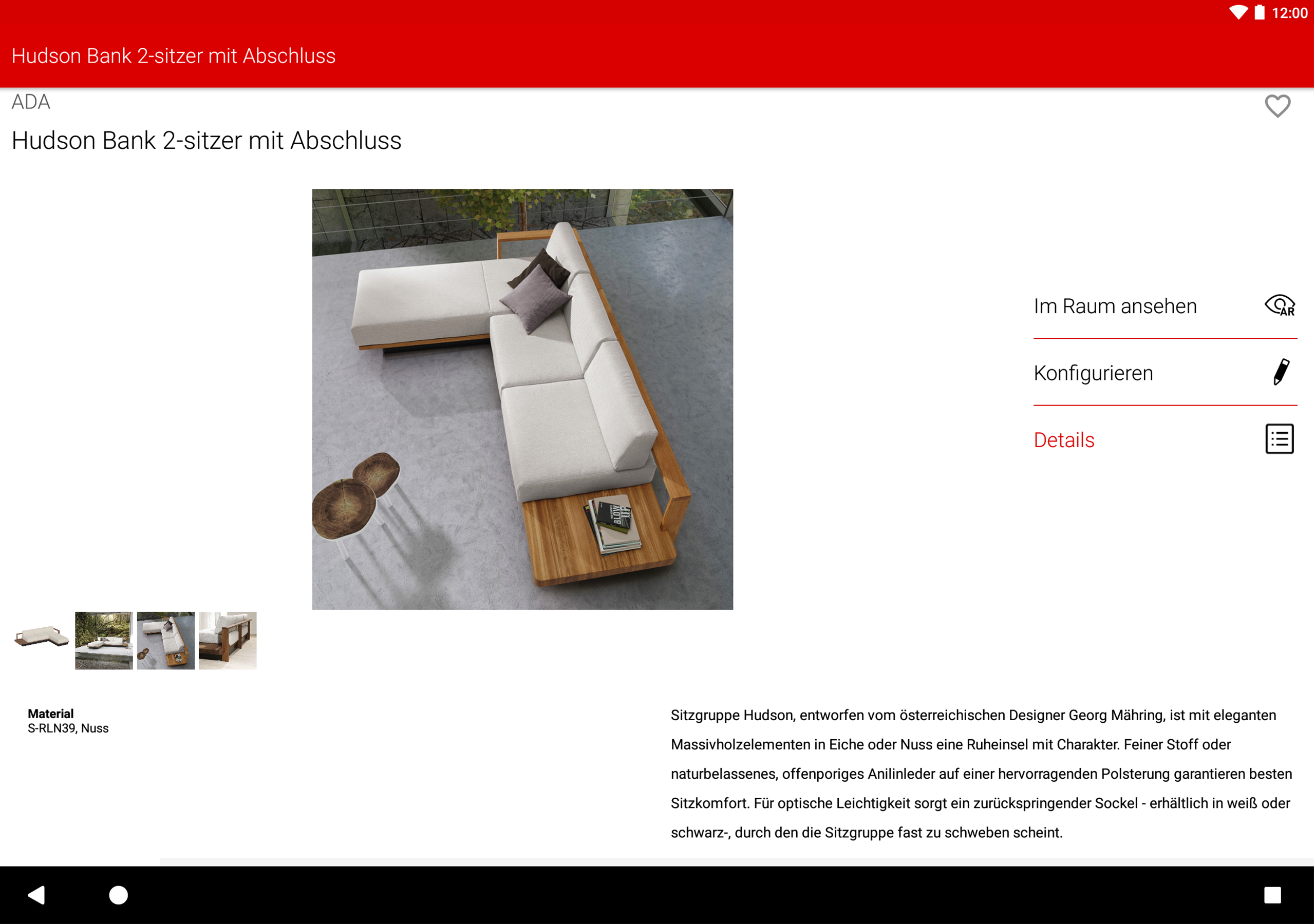 Furniture can be selected and viewed live in Augmented Reality in your room. Latest technology makes it possible to look at the selected furniture from every perspective and position - from below, above, from the side and with shadows.