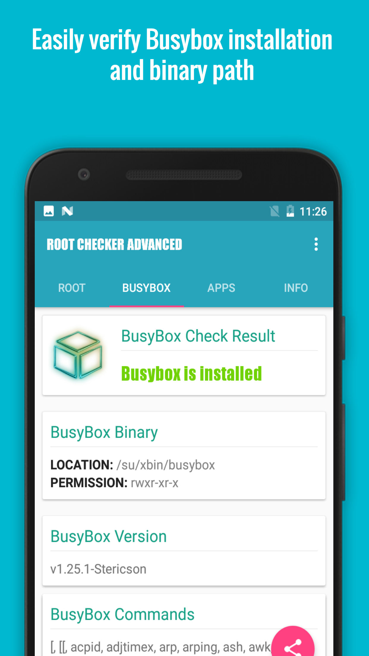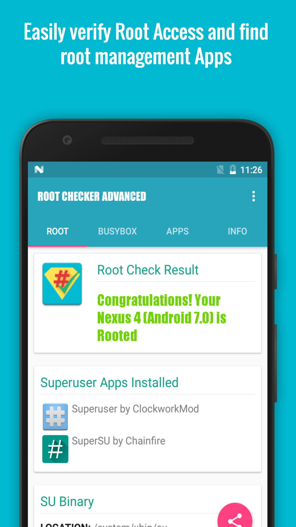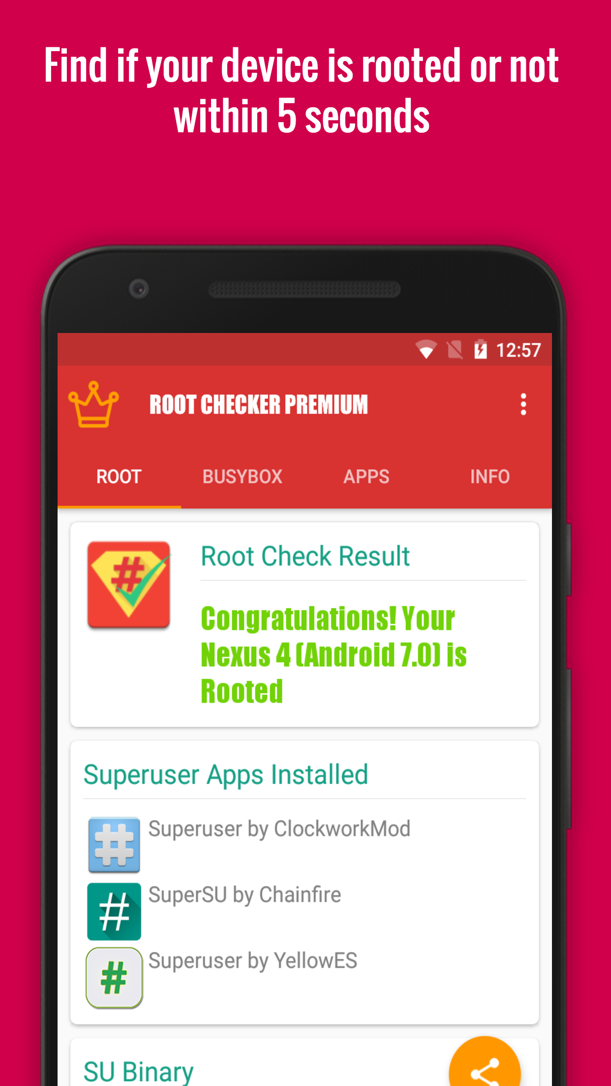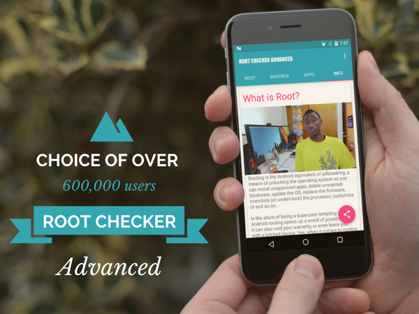 ATTENTION: THIS APP WILL NOT ROOT YOUR PHONE, IT JUST HELPS YOU TO CHECK ROOT STATUS OF YOUR ANDROID DEVICE!! Root Checker Advanced gives you an easy way to know if you have Root (Superuser or supersu) properly setup and installed in your Android Device. Aside from root check, It also lets you check busybox installation and applets. Root Checker shows you the system paths for both Superuser and busybox binaries. All the superuser apps like Kingroot, SuperUser, SuperSu are inherently supported. Get Pro Version at 50% off https://play.google.com/store/apps/details?id=com.advanced.rootchecker.pro Root Checker Advanced give you an easy explanation of what is Root and what is Busybox.The app has been updated with Material design and supports Root and Busybox detection in Android Nougat, Marshmallow, Lollipop, Icecream Sandwich, Jellybean, Gingerbread and even froyo If you have any doubts regarding root like What is Root? What is BusyBox? How to root my phone? How to Root Check? All the questions will be answered in the application. Also, if you have any question's that you want to know but are not there in Info, It's very easy, download the application, go to Info Screen, Scroll down to the bottom and select the yellow FAQ card, now you send us a question regarding Root and we'll answer it within 2 days. KEY FEATURES - Offline Busybox Installer - Get Root Check results - Verify Busybox installation - Check if any superuser app like SuperSU, SuperUser or Kingroot is installed - Find su binary location - Find busybox binary location - Find SELinux status - Check Build Info like Device Name, brand name, hardware, model, cpu etc DO YOU WANT MORE INFORMATION ABOUT ROOT AND BUSYBOX IN YOUR PHONE? Buy PRO (Root Checker Advanced Premium) for only 1.99$. Paid version unlocks these features: -Offline Busybox installer -More Root Information -Fastest Root Check -More Busybox Information -Better experience -Find the best root apps -Get Premium Updates -No Ads HOW CAN I ROOT MY ANDROID PHONE? If you are finding how to root your phone, try to search in Google or XDA-Developers forum, there are lots of useful guides to root your Android phone. The model that you need to follow to find a good guide is something like that: "How to Root" + Phone Name For example, if I have a Samsung Galaxy Mini, you will search --> How to Root Galaxy Mini, and if you don't find it I can add more information ---> How to Root Galaxy Mini S5570I. Easy, right? Some popular developer forums which provide info on how to root android List of suggested Forums : http://www.xda-developers.com http://www.androidcentral.com http://www.modaco.com Coming with Material design, Root Checker Advanced is the best app to Check Root in you android. It is small, fast and gets the job done. See your Root results within 5 seconds. Don't bother trying other apps, this is the real deal!