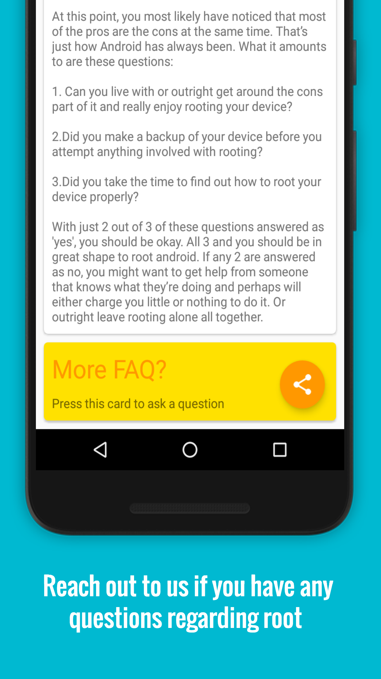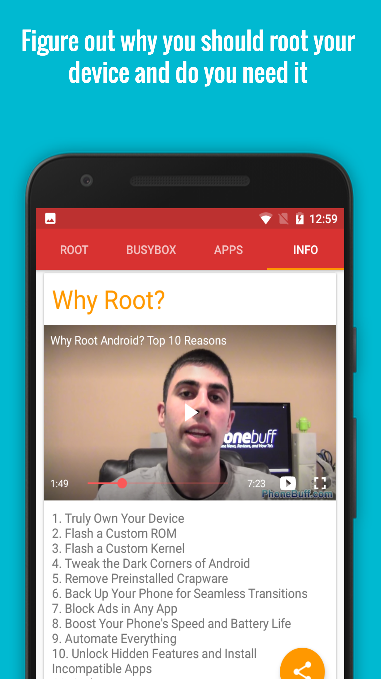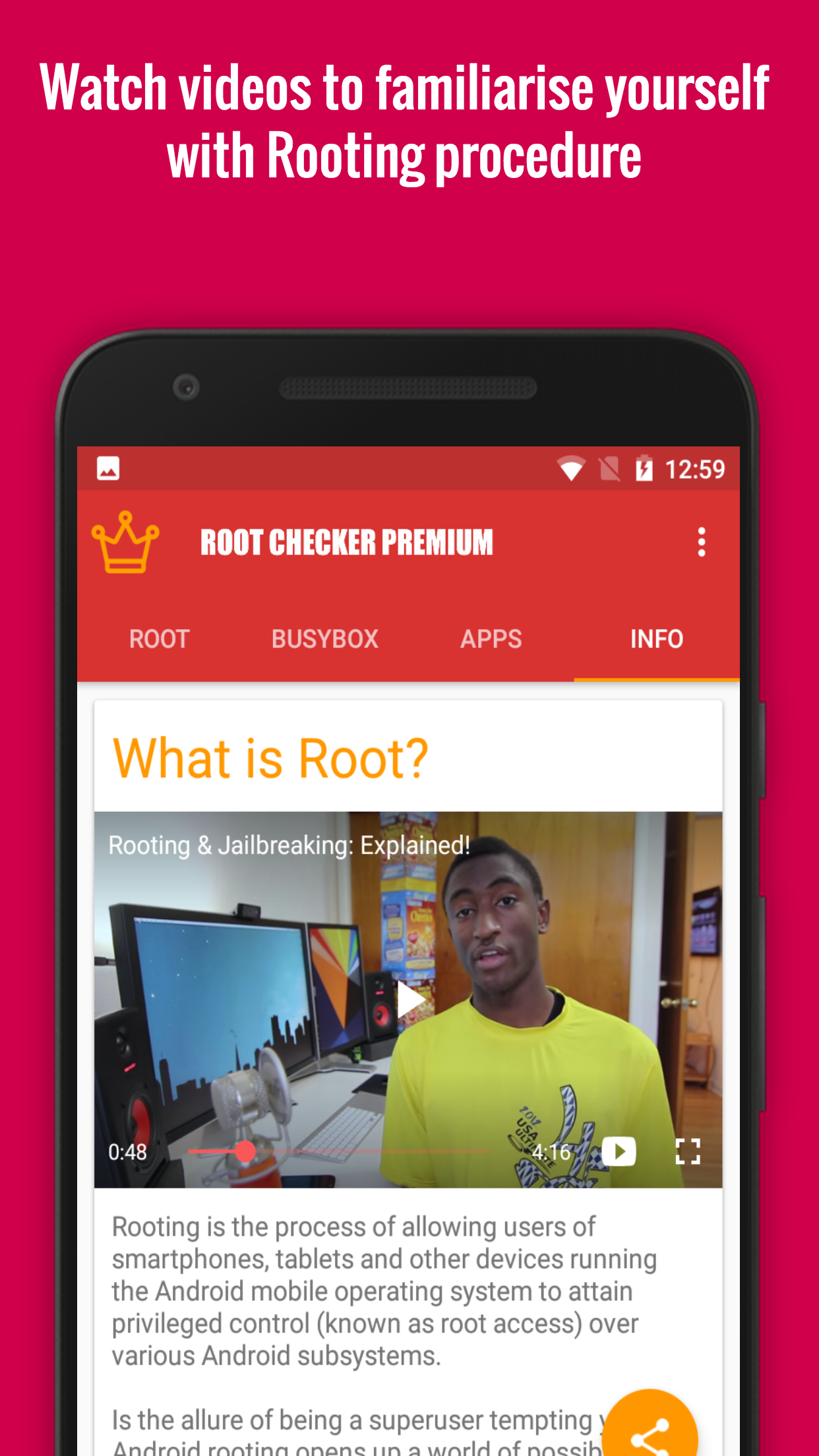 ATTENTION: THIS APP WILL NOT ROOT YOUR PHONE, IT JUST HELPS YOU TO CHECK ROOT STATUS OF YOUR ANDROID DEVICE!! Root Checker Advanced gives you an easy way to know if you have Root (Superuser or supersu) properly setup and installed in your Android Device. Aside from root check, It also lets you check busybox installation and applets. Root Checker shows you the system paths for both Superuser and busybox binaries. All the superuser apps like Kingroot, SuperUser, SuperSu are inherently supported. Get Pro Version at 50% off https://play.google.com/store/apps/details?id=com.advanced.rootchecker.pro Root Checker Advanced give you an easy explanation of what is Root and what is Busybox.The app has been updated with Material design and supports Root and Busybox detection in Android Nougat, Marshmallow, Lollipop, Icecream Sandwich, Jellybean, Gingerbread and even froyo If you have any doubts regarding root like What is Root? What is BusyBox? How to root my phone? How to Root Check? All the questions will be answered in the application. Also, if you have any question's that you want to know but are not there in Info, It's very easy, download the application, go to Info Screen, Scroll down to the bottom and select the yellow FAQ card, now you send us a question regarding Root and we'll answer it within 2 days. KEY FEATURES - Offline Busybox Installer - Get Root Check results - Verify Busybox installation - Check if any superuser app like SuperSU, SuperUser or Kingroot is installed - Find su binary location - Find busybox binary location - Find SELinux status - Check Build Info like Device Name, brand name, hardware, model, cpu etc DO YOU WANT MORE INFORMATION ABOUT ROOT AND BUSYBOX IN YOUR PHONE? Buy PRO (Root Checker Advanced Premium) for only 1.99$. Paid version unlocks these features: -Offline Busybox installer -More Root Information -Fastest Root Check -More Busybox Information -Better experience -Find the best root apps -Get Premium Updates -No Ads HOW CAN I ROOT MY ANDROID PHONE? If you are finding how to root your phone, try to search in Google or XDA-Developers forum, there are lots of useful guides to root your Android phone. The model that you need to follow to find a good guide is something like that: "How to Root" + Phone Name For example, if I have a Samsung Galaxy Mini, you will search --> How to Root Galaxy Mini, and if you don't find it I can add more information ---> How to Root Galaxy Mini S5570I. Easy, right? Some popular developer forums which provide info on how to root android List of suggested Forums : http://www.xda-developers.com http://www.androidcentral.com http://www.modaco.com Coming with Material design, Root Checker Advanced is the best app to Check Root in you android. It is small, fast and gets the job done. See your Root results within 5 seconds. Don't bother trying other apps, this is the real deal!