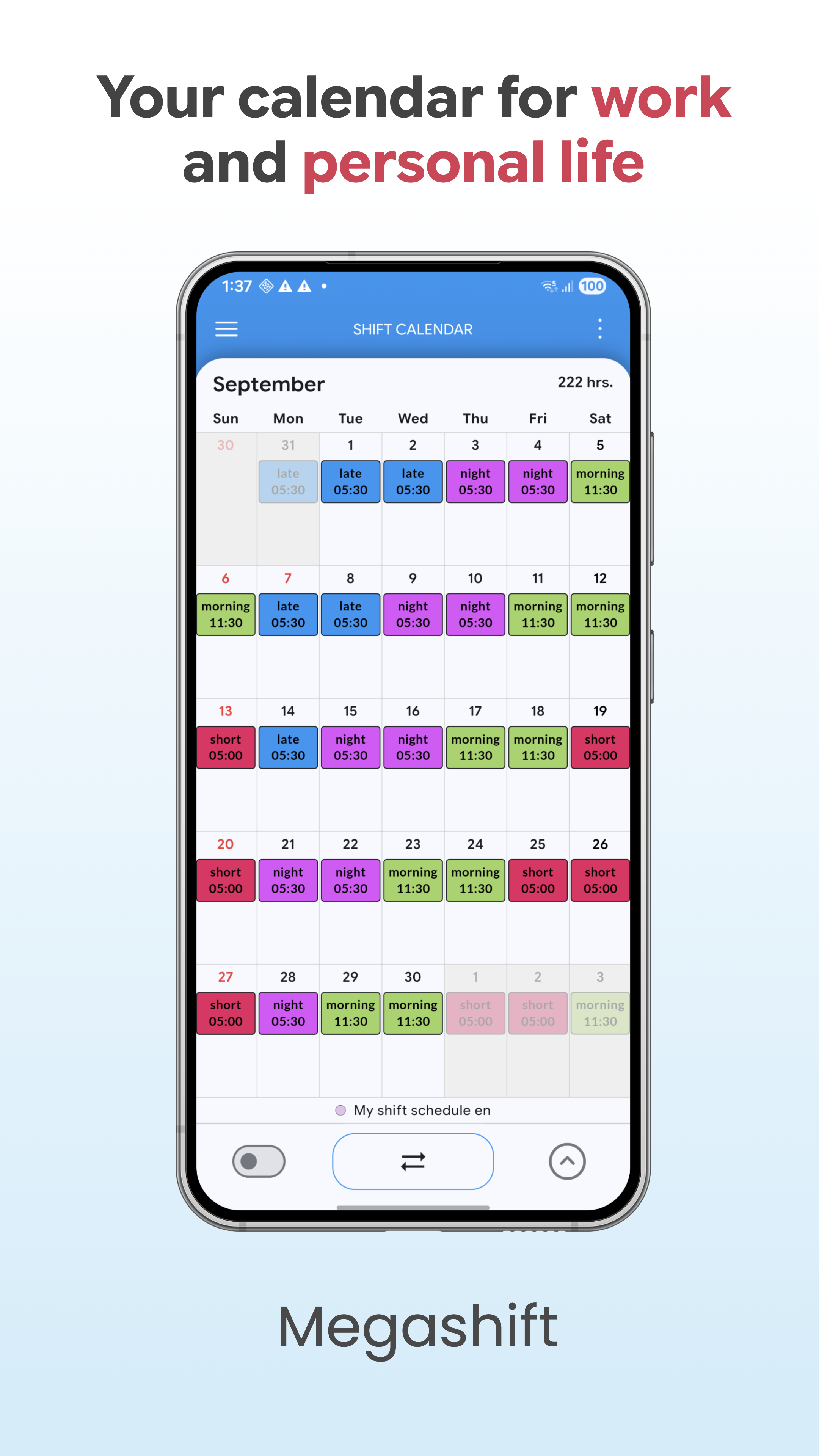 Megashift gives you a clear view of your shifts, work hours, and personal events for effortless day-to-day planning. Plus, it automatically calculates your work hours — no more manual calculations. • CREATE & VISUALIZE YOUR WORK SCHEDULE Create custom shift templates (early, late, night shift, on call, etc.) and easily add them to your shift calendar. The clear interface helps you keep shifts and events in view at all times. • HOURS CALCULATOR Megashift automatically calculates your work hours for entered shifts, no more manual recalculations needed. • STATISTICS See the most important numbers at a glance. Number of shifts and hours worked per shift type (monthly/yearly), work hours per day. Plus, see the distribution of your work time, day/night, on holidays/weekends, overtime. • ROTATING SCHEDULES Save recurring shift sequences (e.g. 2 early • 3 late • 2 night • 5 off) and have them automatically entered for any periods. Ideal for fixed shift plans in nursing, emergency services, police, or production. • SHARE & PRINT (PRO) Create high quality PDFs and share them directly from the app (email, messenger, etc.). Alternatively, you can print the PDFs right away. • CLOUD SYNC & BACKUP (PRO) Automatic backup and synchronisation across all your devices. In case of device switch or loss, your data is immediately available again. • INTEGRATE EXTERNAL CALENDARS (PRO) Seamlessly integrate Google Calendar, Outlook, Apple Calendar & more. Finally, all appointments and shifts, doctor visits, birthdays in one place. WHO IS MEGASHIFT FOR? Megashift is ideal for: • People in shift work (nursing, medicine, emergency services, police, production, retail, gastronomy, etc.) • Freelancers & self-employed with irregular or changing work hours • Anyone looking for a straightforward shift calendar that clearly brings work and private life together ADDITIONAL HIGHLIGHTS • Fully usable offline (no internet connection required) • Dark Mode (ideal for night shifts and easier on the eyes) • Continuous improvements based on real user feedback Megashift is the simple shift calendar app for everyday use, plan your shifts and keep track of your work hours, overtime, and personal events with ease. Download now for free and try it out right away!