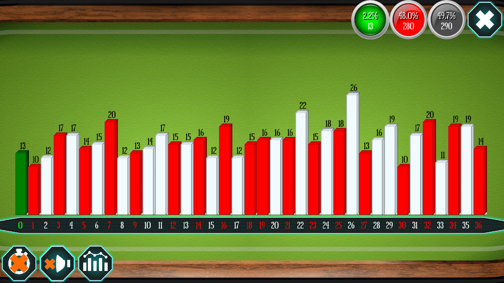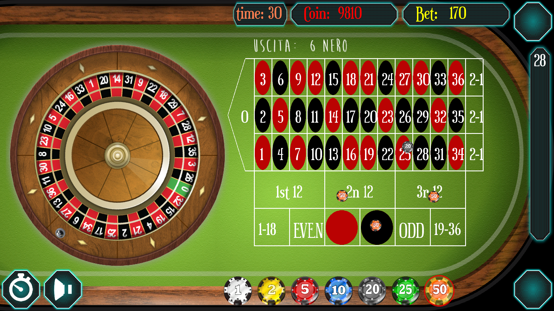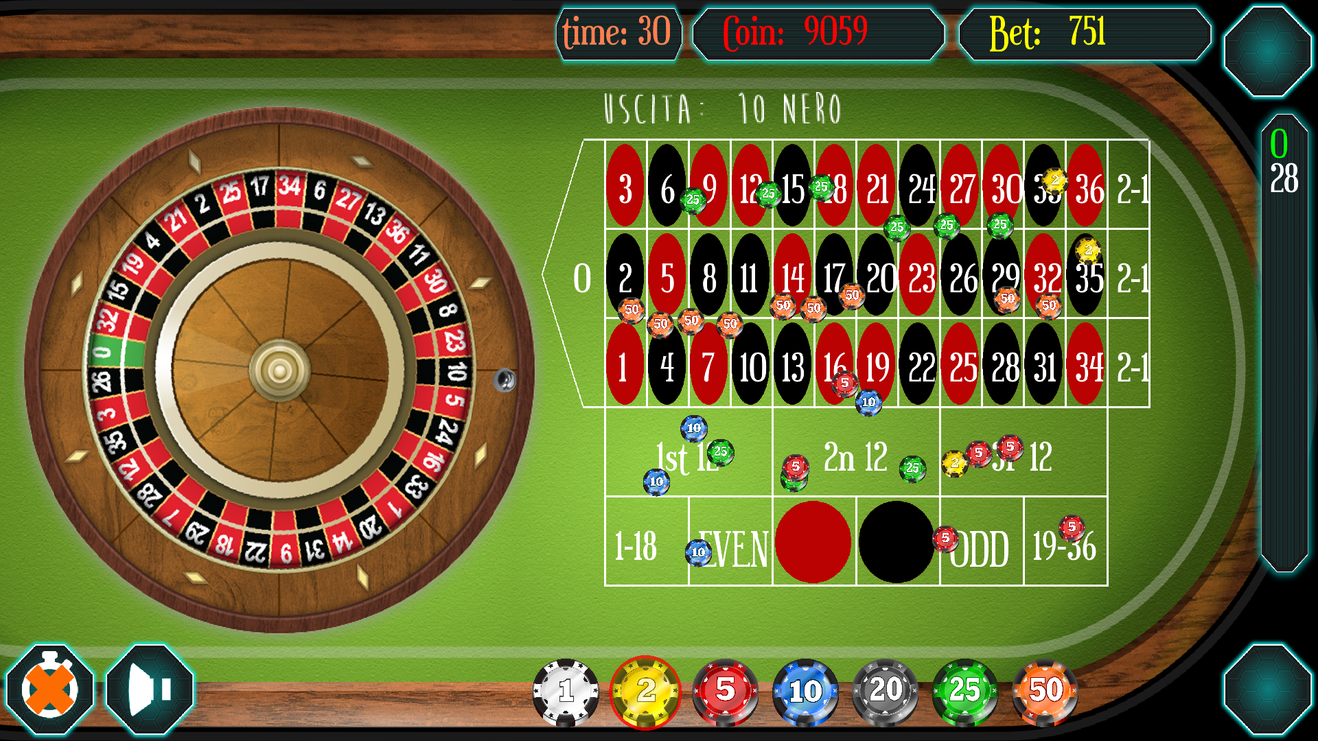 Join them with this free roulette and test the various systems in order to train the mind to try to win. The game is completely free. Access are 10,000 free coin data, if it gets to zero coin just exit the application and return to get back another 10,000 credits to play on roulette. The classic game of Roulette English. The wheel is split up the numbers from 0 to 36, in the English roulette is not worth the en prison rule bets: - Plein, individual numbers in which, if you win, you win 35 times the amount bet - Cheval, horses, or pairs of numbers in which, if you win, you win 17 times the amount bet - Transversal Pleine, triplets where, if you win, you win 11 times the amount bet - Carré, quatrains where, if you win, you win 8 times the amount bet - Transversale Simple, sextuplets where, if you win, you win 5 times the amount bet - Douzaine, dozens (first, second or third) in which, if you win, you win 2 times the amount bet - Columns, columns (first, second or third column of the table) in which, if you win, you win 2 times the amount bet Simple bets: - Pair Impair ou, or even Even or Odd, or even or odd numbers - Manque ou Passe, ie the numbers from 1 to 18, or those 19 to 36 - Rouge ou Noir or red numbers or blacks Functionality: Historicizing the last 10 numbers come out on roulette with the color display and number, Ability to undo the last bet made with the appropriate button at the top right or re-aim the last bet made. The system every 30 seconds performs a spin of roulette, which can be turned off using the bottom button on the left.