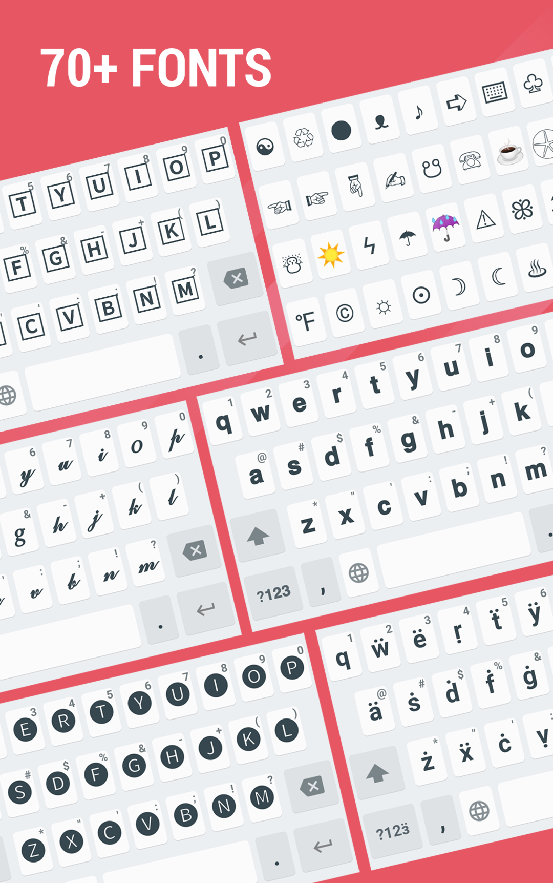Персонализируйте модную клавиатуру с помощью красивых бесплатных тем для клавиатуры, включите или отключите текстовые предложения и предсказания на шрифты клавиатура. Скрывайте или показывайте клавиатура со скорописью, клавиатура с курсивом, клавиатура с жирным текстом и любые другие клавиатура.