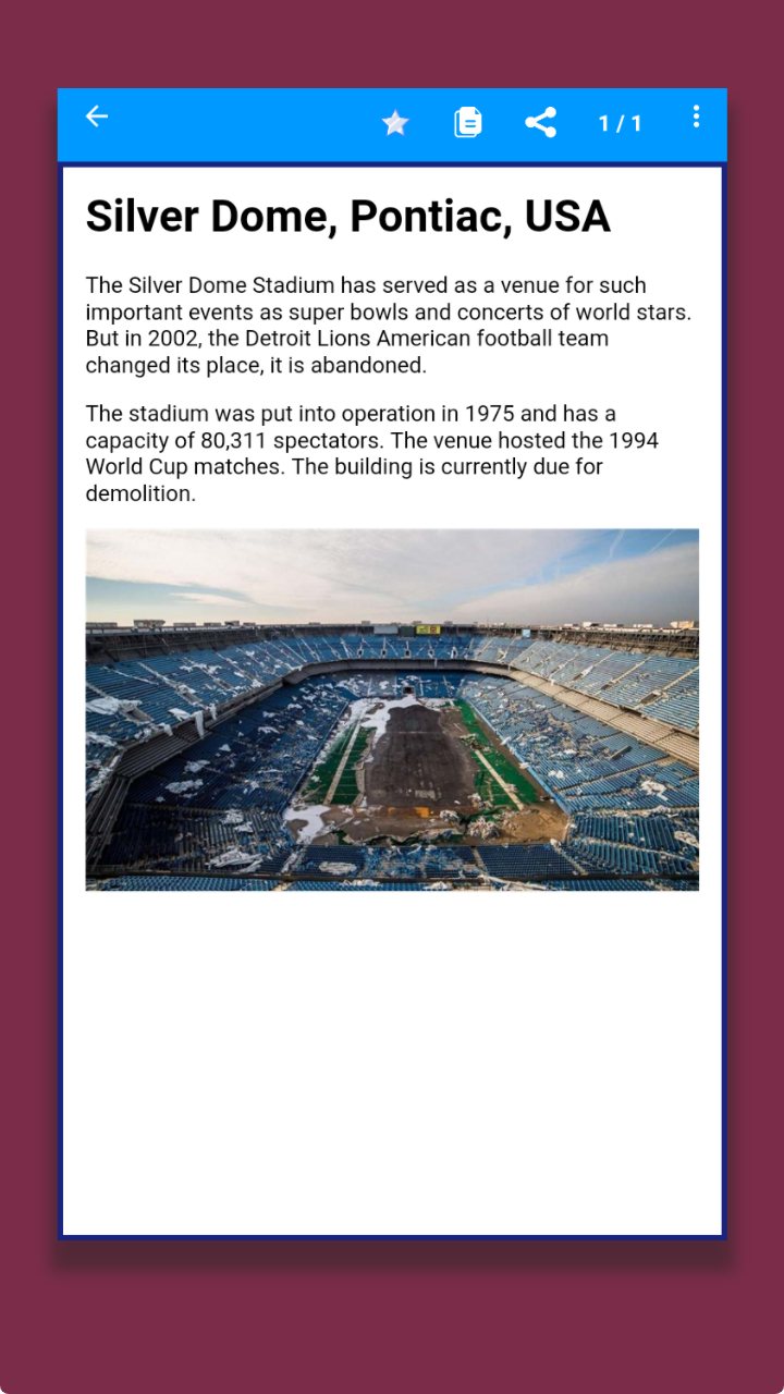 Приложение "Заброшенные места" позволит вам увидеть удивительные и заброшенные места по всему миру. Заброшенные дома, поезда, машины, больницы, деревни, гаражи, города, здания, земли, психбольницы и школы – вы увидите их все в приложении. С помощью этого приложения вы сможете открыть для себя мир заброшенных мест и проникнуться их историей. Вы сможете исследовать заброшенные машины в лесу, заброшенные больницы, заброшенные деревни, заброшенные гаражи, заброшенные города, заброшенные здания, заброшенные земли, заброшенные психбольницы и заброшенные школы. Вы увидите заброшенные места во всех уголках мира. С помощью этого приложения вы сможете открыть для себя мир заброшенных мест и проникнуться их историей. Приложение поможет вам найти заброшенные места в любой точке мира. Откройте для себя неисследованный мир заброшенных мест. Находите заброшенные дома, поезда, машины, больницы, деревни, гаражи, города, здания, земли, психбольницы и школы, и проникайтесь их историей. Наслаждайтесь путешествиями по заброшенным местам с приложением "Заброшенные места". Скачайте и погрузитесь в мир заброшенных мест! Сочетание тайны и опасности вызывает интерес и против воли притягивает внимание, а вид природы, которая спокойно захватывает созданное людьми, возвращает нас к пониманию собственной ничтожности перед лицом времени. Предлагаем вам посмотреть на самые красивые заброшенные места в мире. Статуи, дома, целые города и деревни, где уже давно не ступала нога человека. Подобных мест на нашей планете довольно много. Здесь не живут люди, и природа понемногу начала заявлять права на эти постройки. Мир полон заброшенных мест, каждое из которых имеет свою историю. Согласись, есть в них что-то особенное, и это что-то заставляет нас обходить их стороной. Тем не менее, человеческому любопытству нет предела, поэтому мы подготовили подборку мест, смотреть на которые жутковато, но интересно.