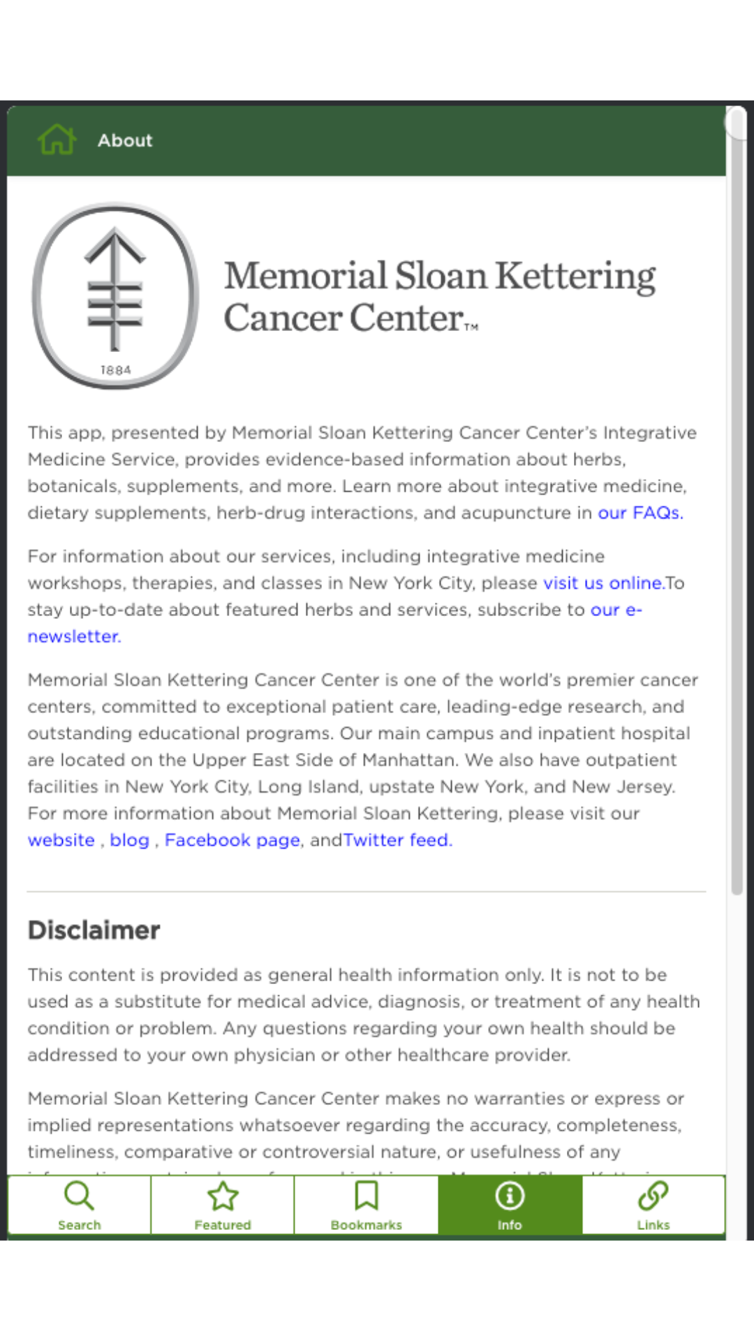 Информация о травах представлена Службой интегративной медицины Мемориала Слоана Кеттеринга. Ключевая особенность: • 290 записей о травах, растительных препаратах и добавках с предполагаемой пользой, побочными эффектами, взаимодействием с лекарствами и т. д. • Объективная информация, подкрепленная научными ссылками • Отформатировано как для медицинских работников, так и для потребителей • Поиск по травам или добавкам • Сохраняйте избранное для доступа в автономном режиме или для обсуждения с врачом для безопасного использования. • Ознакомьтесь с рекомендуемыми продуктами и услугами. • Обновляется еженедельно • Оригинальные художественные визуализации Memorial Sloan Kettering — один из лучших в мире онкологических центров, предлагающий исключительный уход за пациентами, передовые исследования и выдающиеся образовательные программы. В этом приложении наша служба интегративной медицины под руководством фармацевта и эксперта по ботанике предоставляет исчерпывающую и объективную информацию о травах, растительных препаратах и добавках, а также ссылки, которые обучают доказательствам интегративной терапии и программ, предлагаемых нашей интегративной службой. Медицинская служба. Медицинское раскрытие информации Этот контент предоставляется только в качестве общей информации о здоровье. Его нельзя использовать в качестве замены медицинской консультации, диагностики или лечения какого-либо состояния или проблемы со здоровьем. Любые вопросы, касающиеся вашего собственного здоровья, должны быть адресованы вашему лечащему врачу или другому поставщику медицинских услуг. Онкологический центр Memorial Sloan Kettering не дает никаких гарантий или явных или подразумеваемых заявлений относительно точности, полноты, своевременности, сравнительного или противоречивого характера или полезности любой информации, содержащейся или упоминаемой в этом приложении. Memorial Sloan Kettering не принимает на себя никаких рисков, связанных с использованием вами содержащейся здесь информации. Информация, связанная со здоровьем, часто меняется, поэтому приведенная выше информация может быть устаревшей, неполной или неверной. Заявления, сделанные о продуктах, не были оценены Управлением по санитарному надзору за качеством пищевых продуктов и медикаментов США. Настоящим вам рекомендуется проконсультироваться с врачом или другим профессиональным поставщиком медицинских услуг, прежде чем принимать какие-либо решения или предпринимать какие-либо действия или не предпринимать никаких действий, связанных с какой-либо медицинской проблемой или проблемой, которая может возникнуть у вас в любое время, сейчас или в будущем. . Используя эту информацию, вы соглашаетесь с тем, что ни Memorial Sloan Kettering, ни какая-либо другая сторона не несут и не будут нести иной ответственности за любое принятое решение или любое предпринятое действие или любое действие, не предпринятое в связи с использованием вами какой-либо информации, представленной здесь.