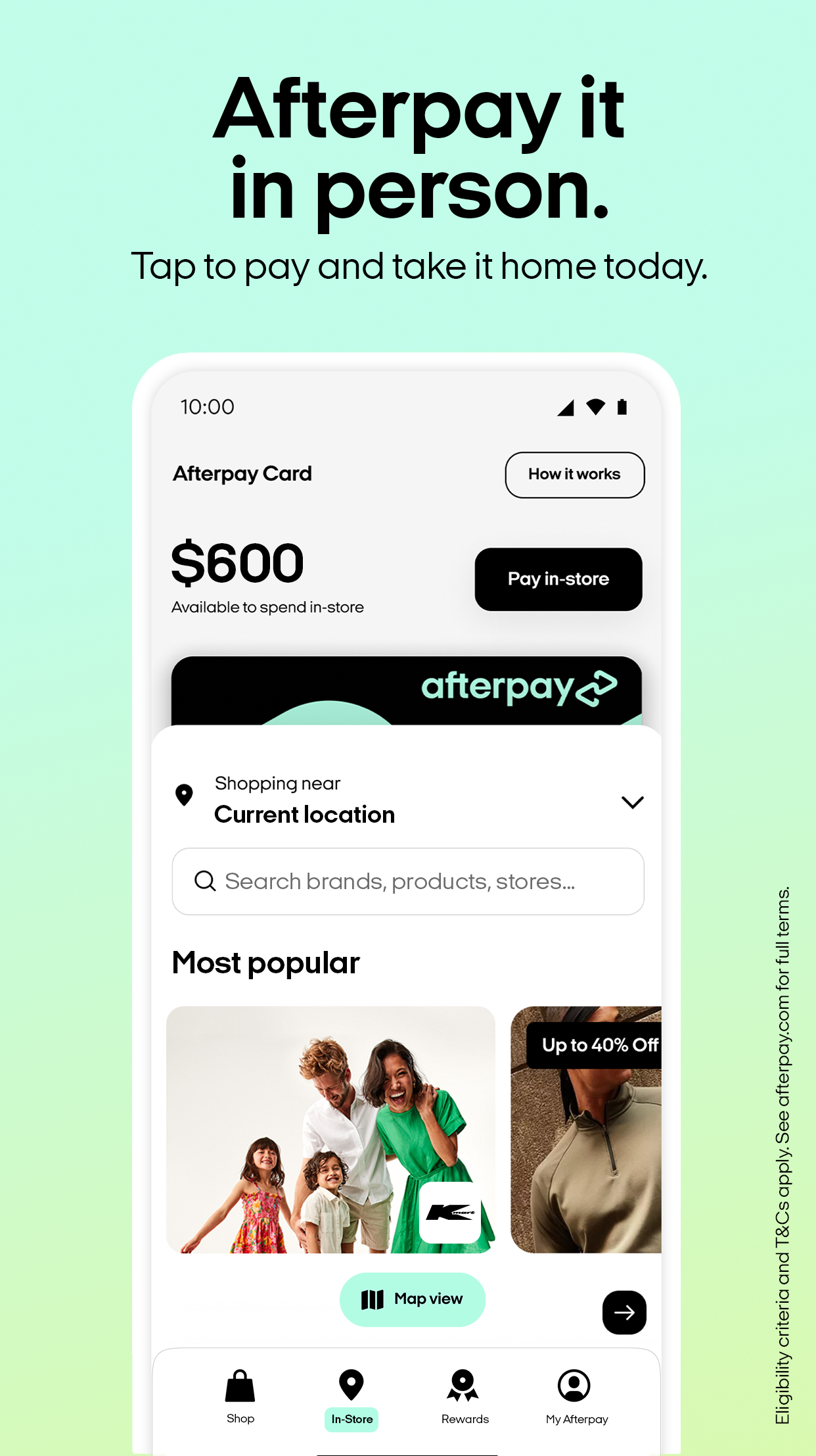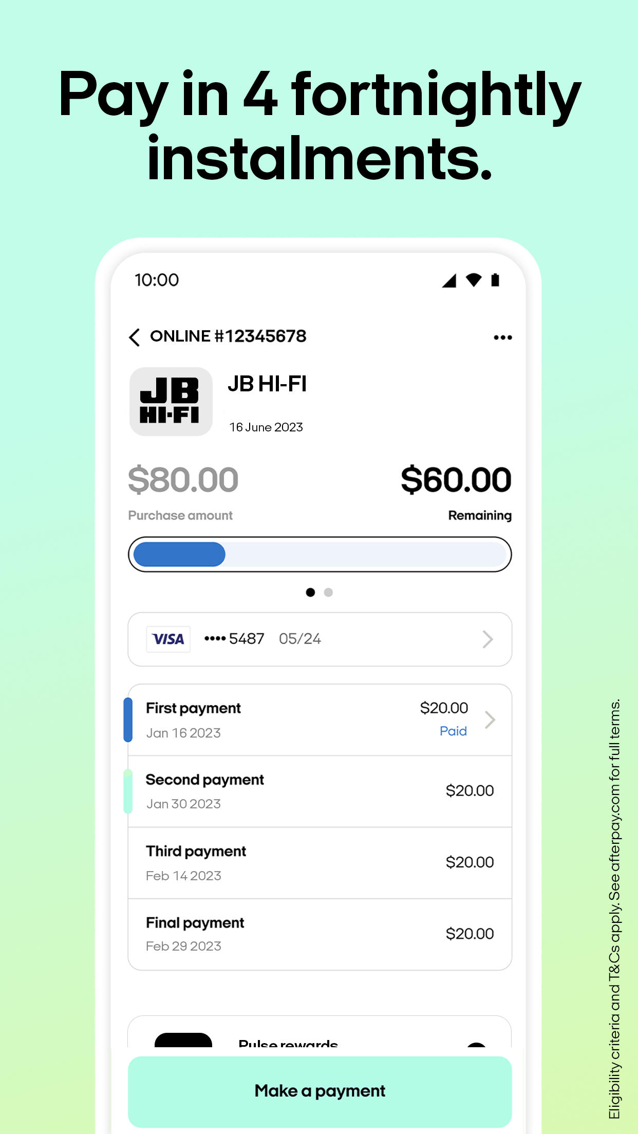 Не вносите полную предоплату, оплатите после! Загрузите приложение Afterpay, чтобы купить сейчас и оплатить четырьмя беспроцентными платежами в течение 6 недель. ВСЕ НАЧИНАЕТСЯ С ПРИЛОЖЕНИЯ: Быстрая настройка аккаунта. • Настройте учетную запись менее чем за 5 минут с нашим мгновенным решением об утверждении. Лимиты расходов начинаются примерно с 600 долларов. • Мы все об ответственных расходах; наши разумные лимиты расходов увеличиваются с вашими своевременными платежами. Совершайте покупки прямо в приложении или коснитесь для оплаты в магазине. • Возьмите его домой сегодня и заплатите в 4 раза за моду, путешествия, медицину, автомобили, развлечения и многое другое. Широко распространен в магазинах и сервисах по всей стране. Любить это. Люби это. • Приложение — ваш лучший друг для покупок. Ищите то, что вам нужно, создавайте свои списки пожеланий, рассчитайте свой бюджет и легко находите все лучшие предложения от ведущих брендов. Управляйте своими платежами. • Проверяйте лимит расходов, управляйте своими заказами и отслеживайте даты и суммы платежей. Наблюдайте, как складываются эти награды. • Присоединяйтесь к программе Pulse Rewards и отслеживайте свои успехи в получении доступа к эксклюзивным преимуществам и предложениям при своевременной оплате.