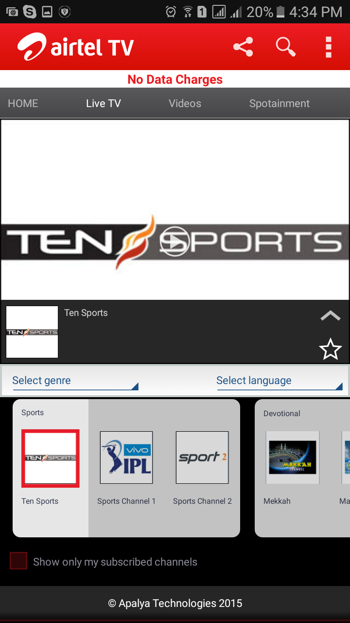 An Airtel mobile data connection is required to use Airtel TV service. Free viewing minutes without data charge is available based on subscribed pack.