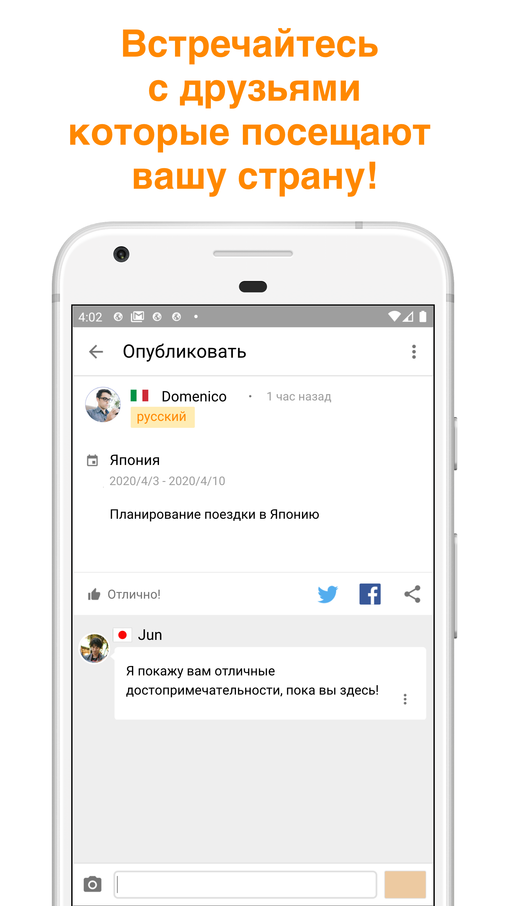 O Airtripp é um SNS que permite que você se conecte com amigos estrangeiros de países para os quais você gostaria de viajar através do compartilhamento de fotos e comunicação. Com o suporte de chat traduzido automático, você facilmente fará amigos internacionais com pessoas de mais de 250 países e regiões sem se preocupar com a barreira do idioma!